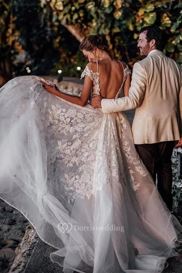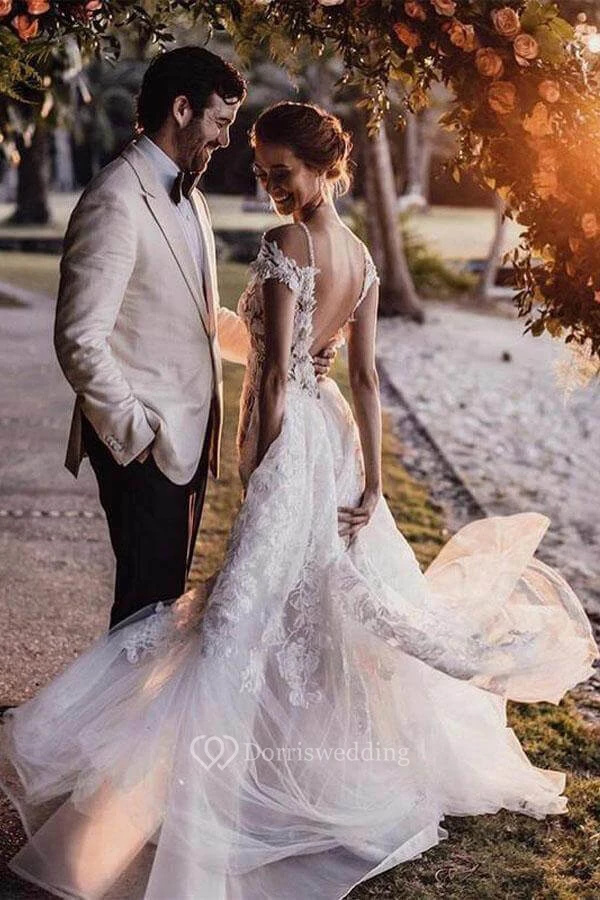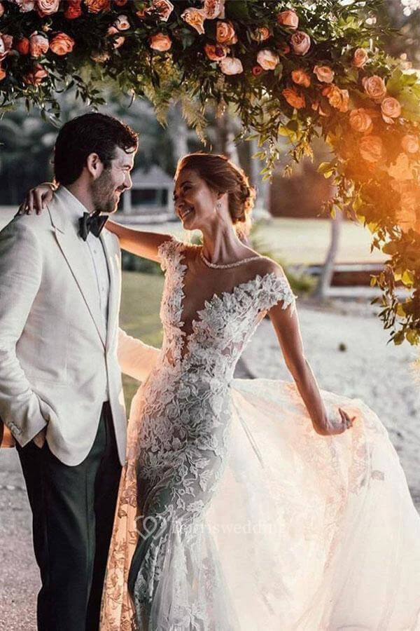 Plunged Cap Scoop-neck Applique Mermaid Exquisite Backless Wedding Dress