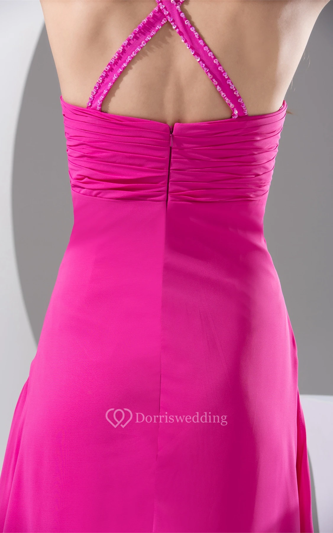 Plunged Chiffon Floor-Length Criss-Cross Broach and Dress With Beading