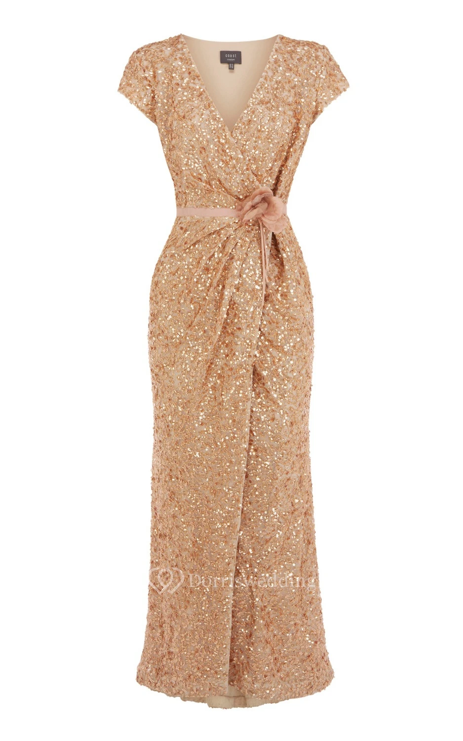 Plunged Front-Split Short Sleeve Dress With Sequins