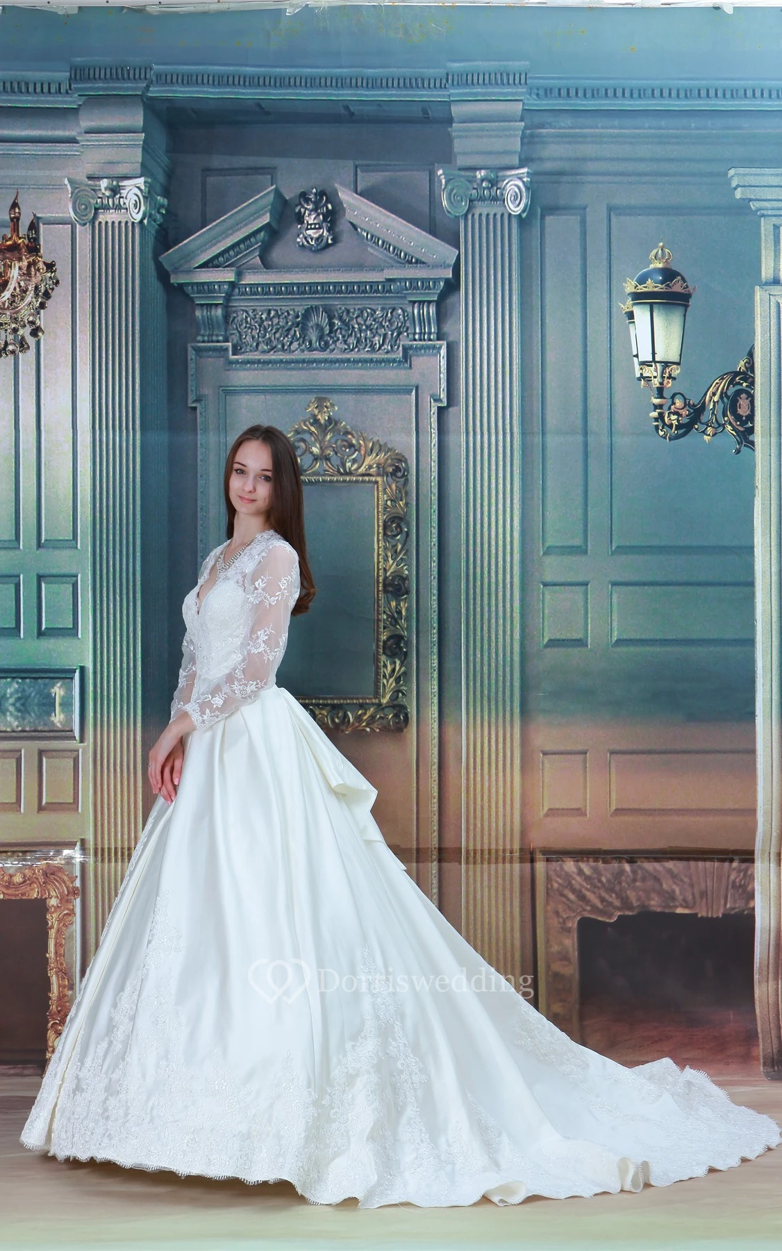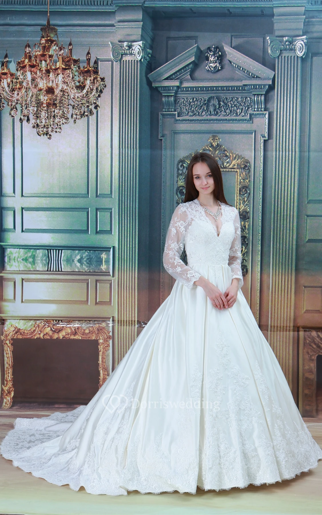 Plunged Lace Long-Sleeve Illusion and Ball-Gown With Beading