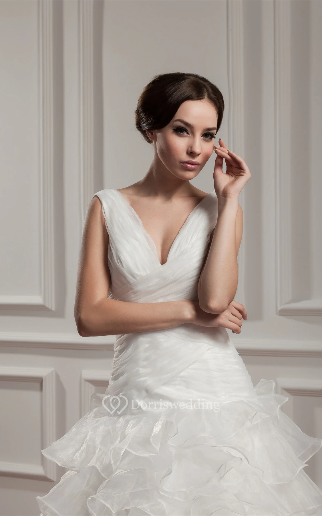 Plunged Ruffled Sleeveless Court Train and Gown With Tiers