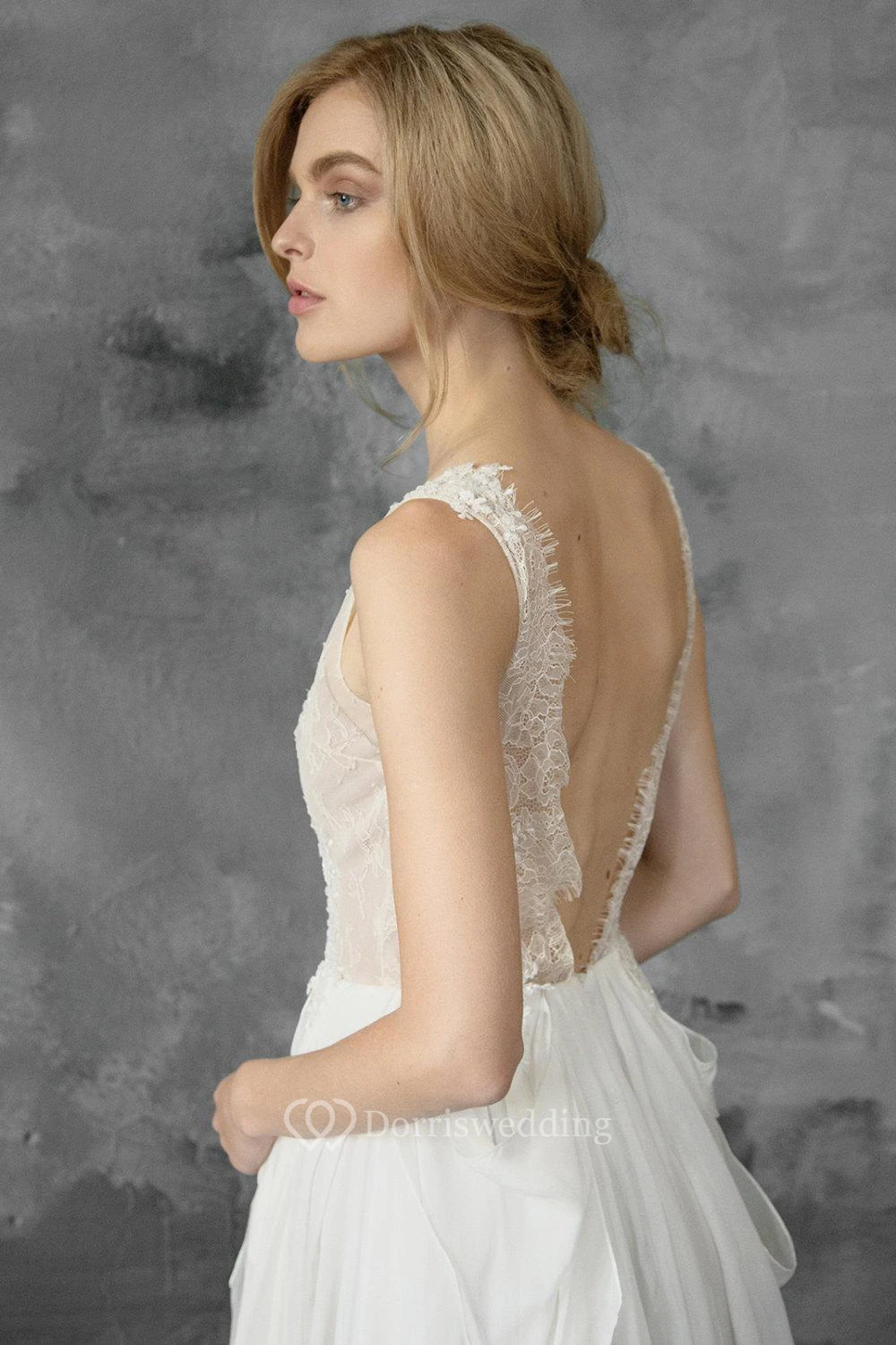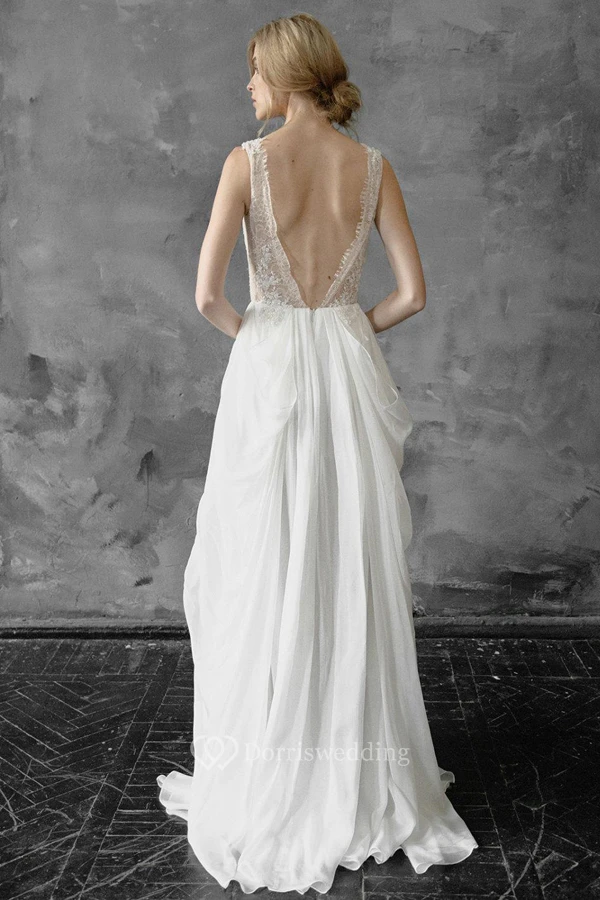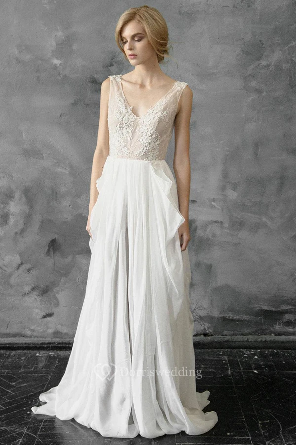 Plunged Sleeveless Chiffon Pick Up Wedding Dress With Appliques