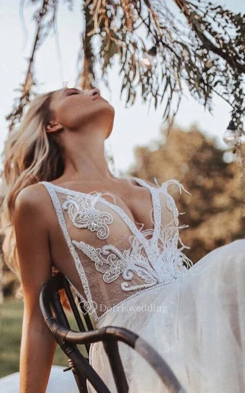 Plunged Sleeveless Sexy Empire A-line Chiffon Tulle Applique Wedding Dress