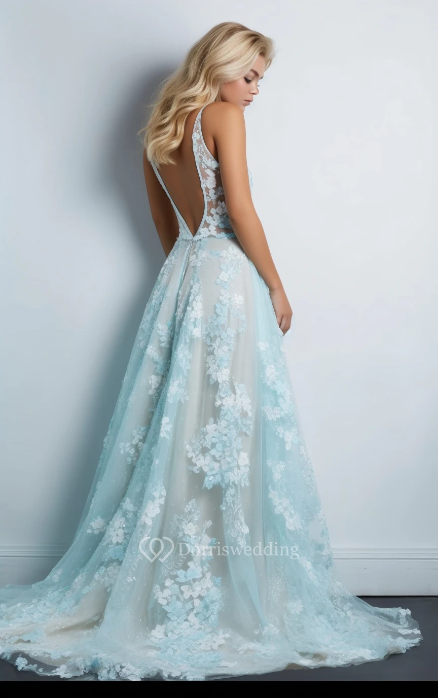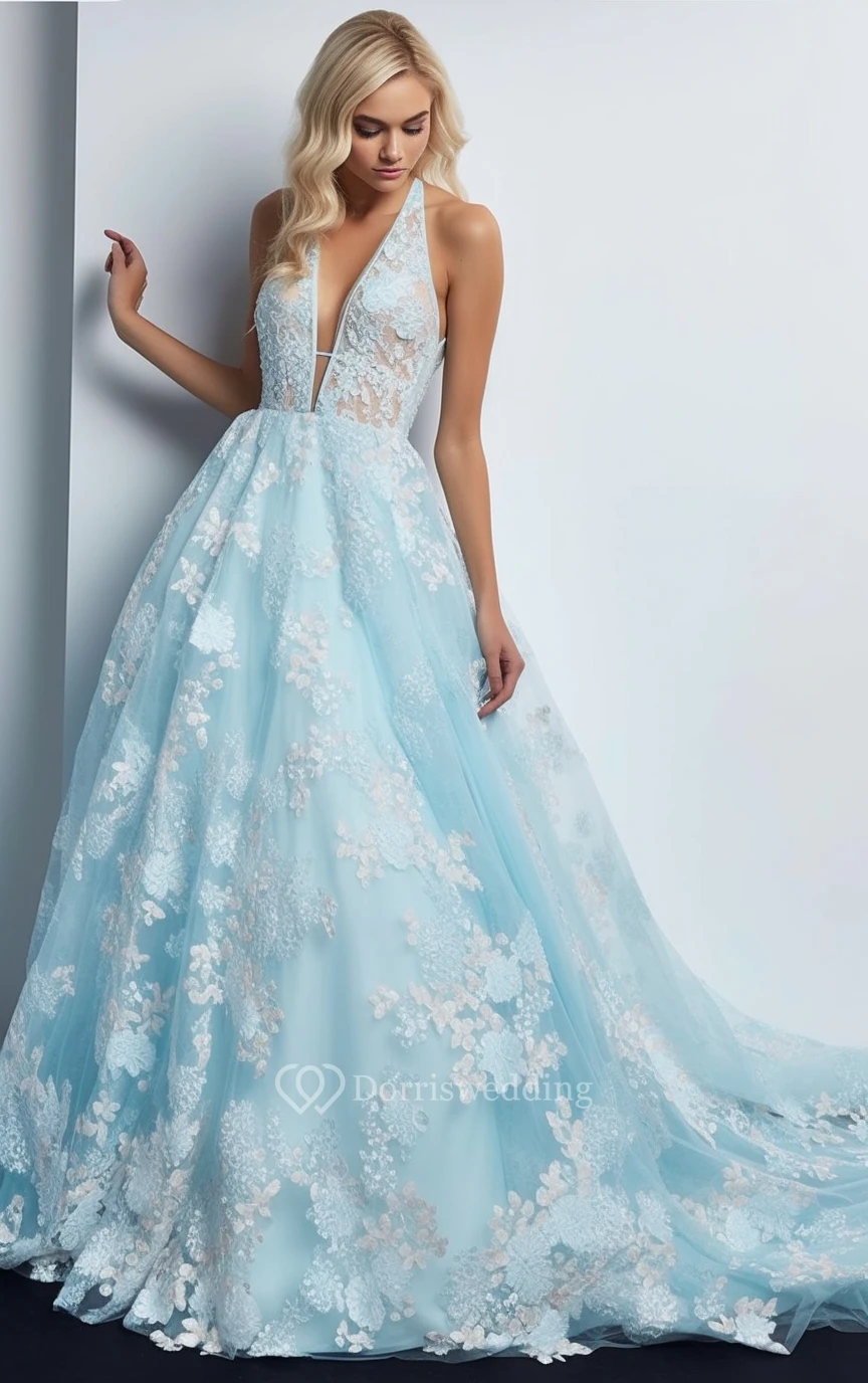 Plunged Sleeveless Sky Blue Lace Applique A-line Ball Gown Prom Dress