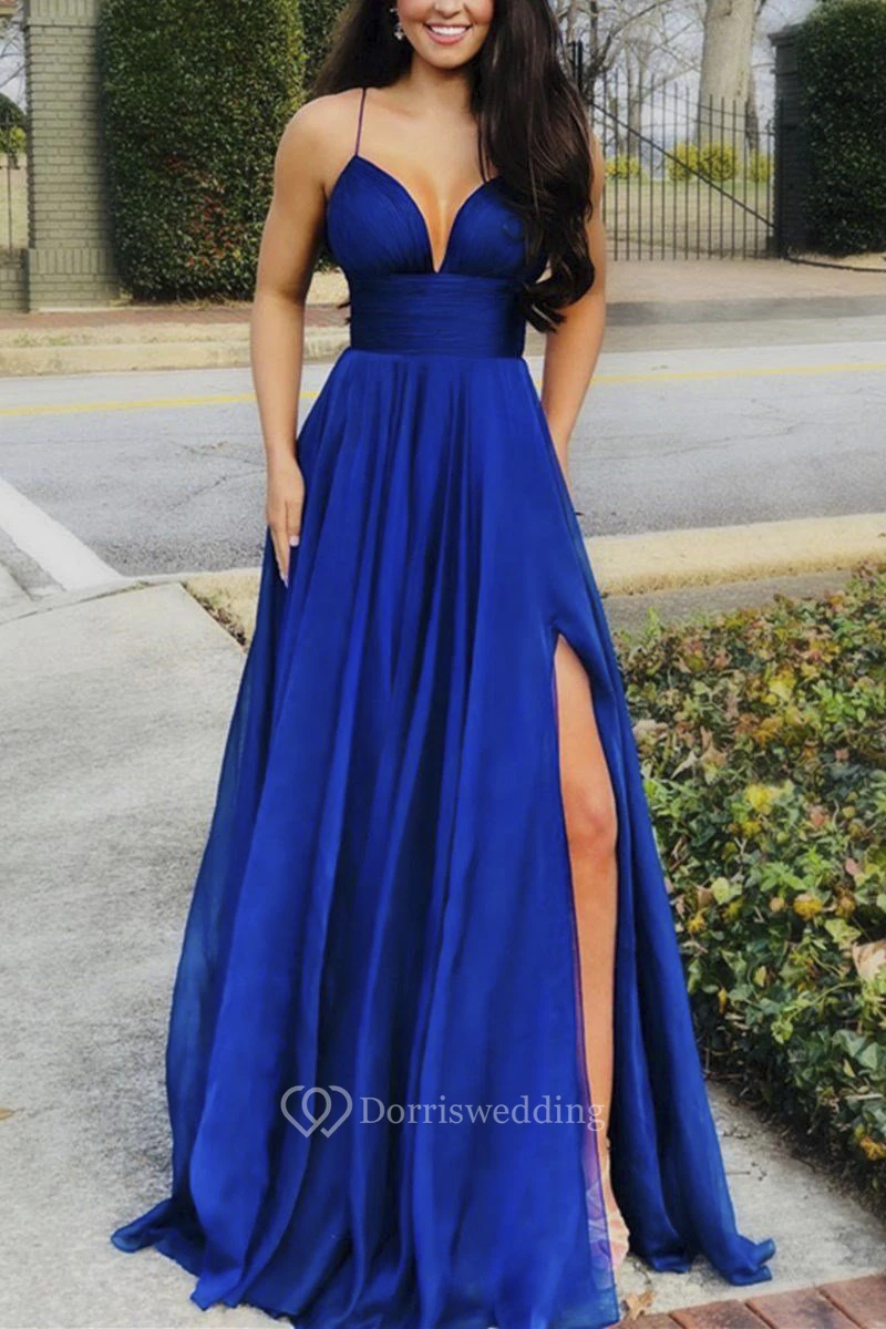 Plunging Spaghetti Sexy Front Split Dress With Sash And Pleats