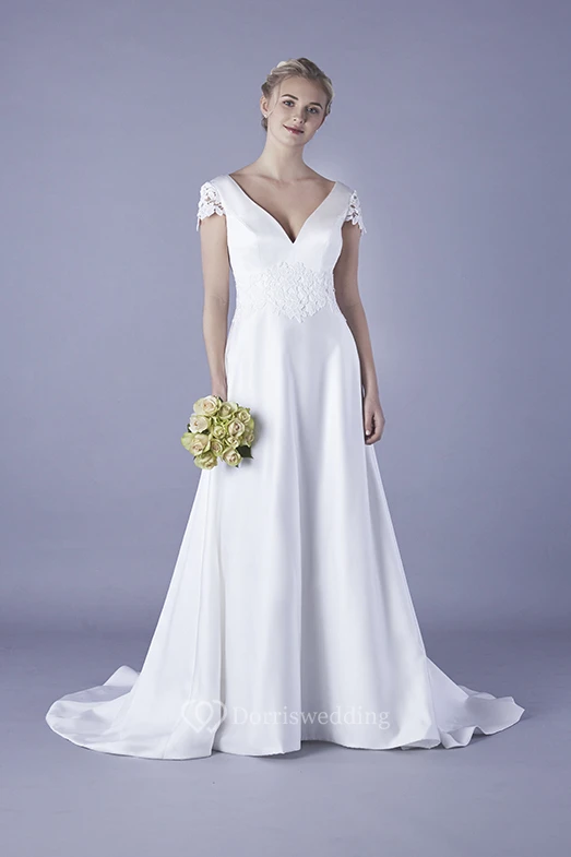 Plunging V-neck With Floral Cap Sleeves Satin Bridal Gown With Appliques