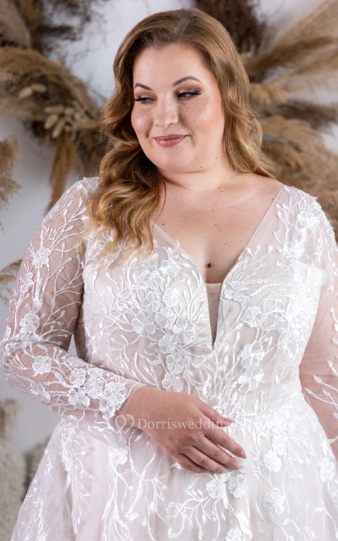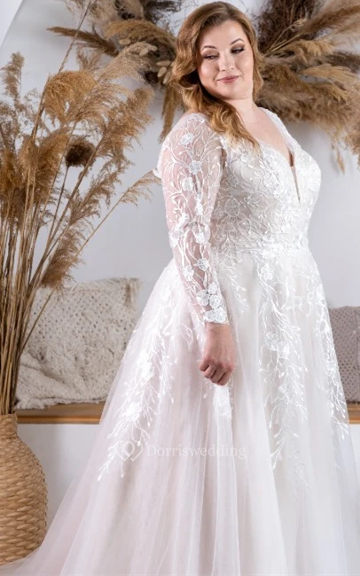 Plus Size A Line Tulle Plunging Neckline Wedding Dress with Appliques