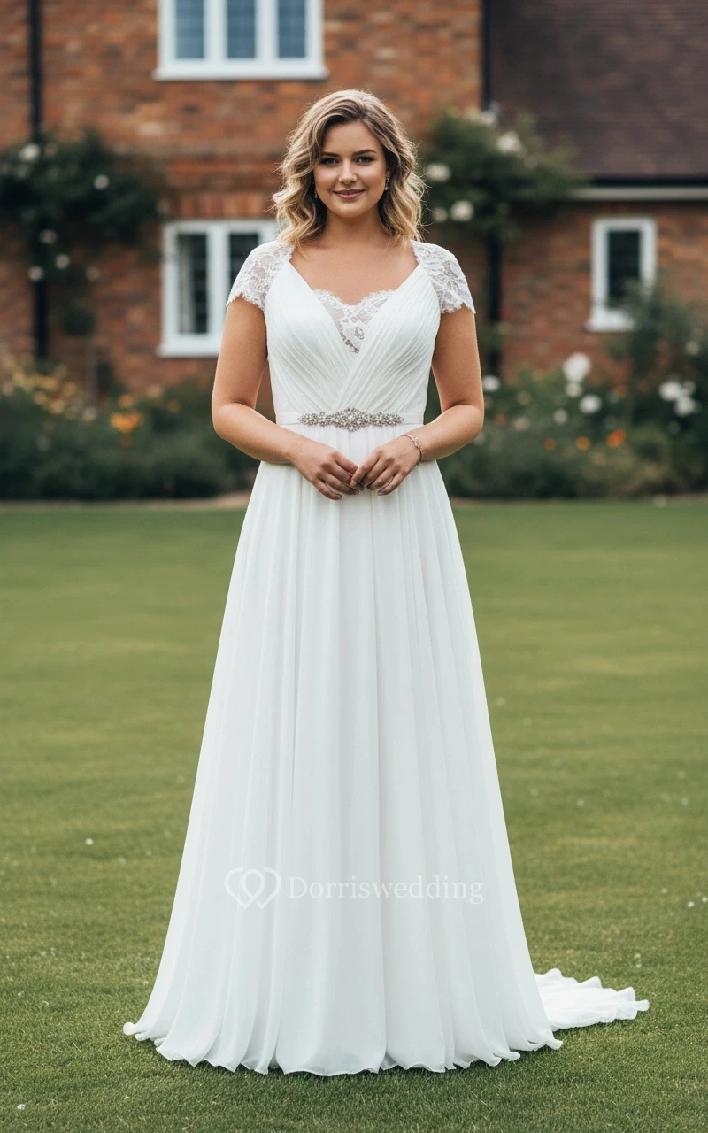 I was so pleasantly surprised by the quality of this gown. The pleated bodice is very slimming and the beaded waistband is the perfect touch of glam. The cap sleeves are comfortable and don't restrict arm movement. I felt so graceful and lovely on my wedding day. It’s a fantastic option for plus-size brides who want a classic and beautiful look.