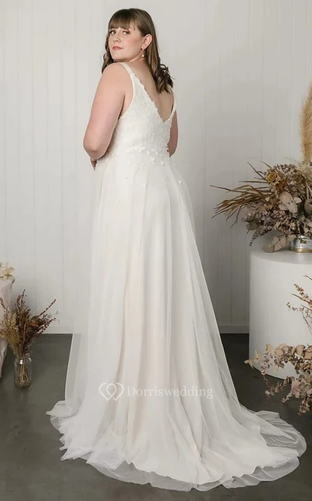 Plus Size Casual Lace A Line V-neck Wedding Dress with Train
