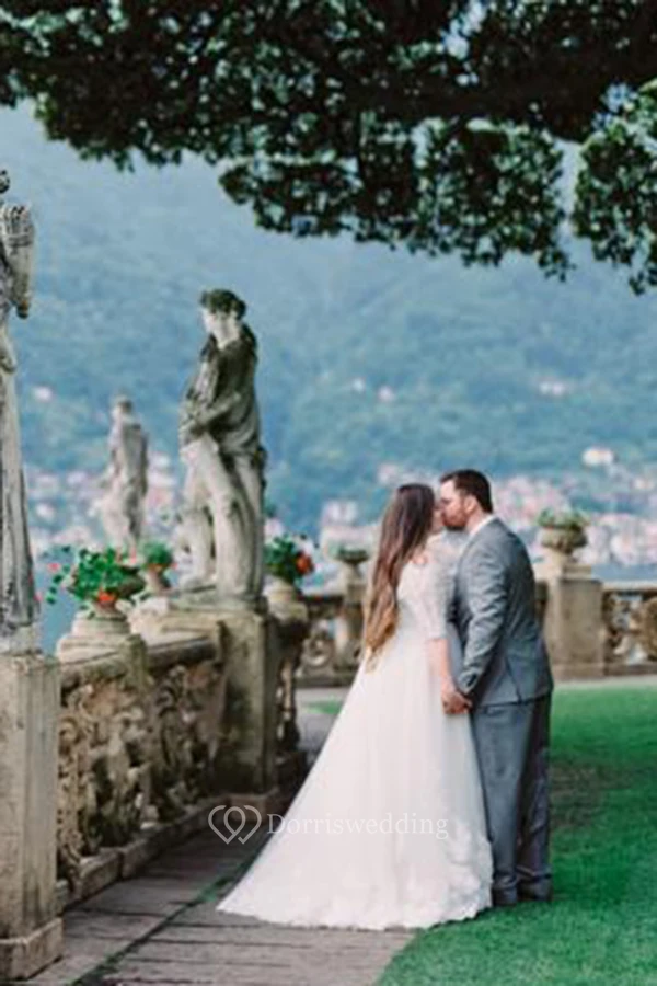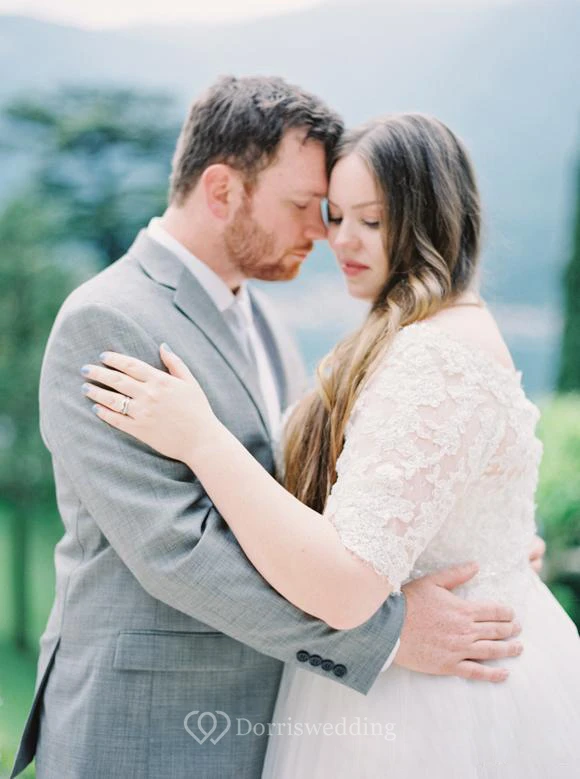 Plus Size Half Sleeves A-Line Appliques V Neck Lace Bridal Gown