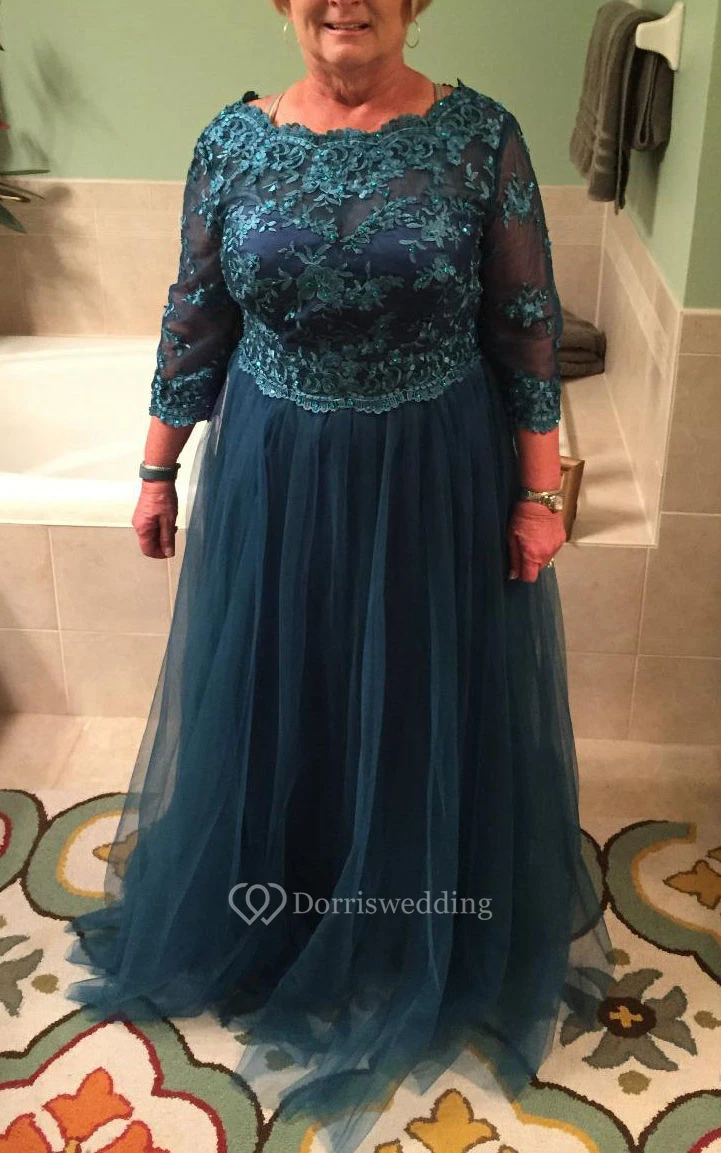 Plus Size Lace Yoke 3-4 Sleeve A-line Tulle Long Dress With Pleats