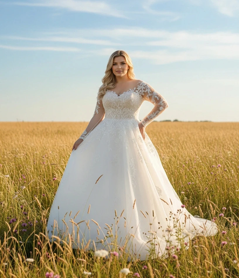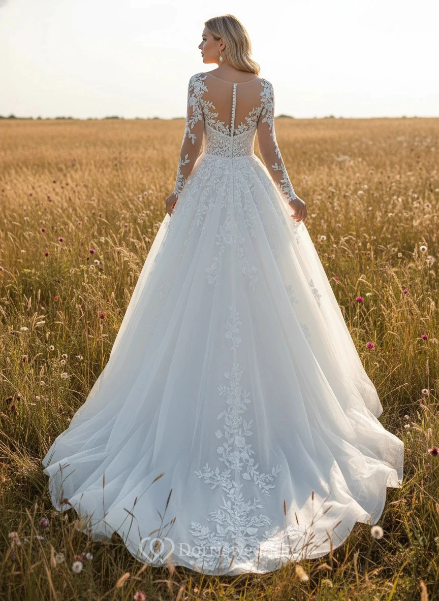 This romantic wedding dress includes a V-neck, long lace sleeves, and a full A-line skirt. Photographed in a golden wheat field with wildflowers under a bright sky, it evokes a natural and joyful atmosphere. Perfect for a country or garden wedding, it blends detailed lacework with a flowing, feminine design.