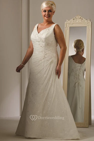 Plus Size V Neck Lace Bridal Gown With Lace