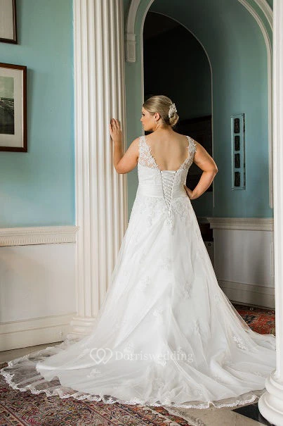 Plus Size V Neck Lace Bridal Gown With Lace Up And Train