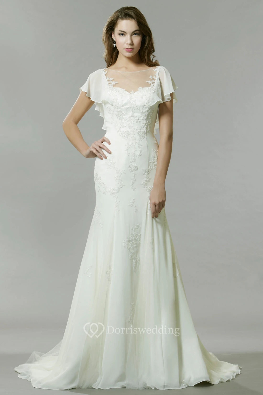 Poet-Sleeve Bateau-Neck Chiffon Wedding Dress With Illusion