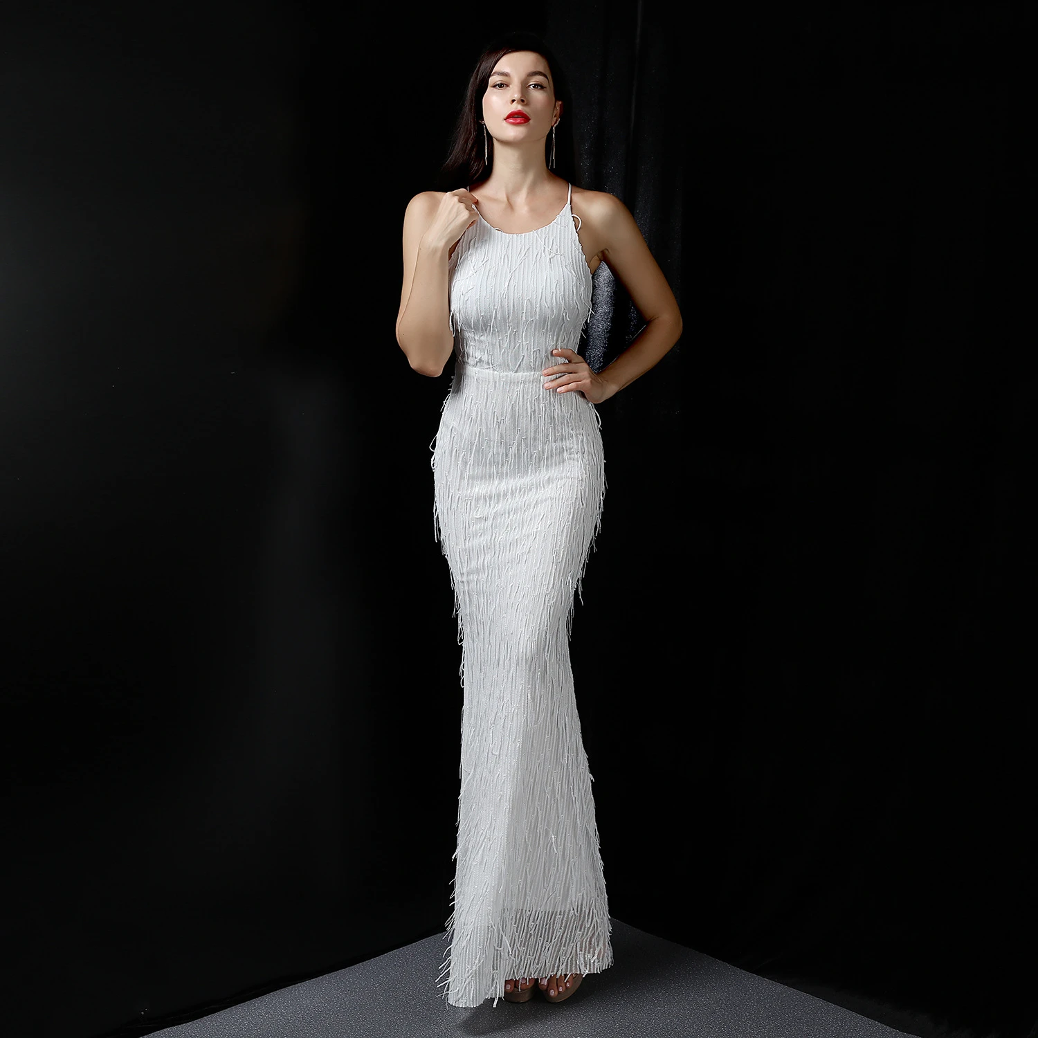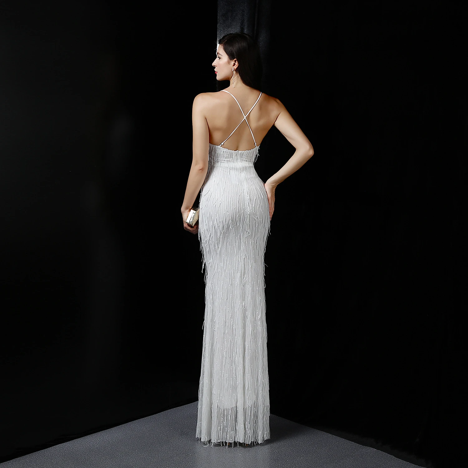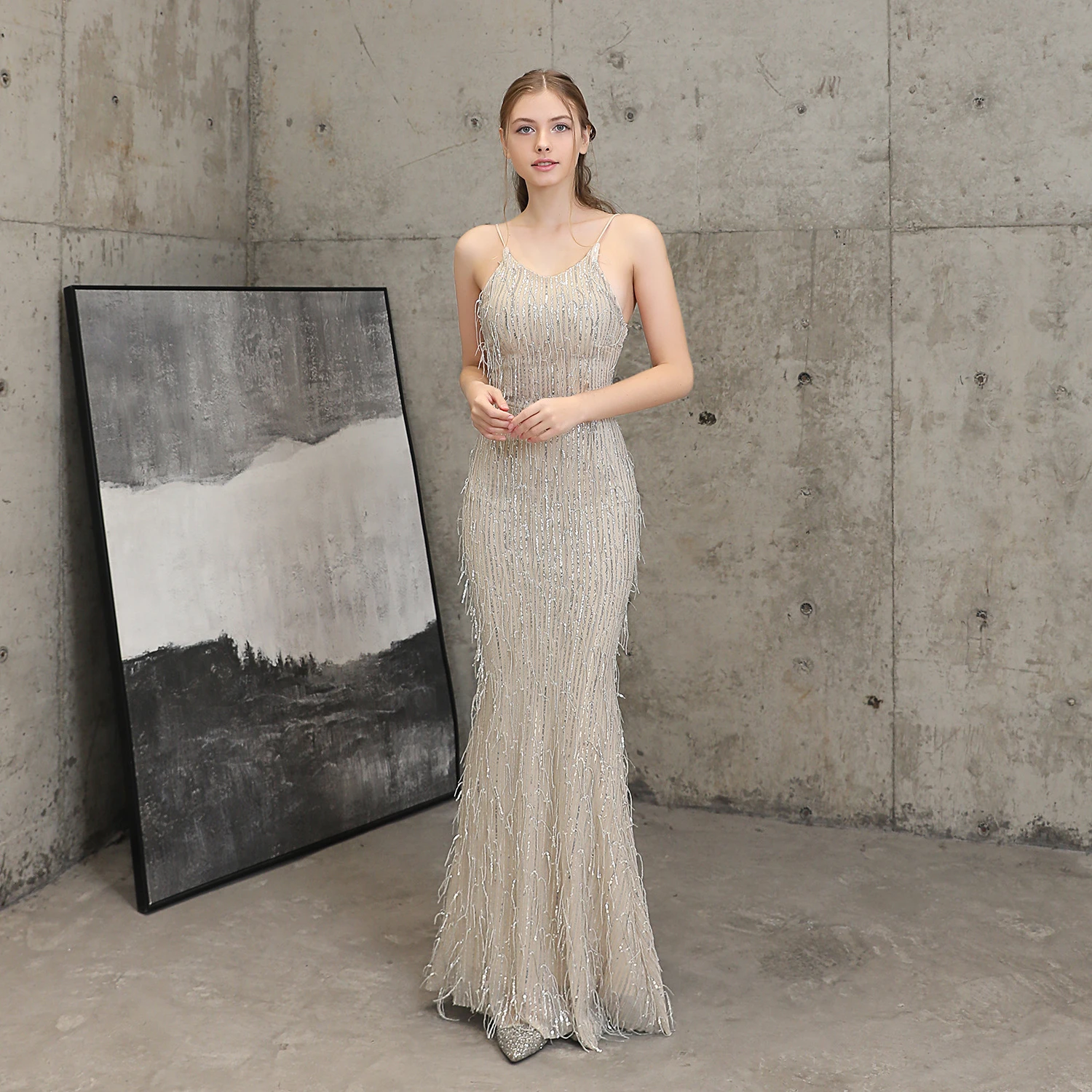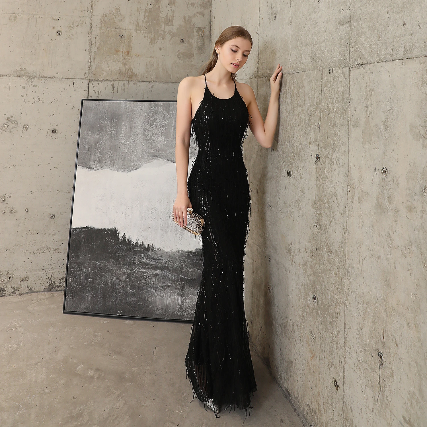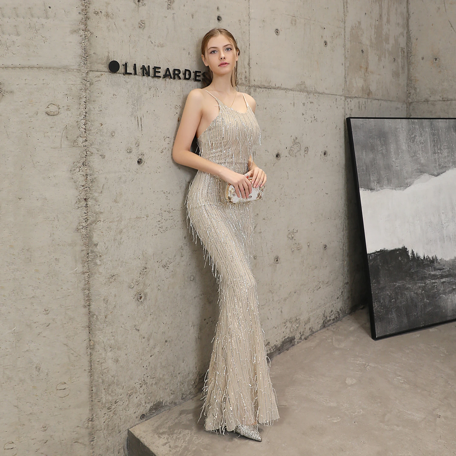 Polyester Silk Thread Tassel Sequins Fishtail Banquet Elegant Temperament Meeting Host Car Model Evening Dress Autumn
