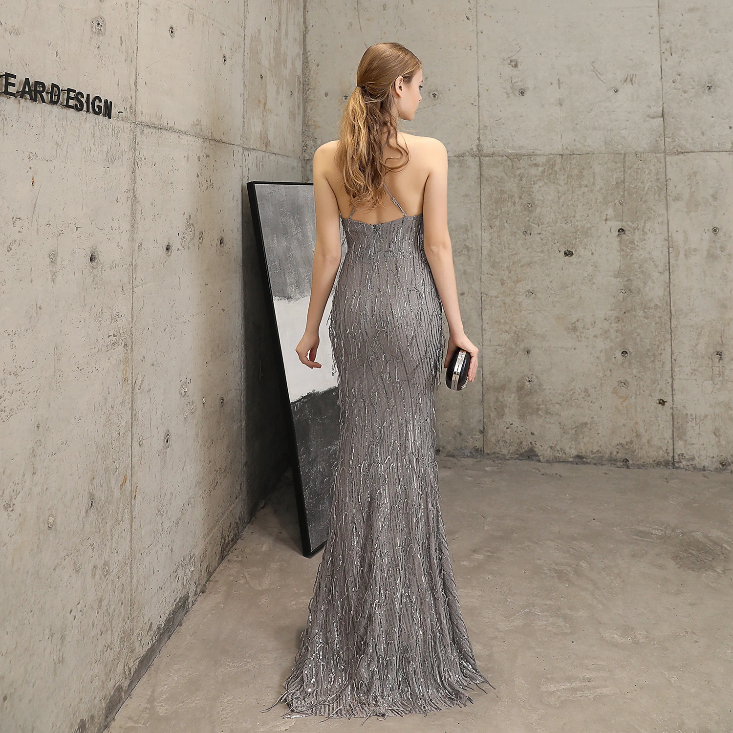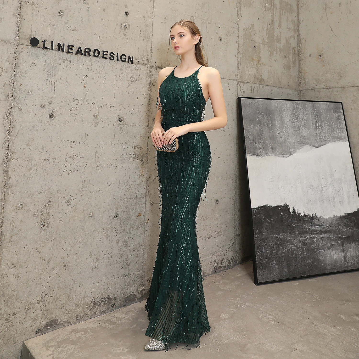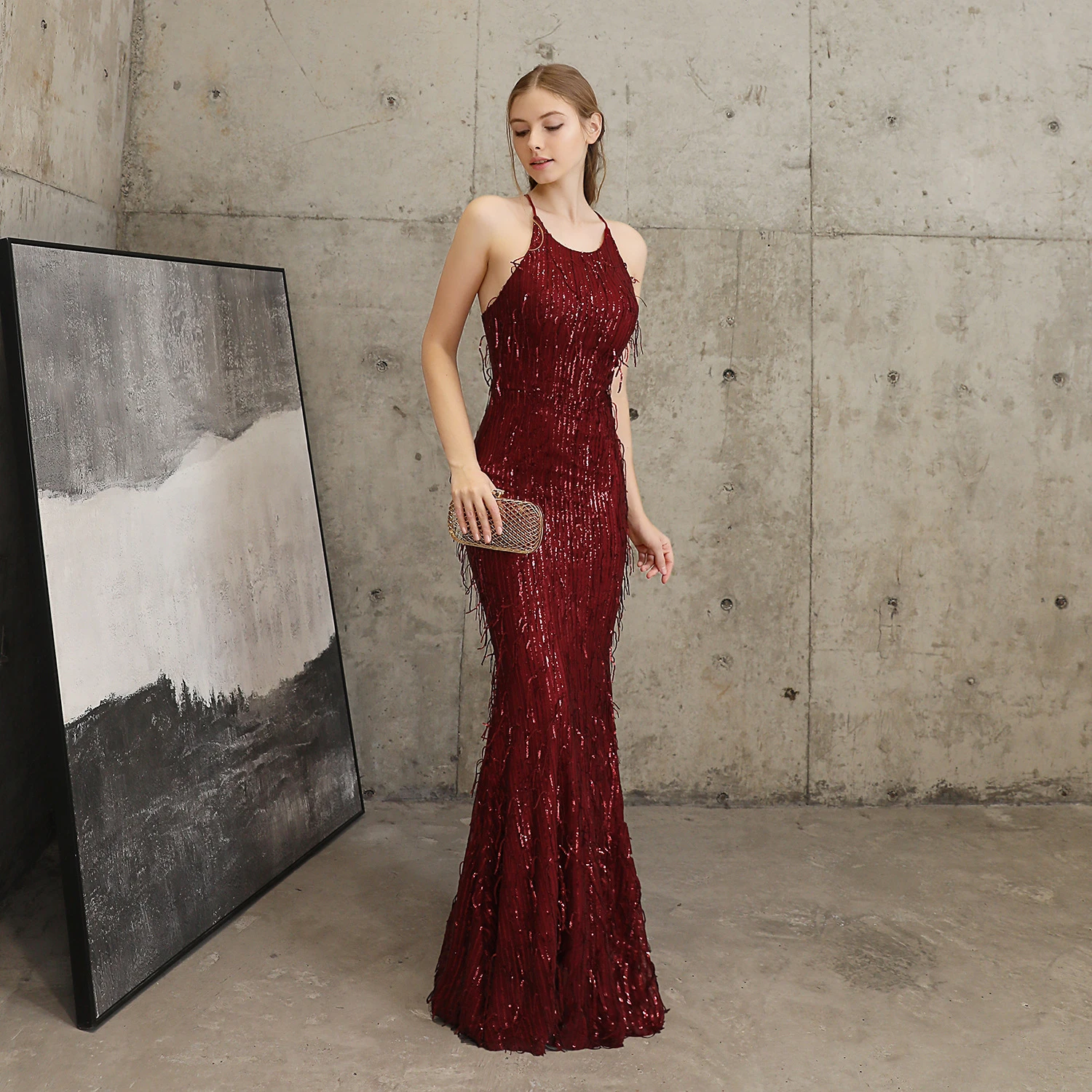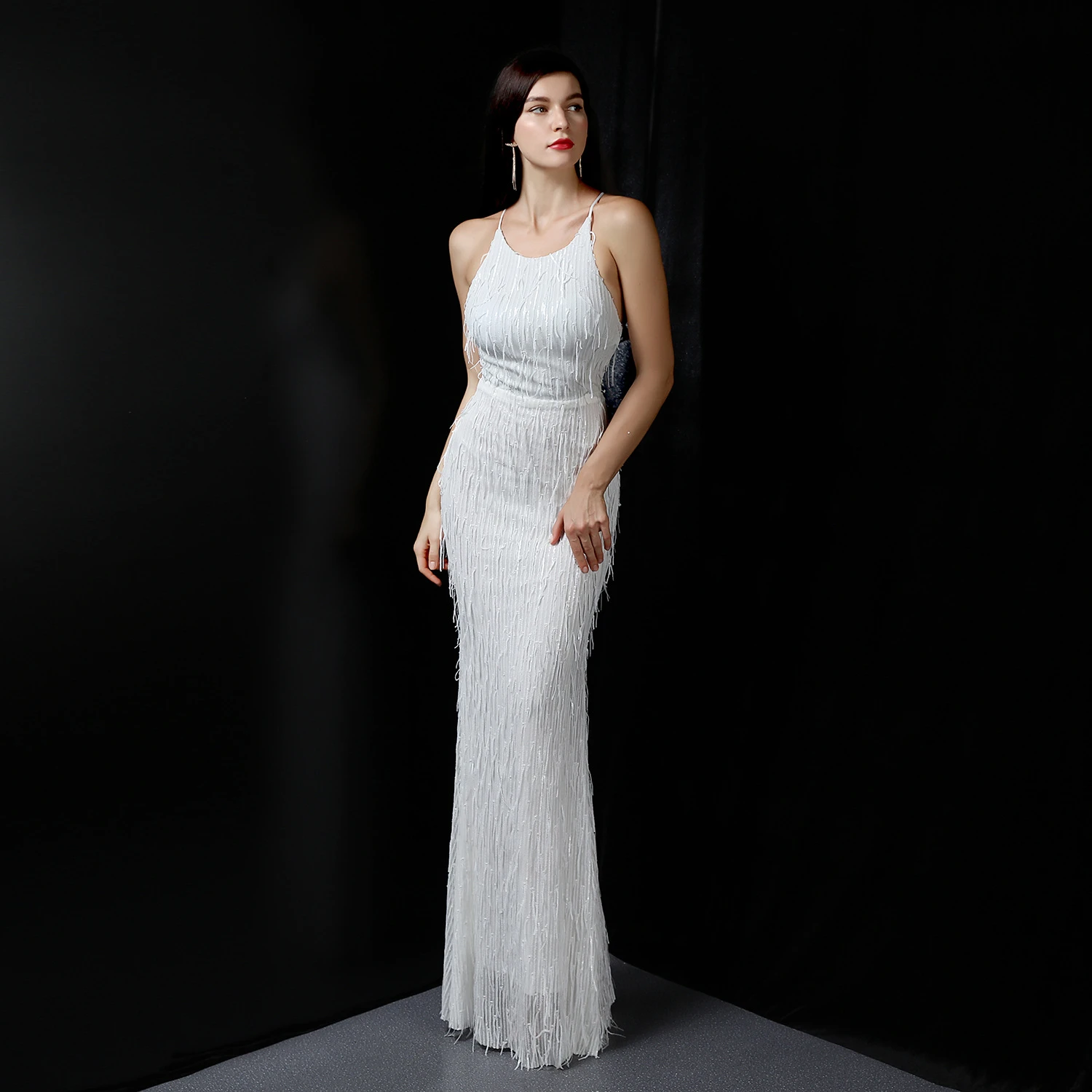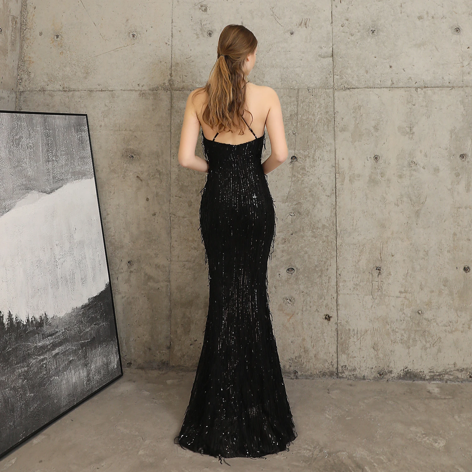 Polyester Silk Thread Tassel Sequins Fishtail Banquet Elegant Temperament Meeting Host Car Model Evening Dress Autumn