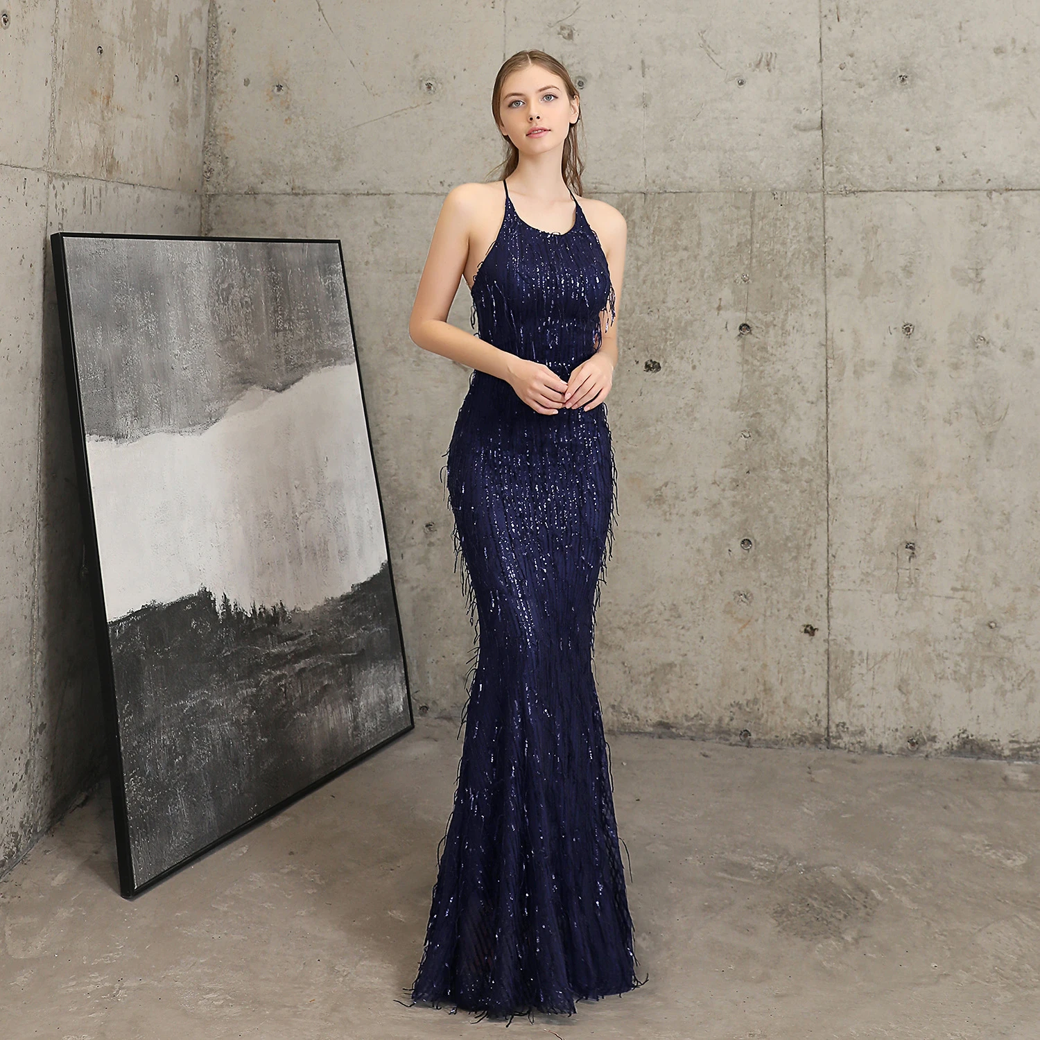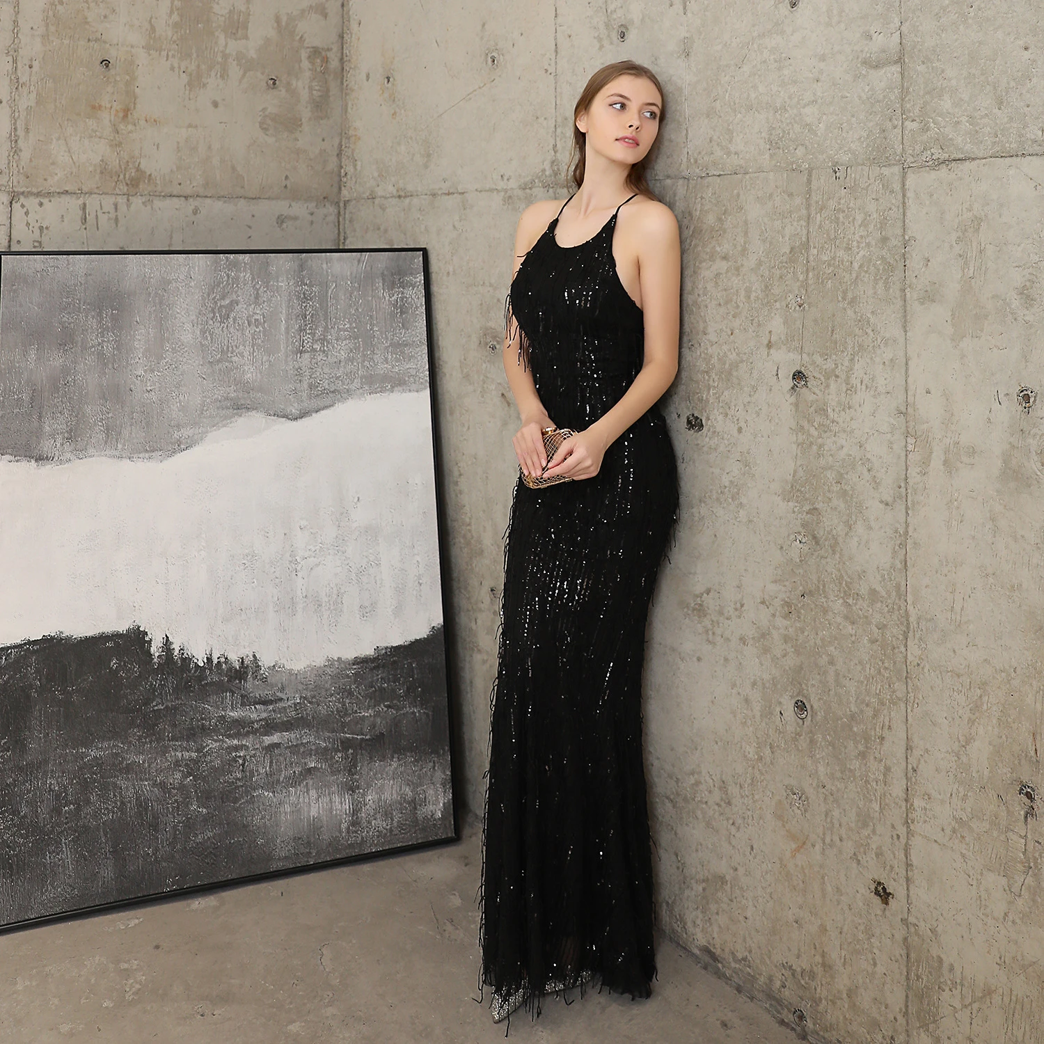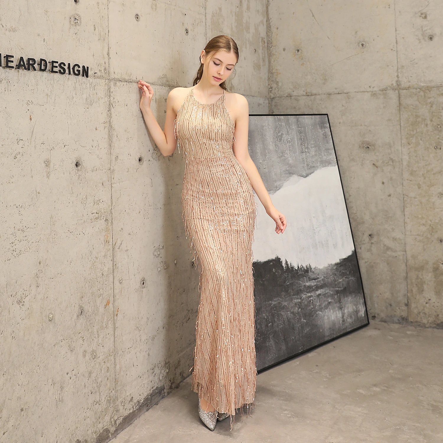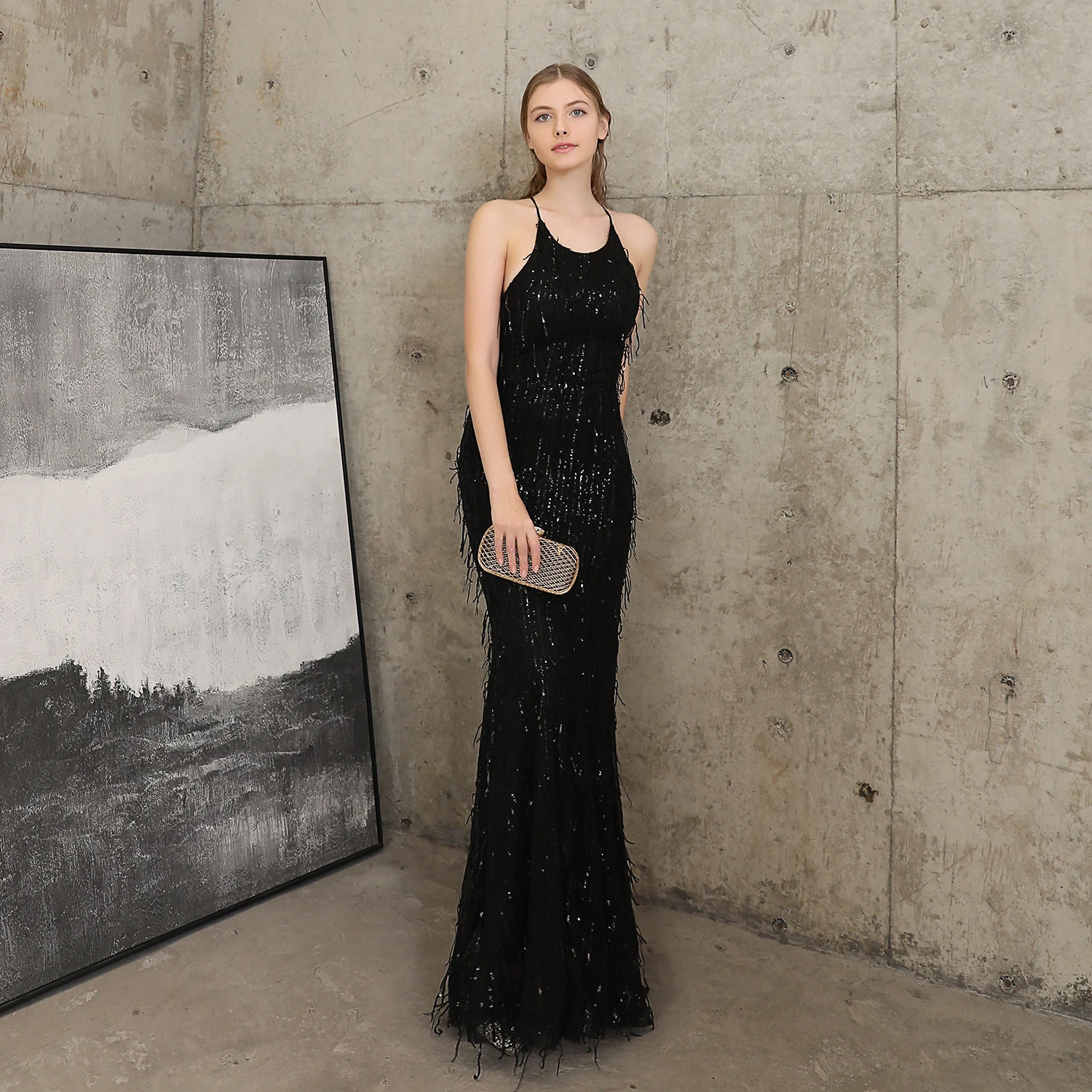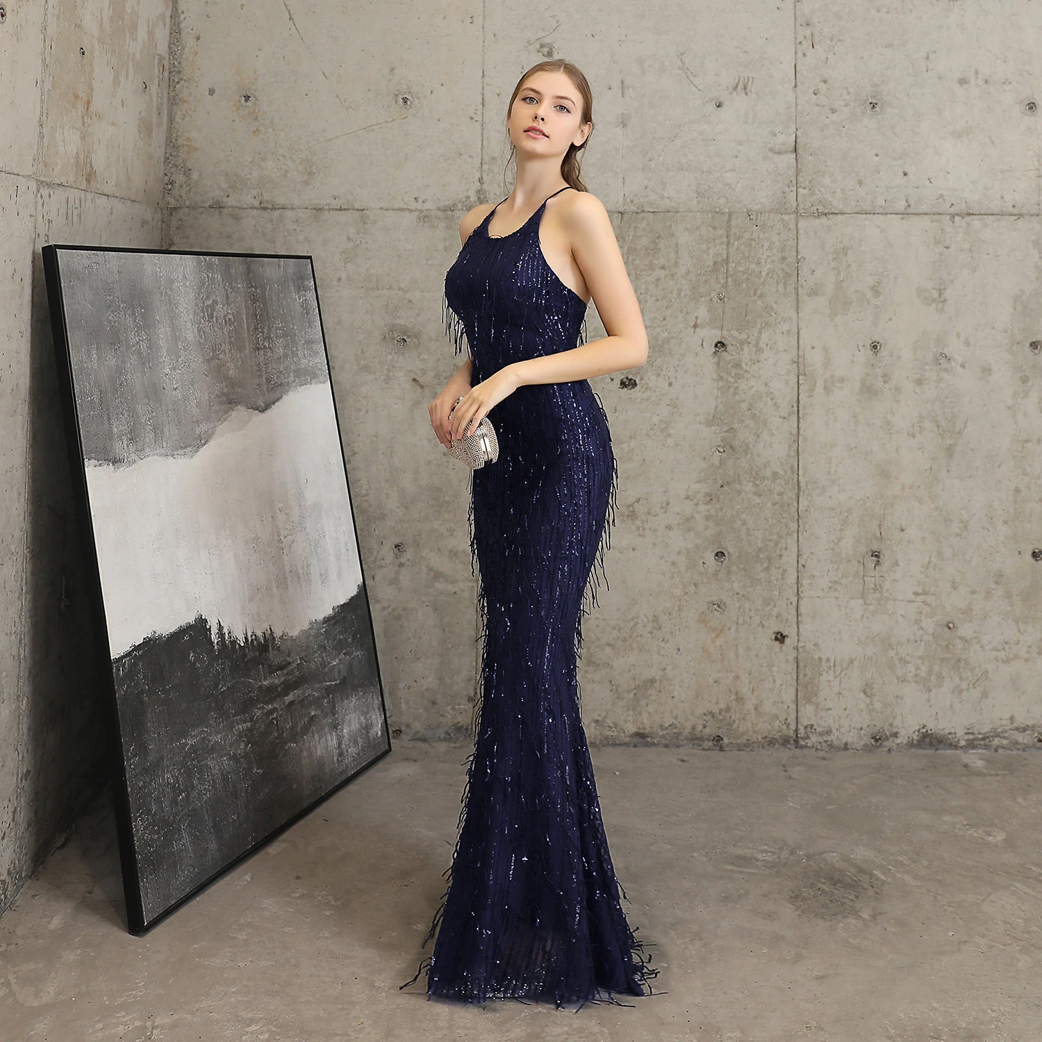 Polyester Silk Thread Tassel Sequins Fishtail Banquet Elegant Temperament Meeting Host Car Model Evening Dress Autumn