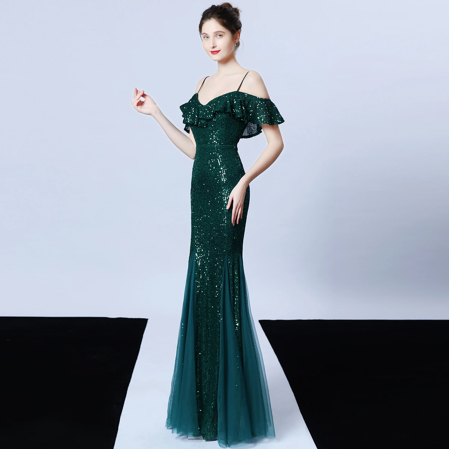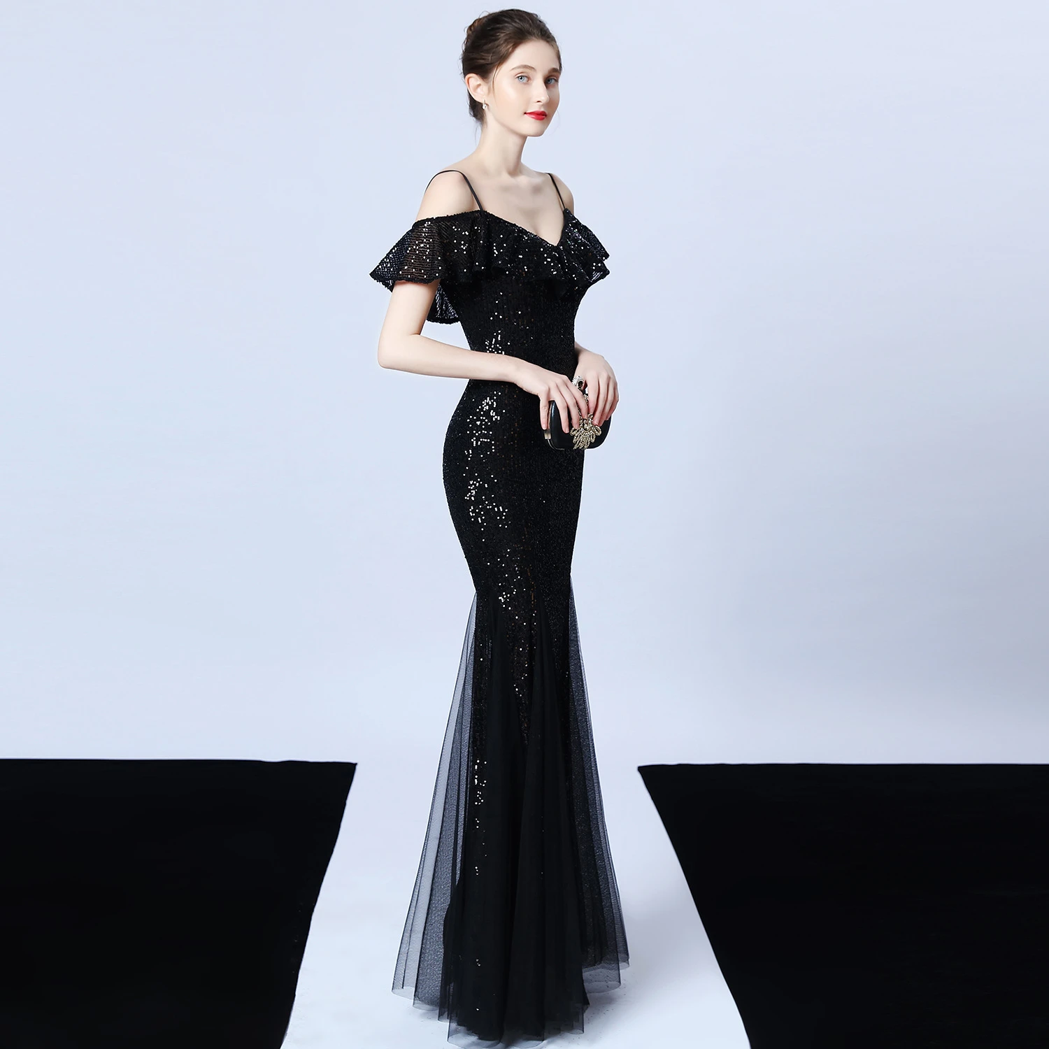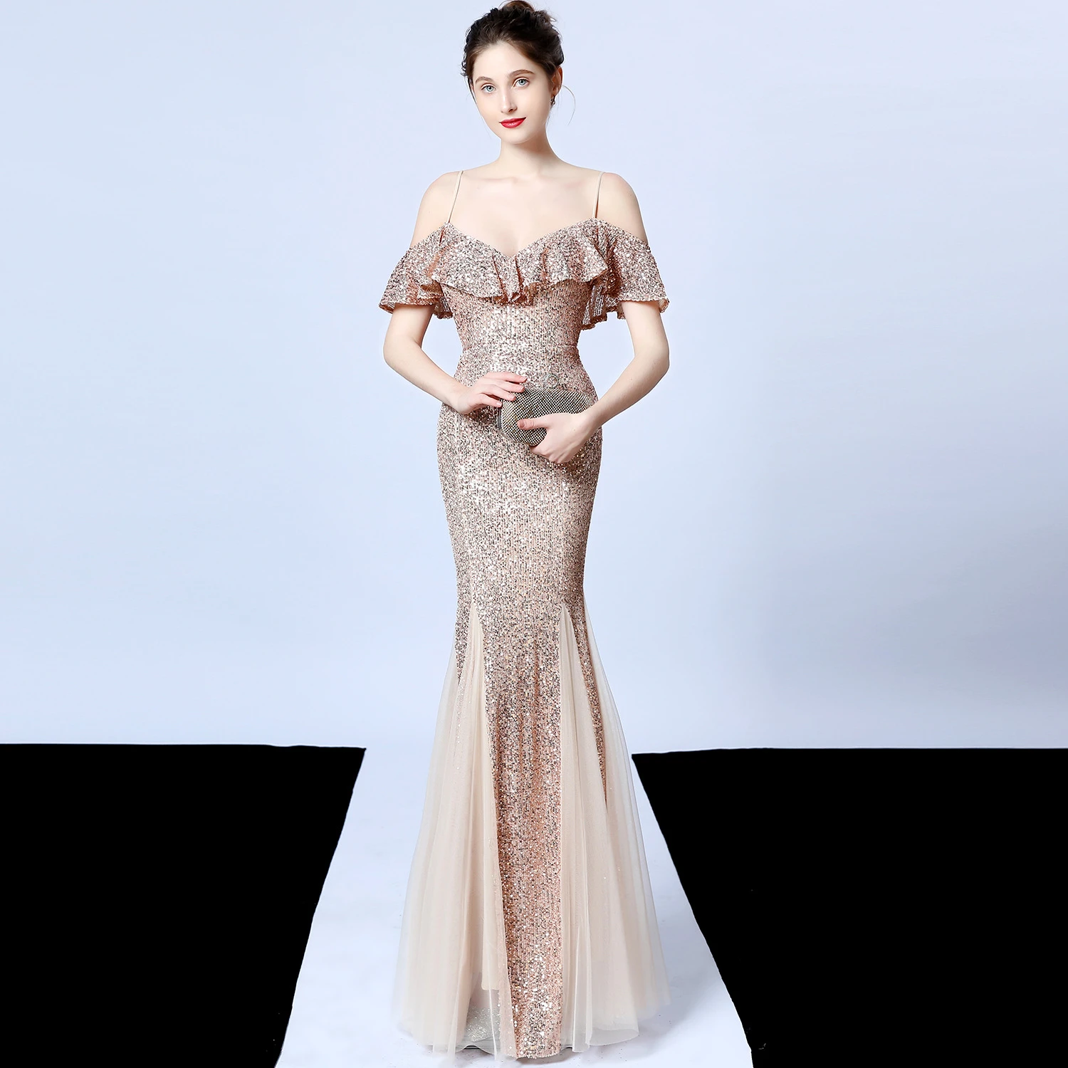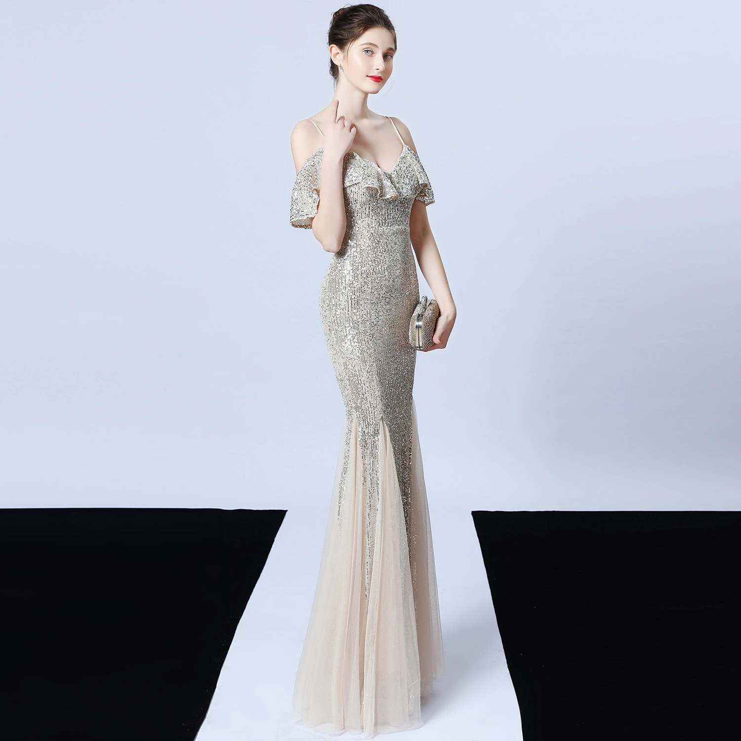Polyester Thread Tassel Sequin Fishtail Banquet Elegant Temperament Host Car Model Evening Dress Autumn