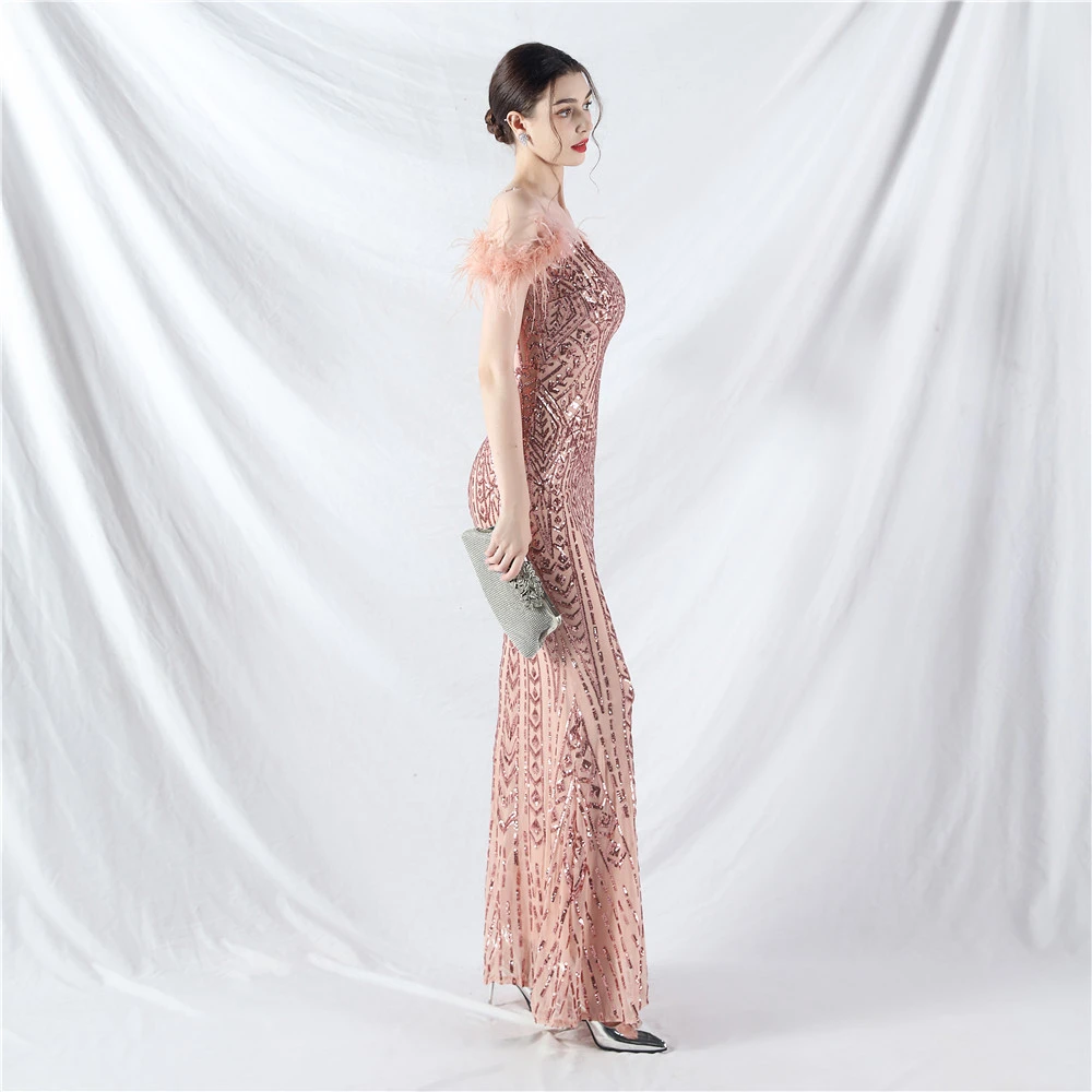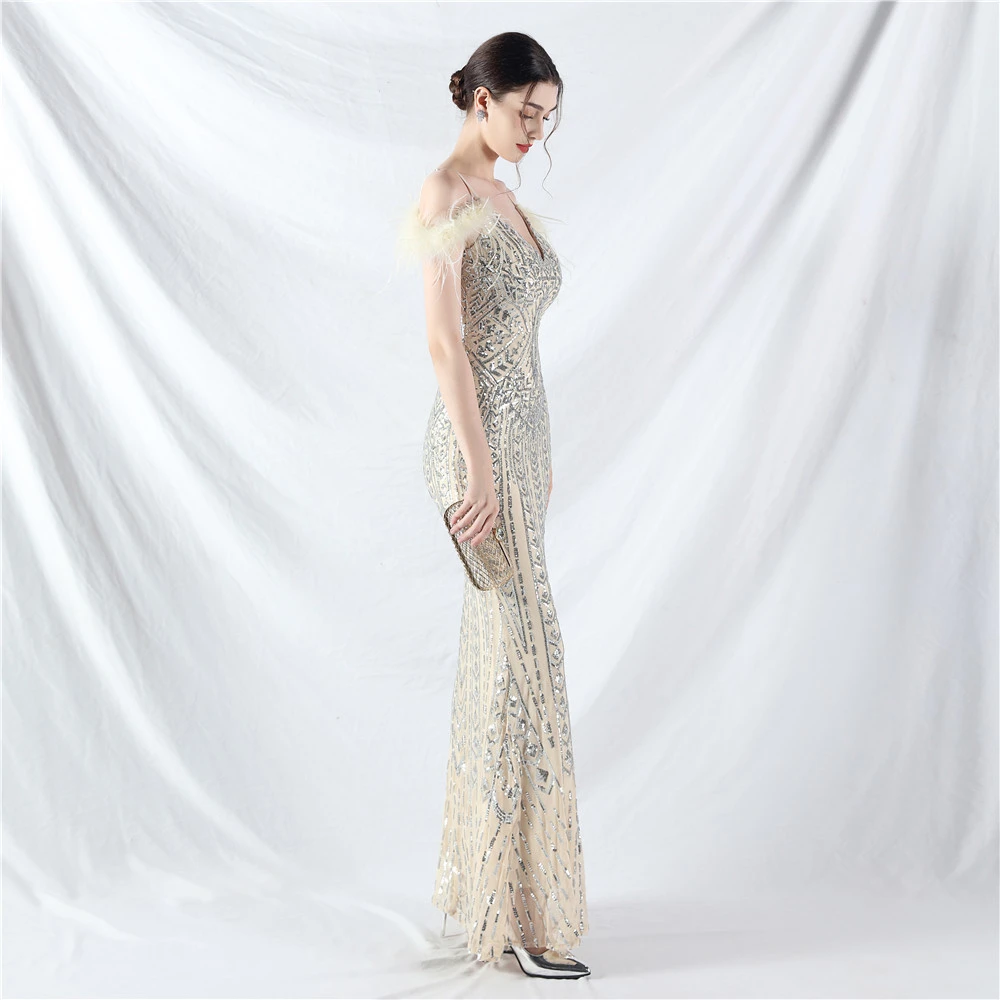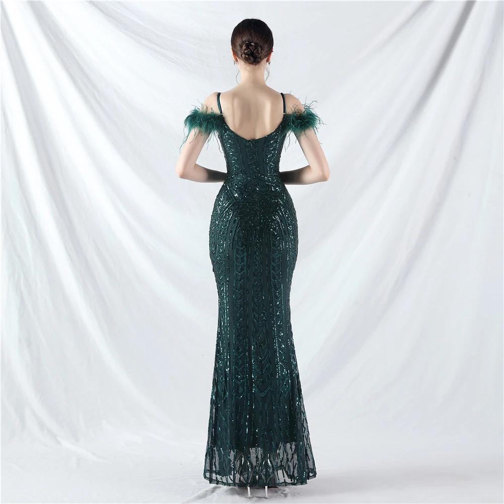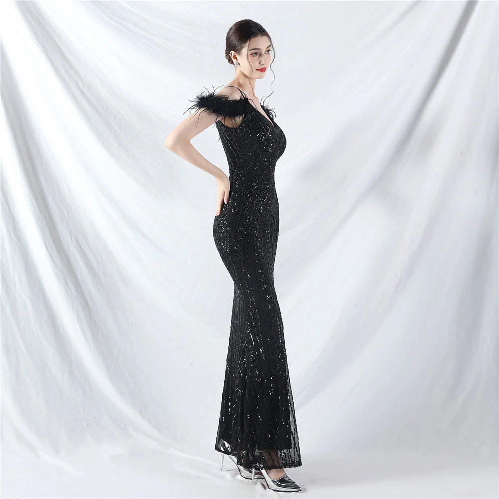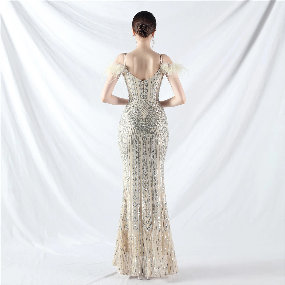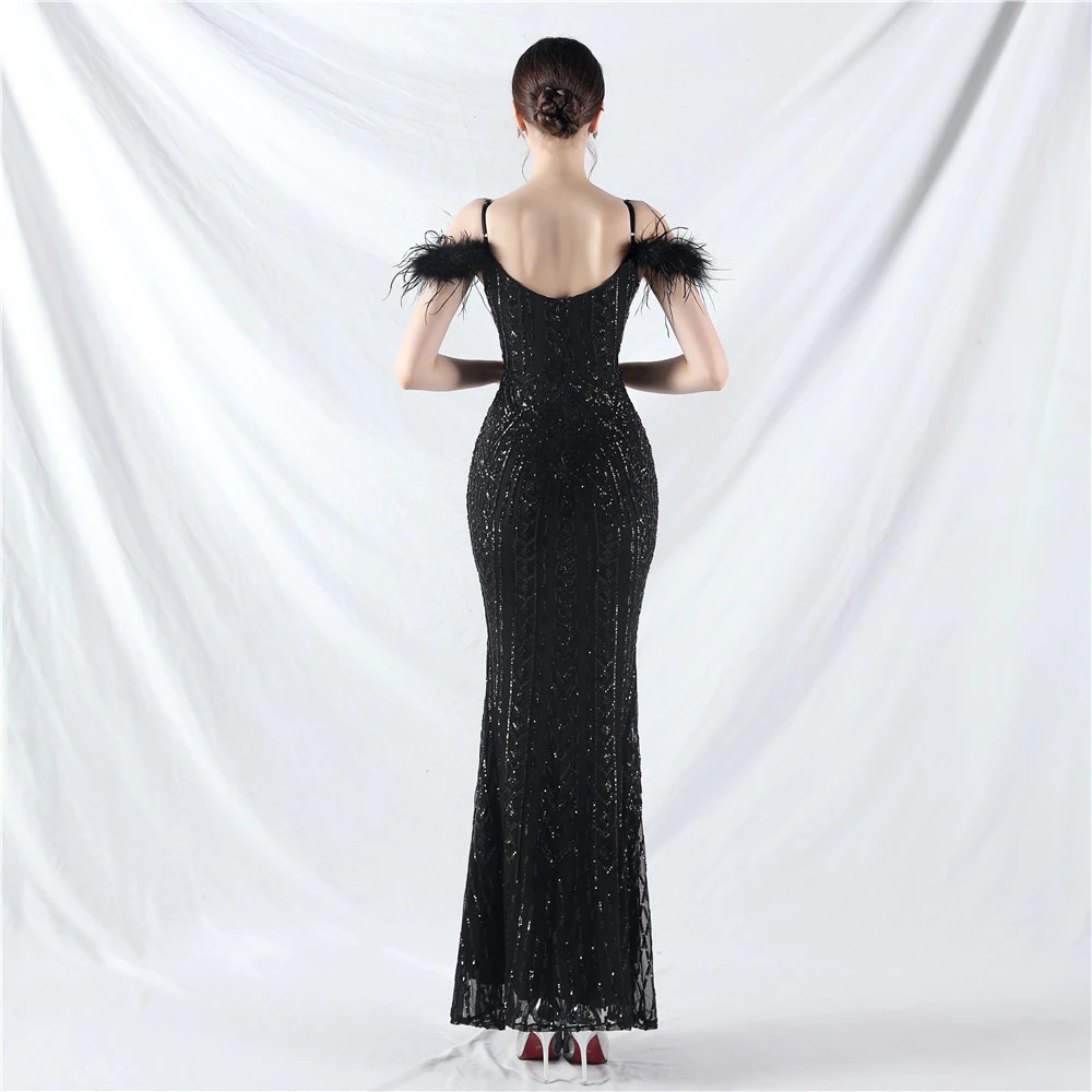 Positioned Flower Beads Crafted Ostrich Feather High-End Evening Dress