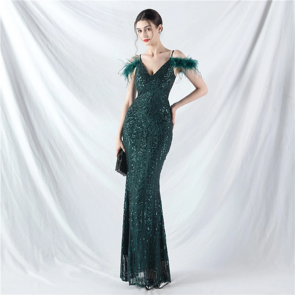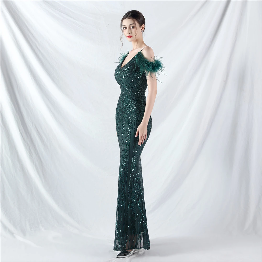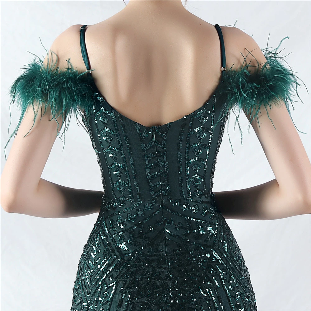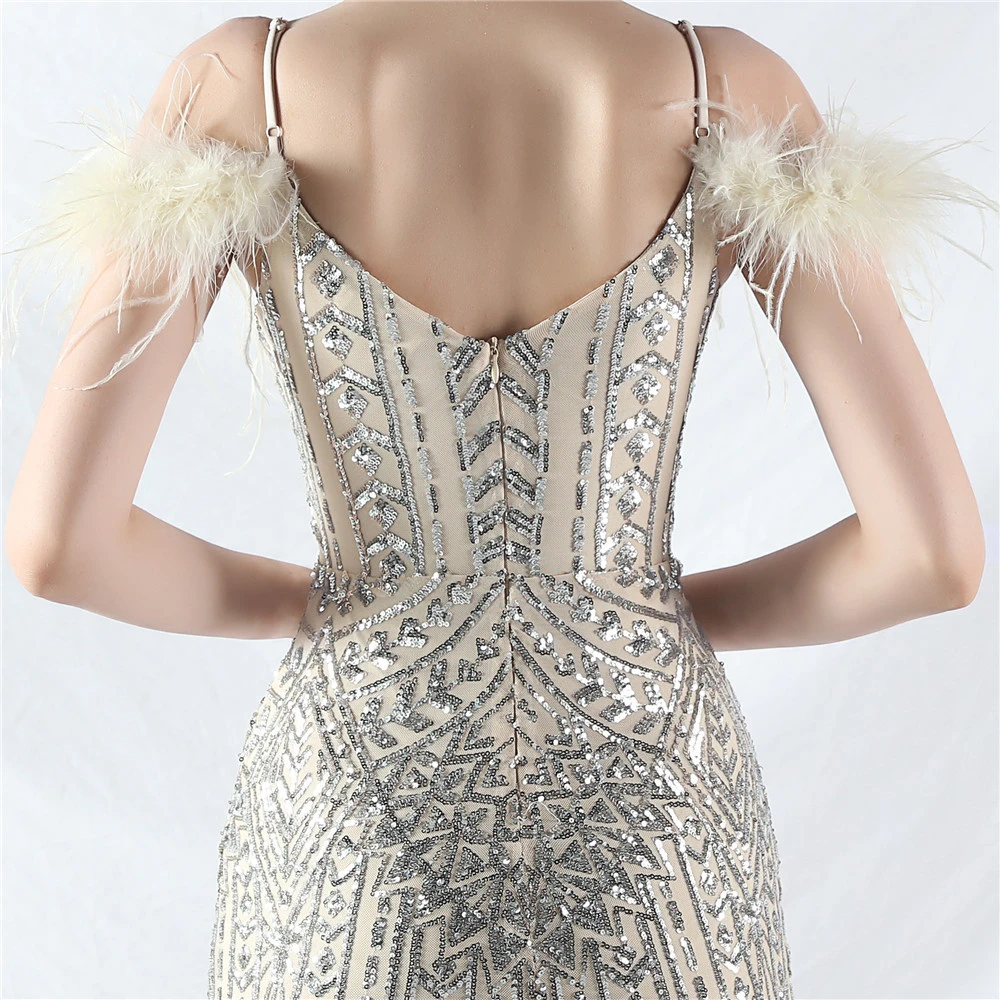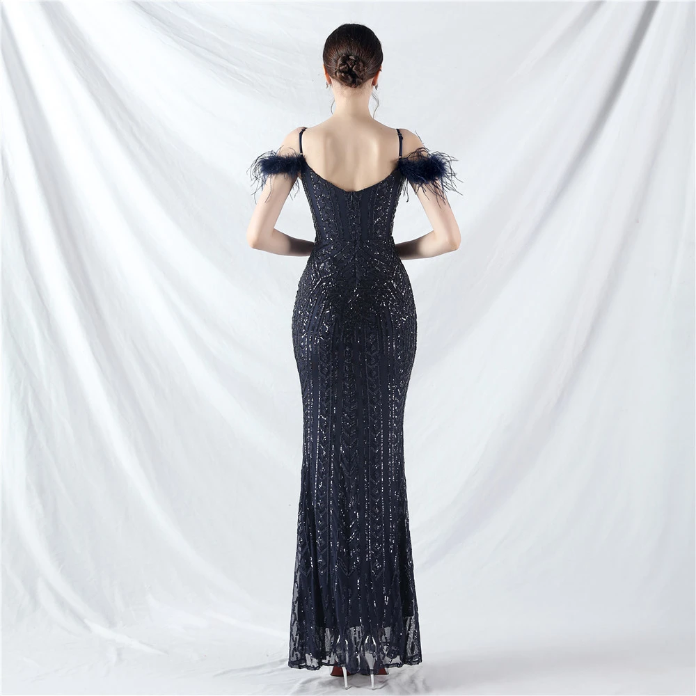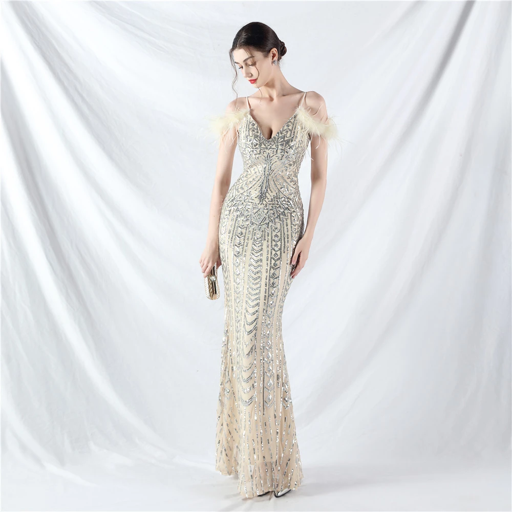 Positioned Flower Beads Crafted Ostrich Feather High-End Evening Dress