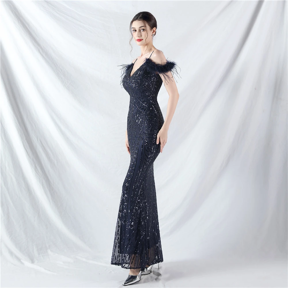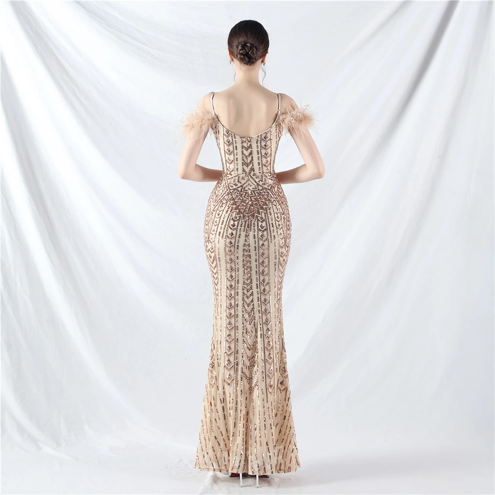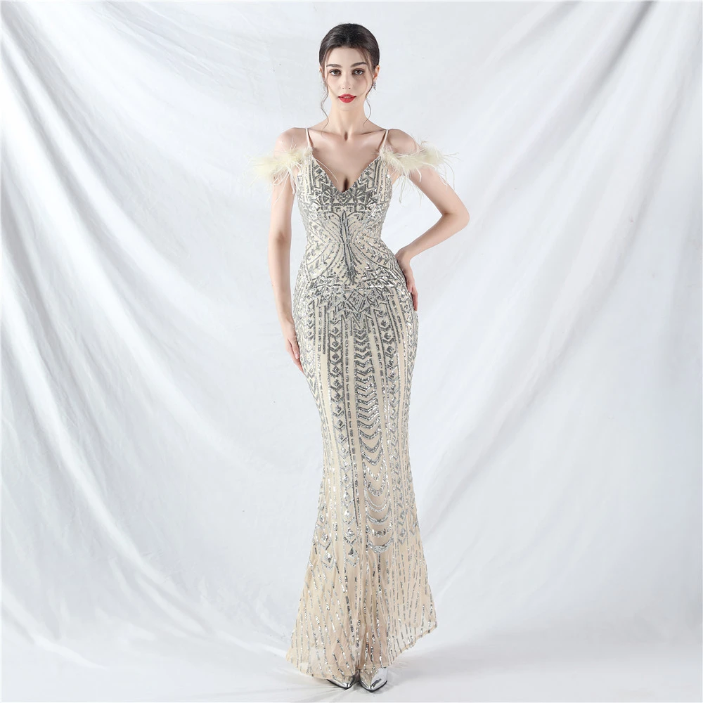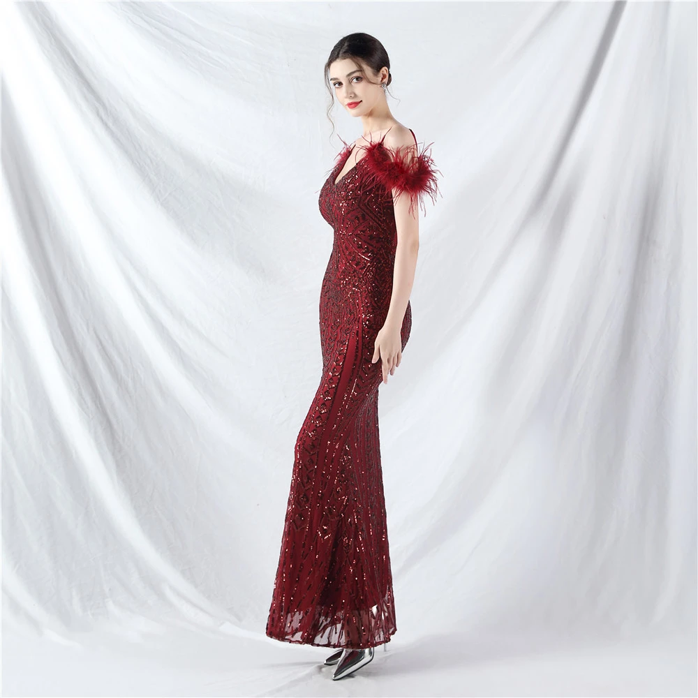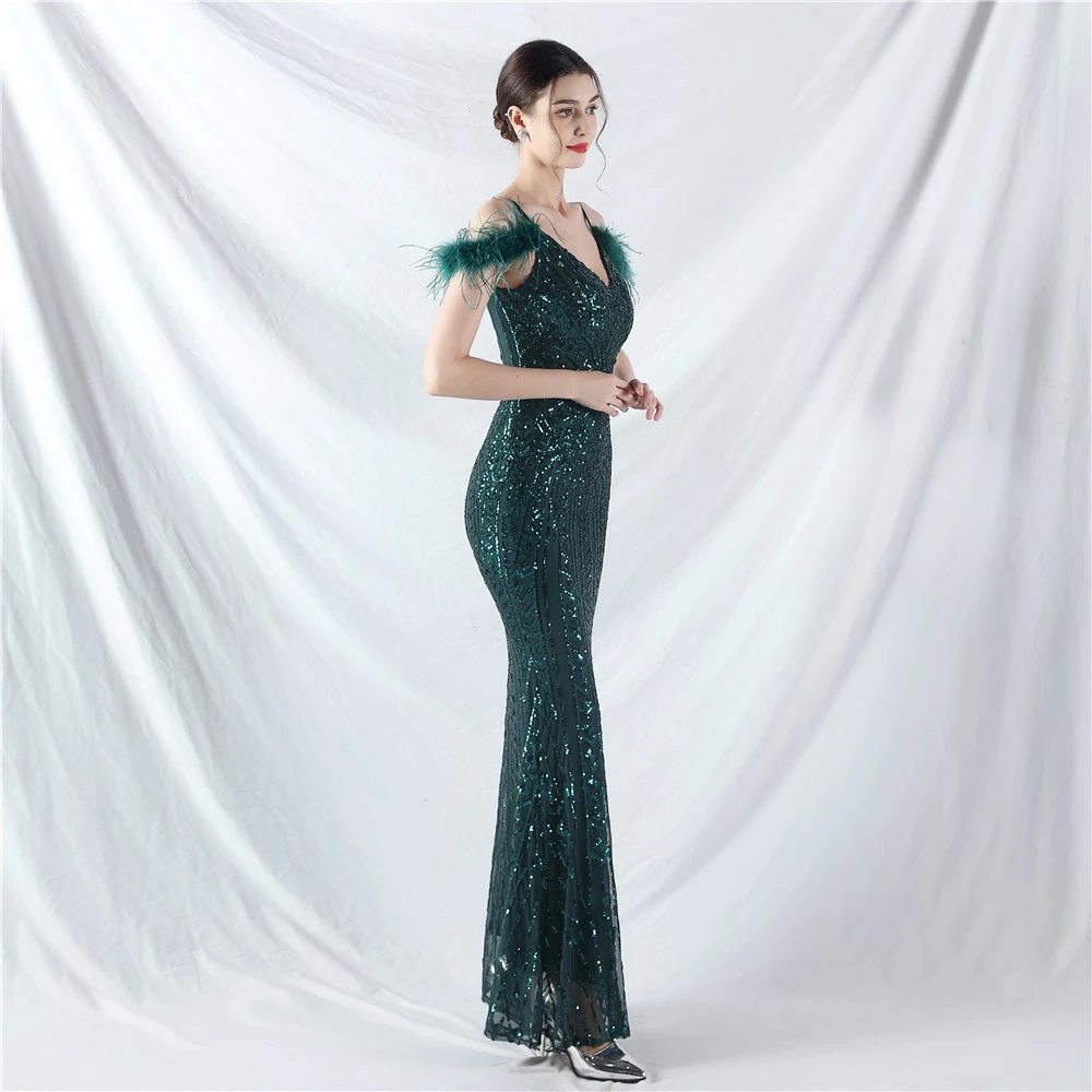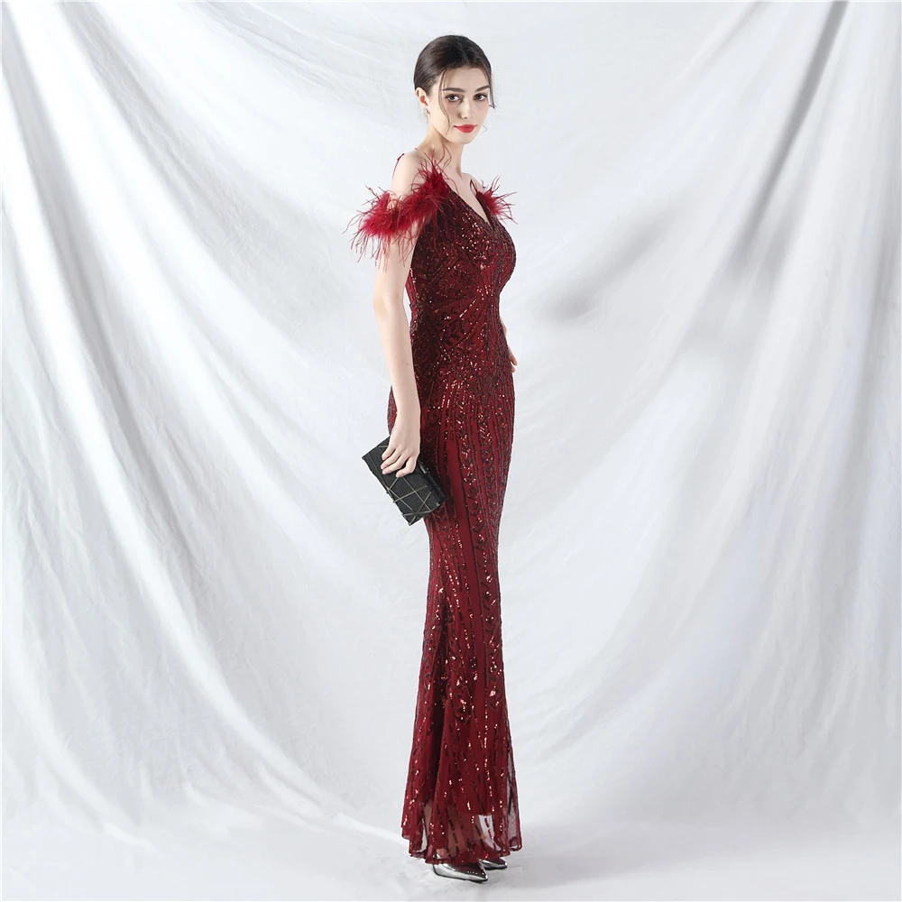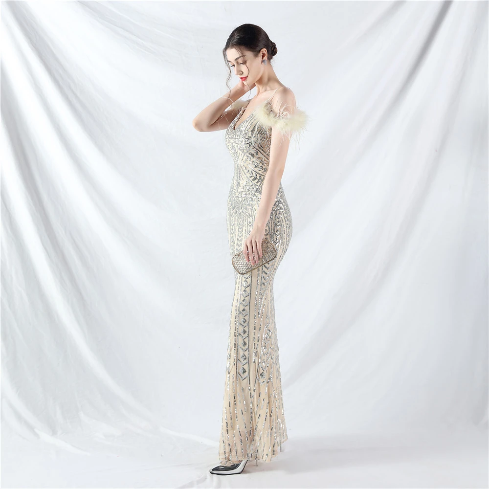 Positioned Flower Beads Crafted Ostrich Feather High-End Evening Dress