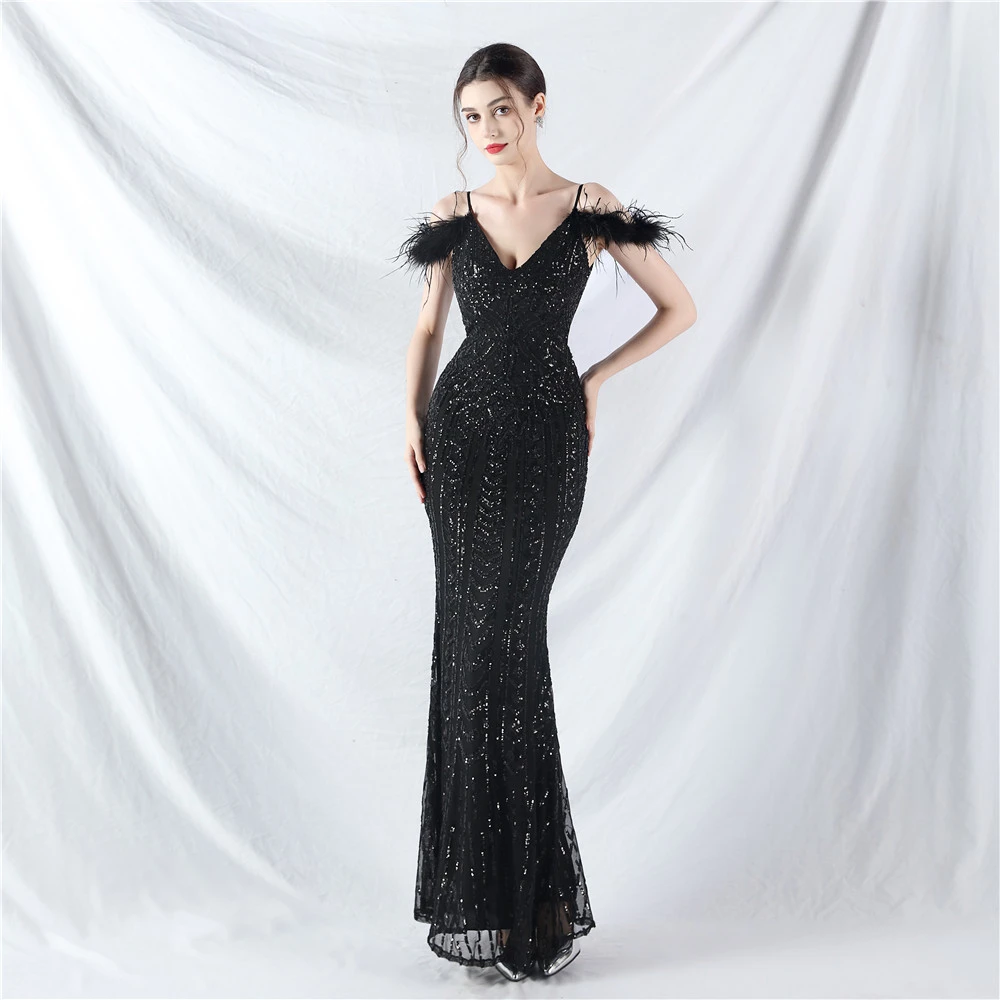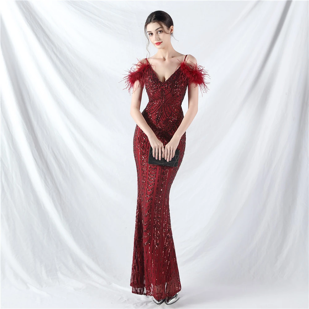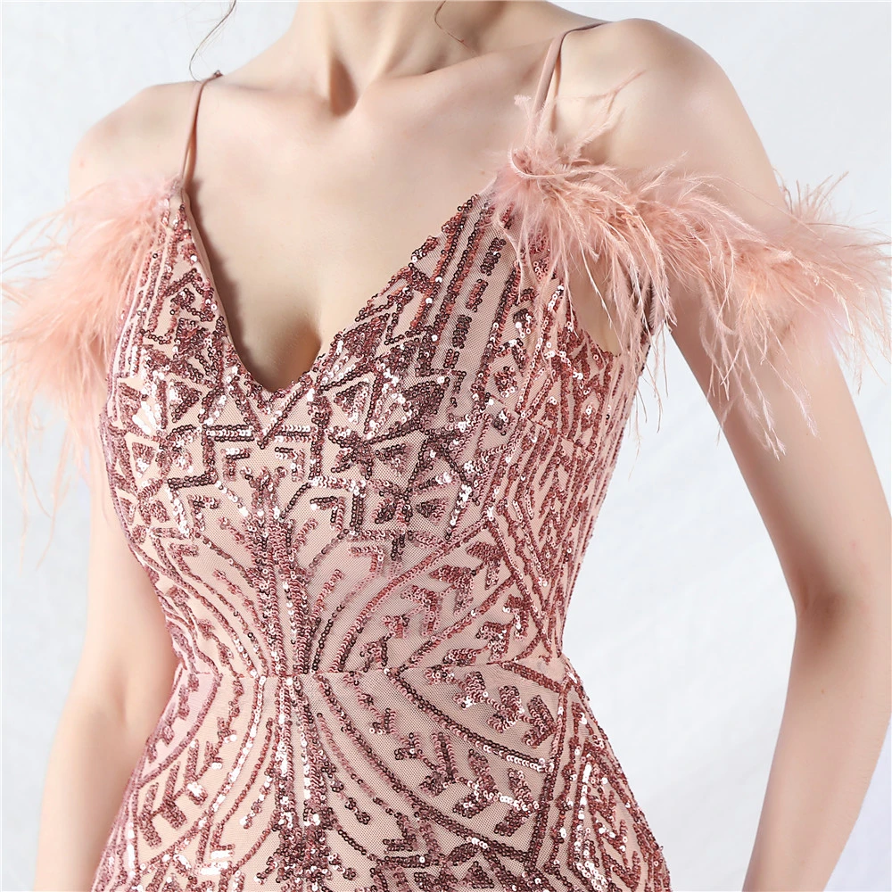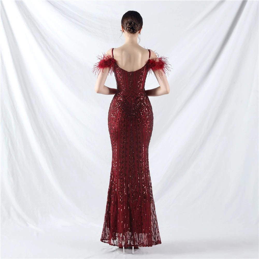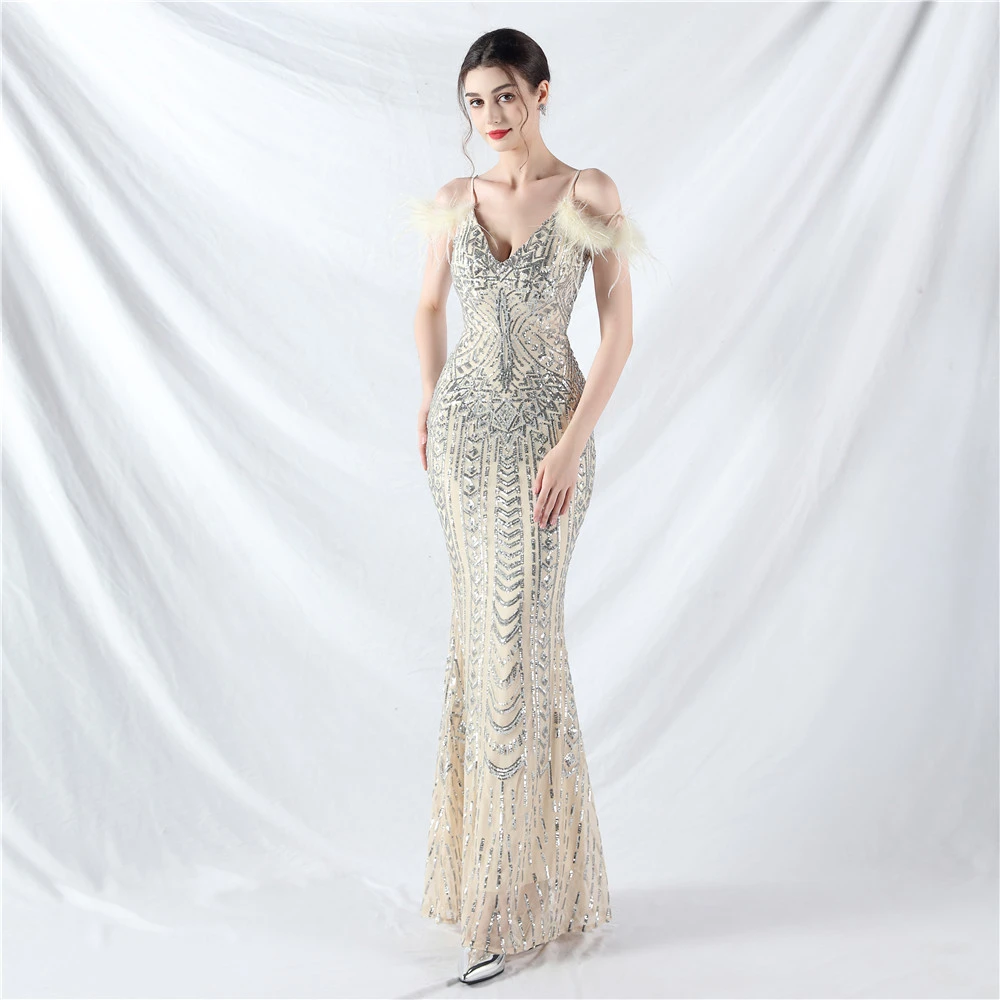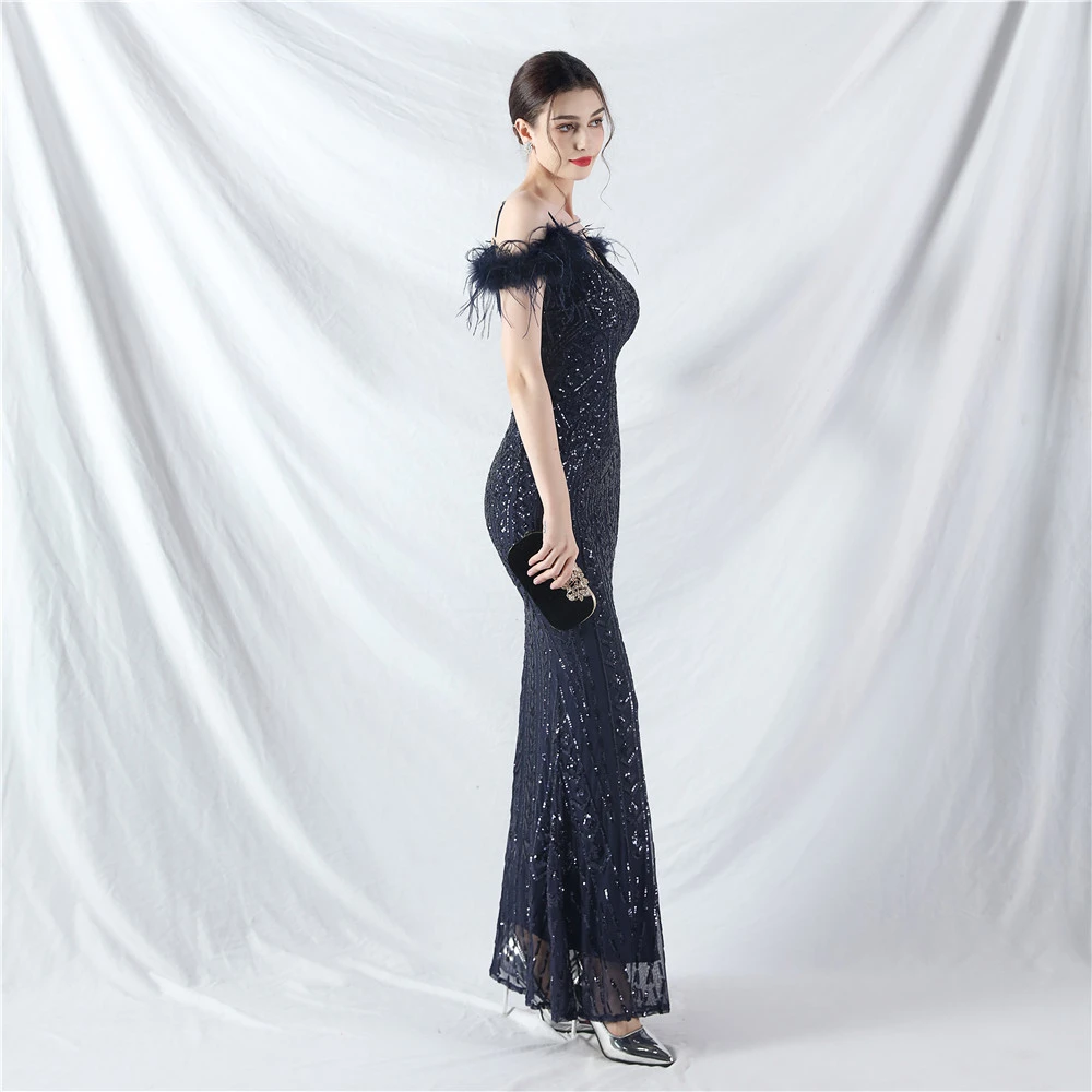 Positioned Flower Beads Crafted Ostrich Feather High-End Evening Dress