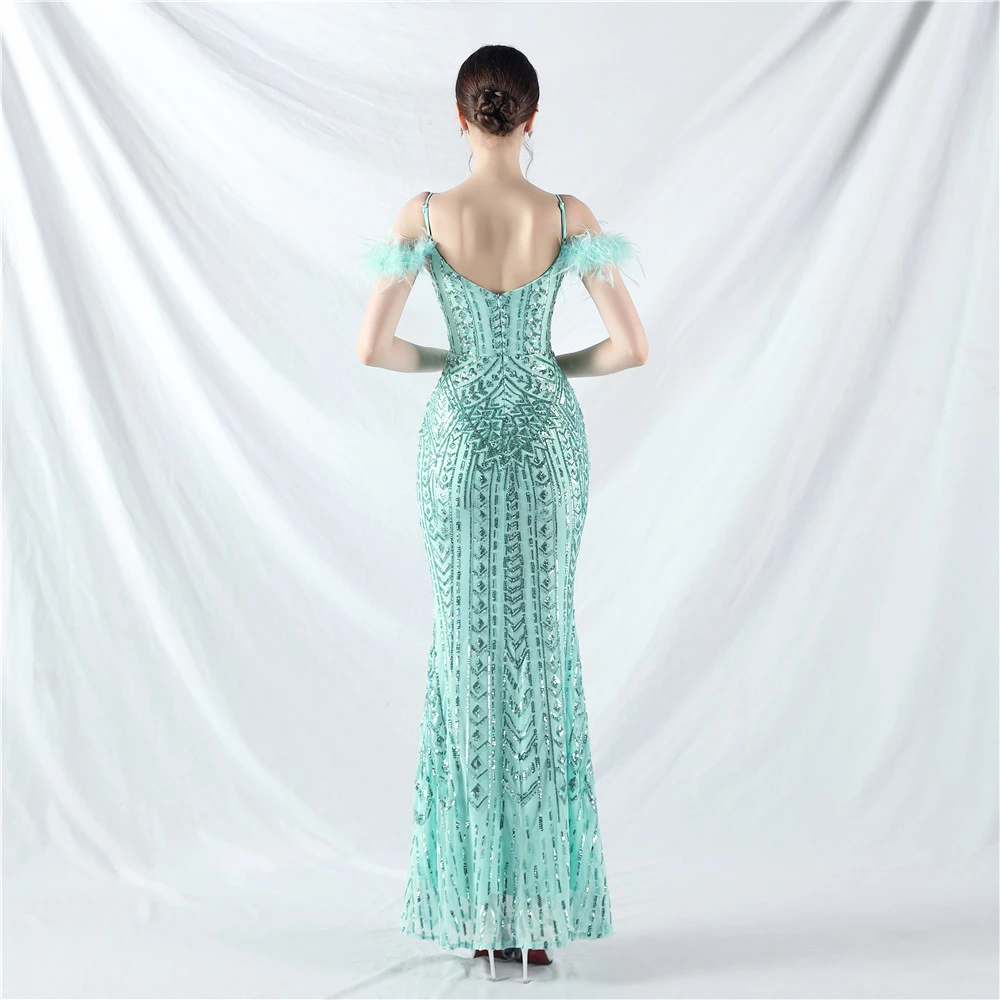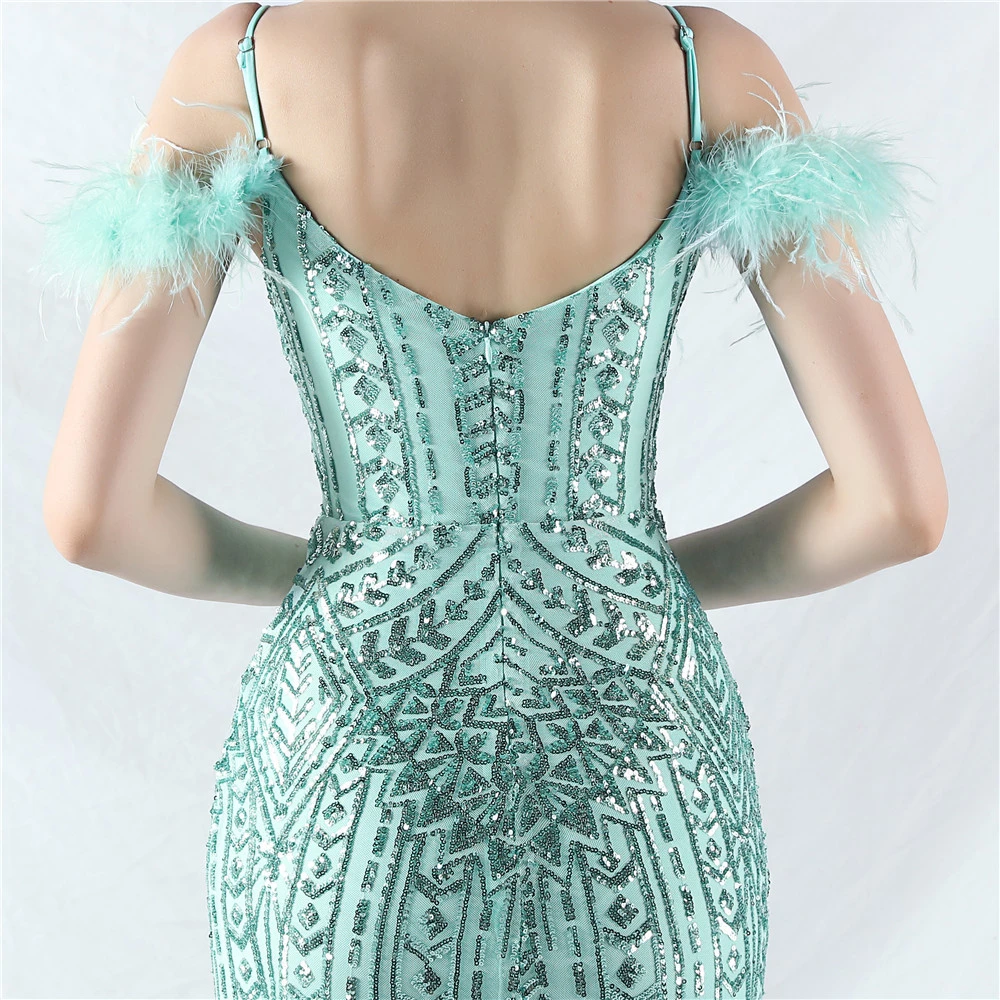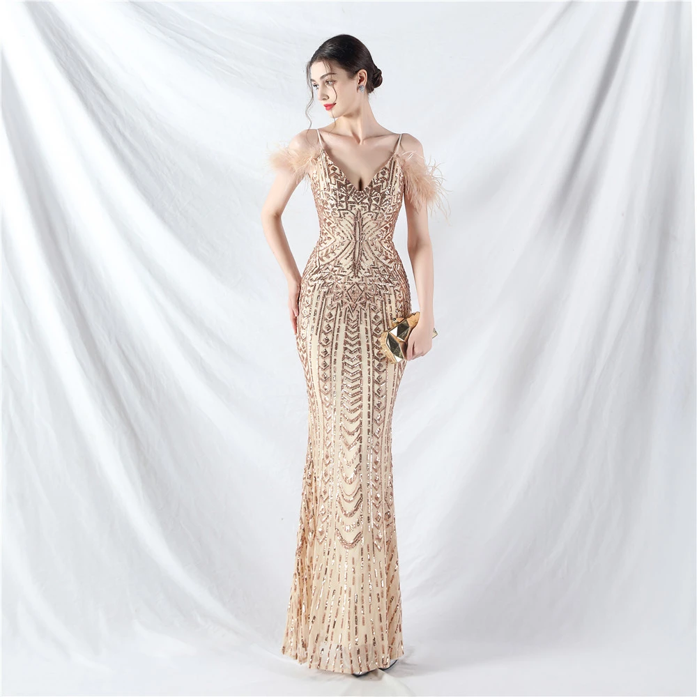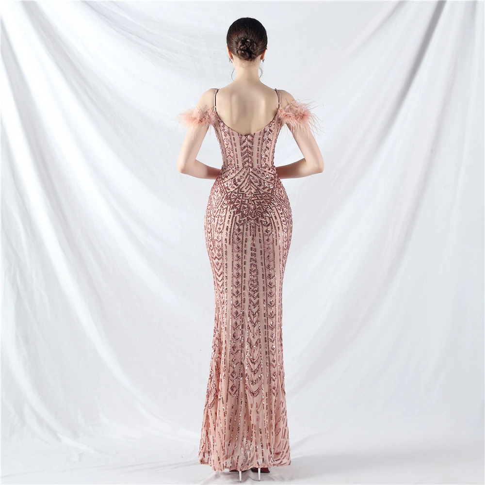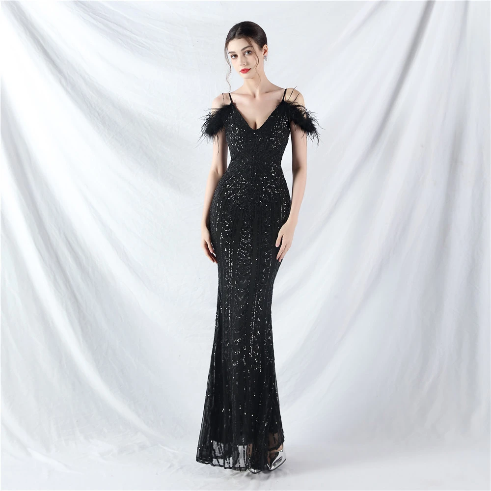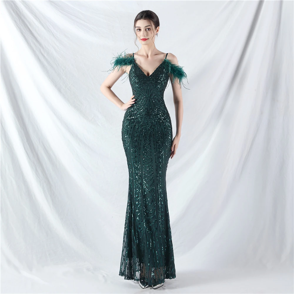 Positioned Flower Beads Crafted Ostrich Feather High-End Evening Dress