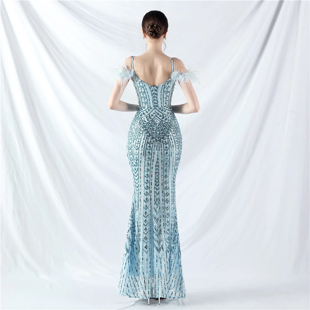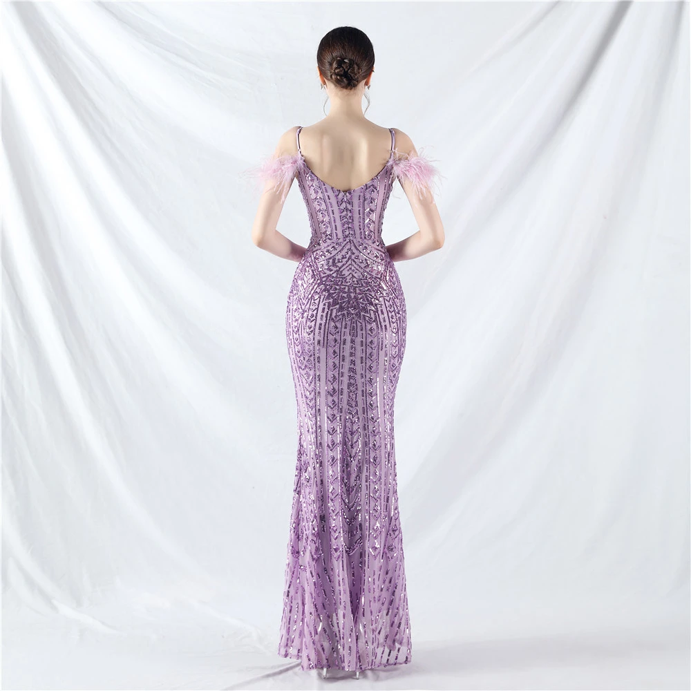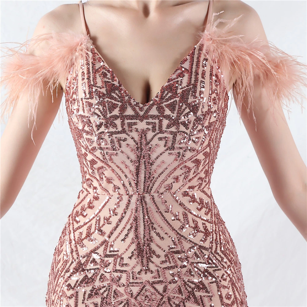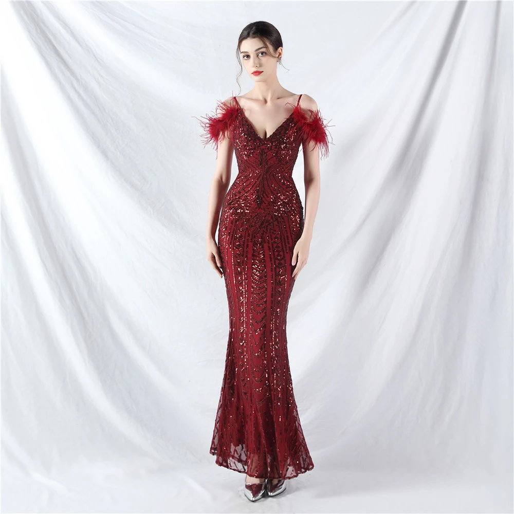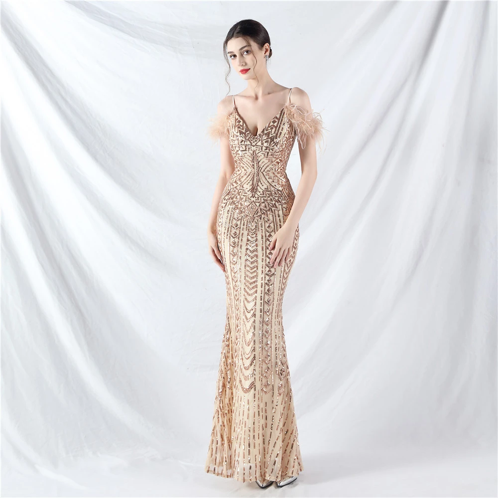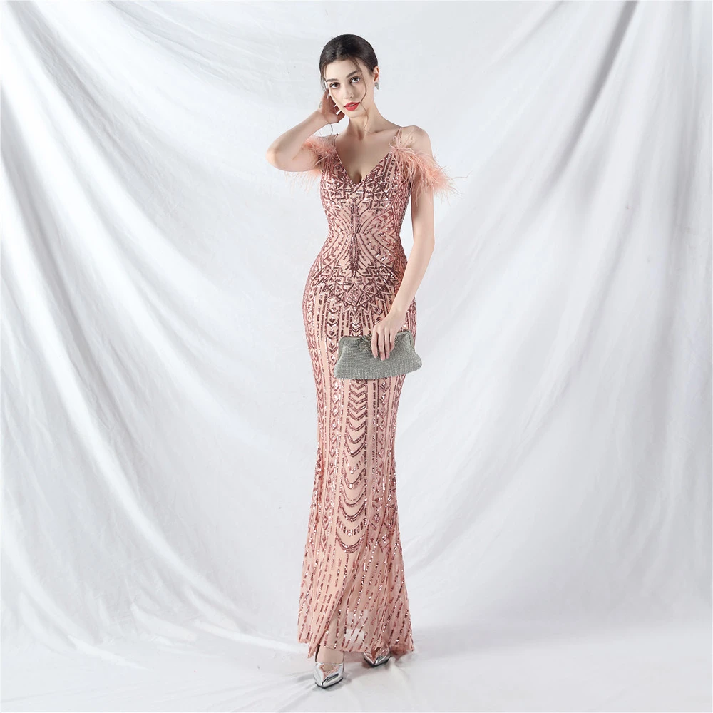 Positioned Flower Beads Crafted Ostrich Feather High-End Evening Dress