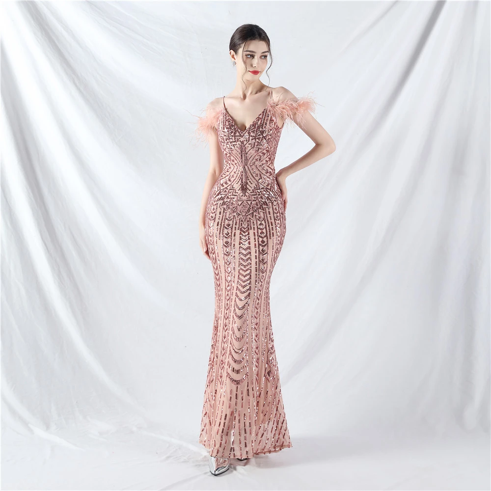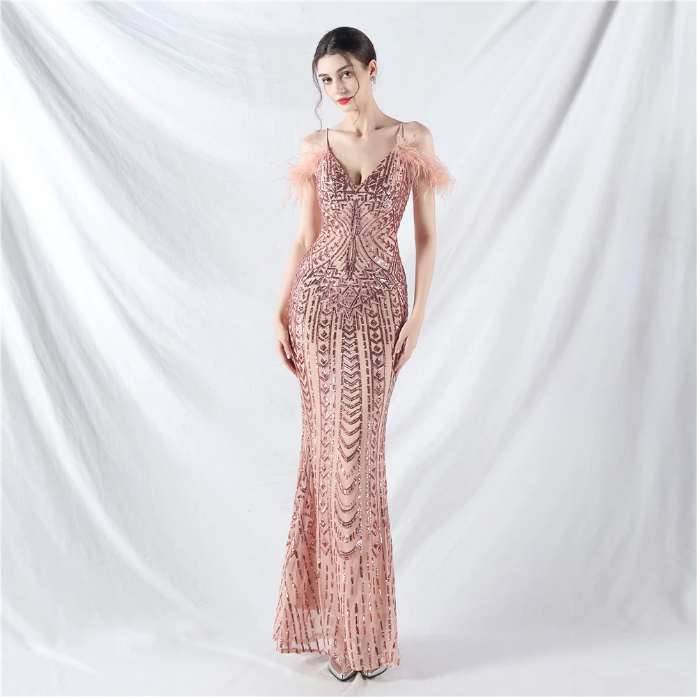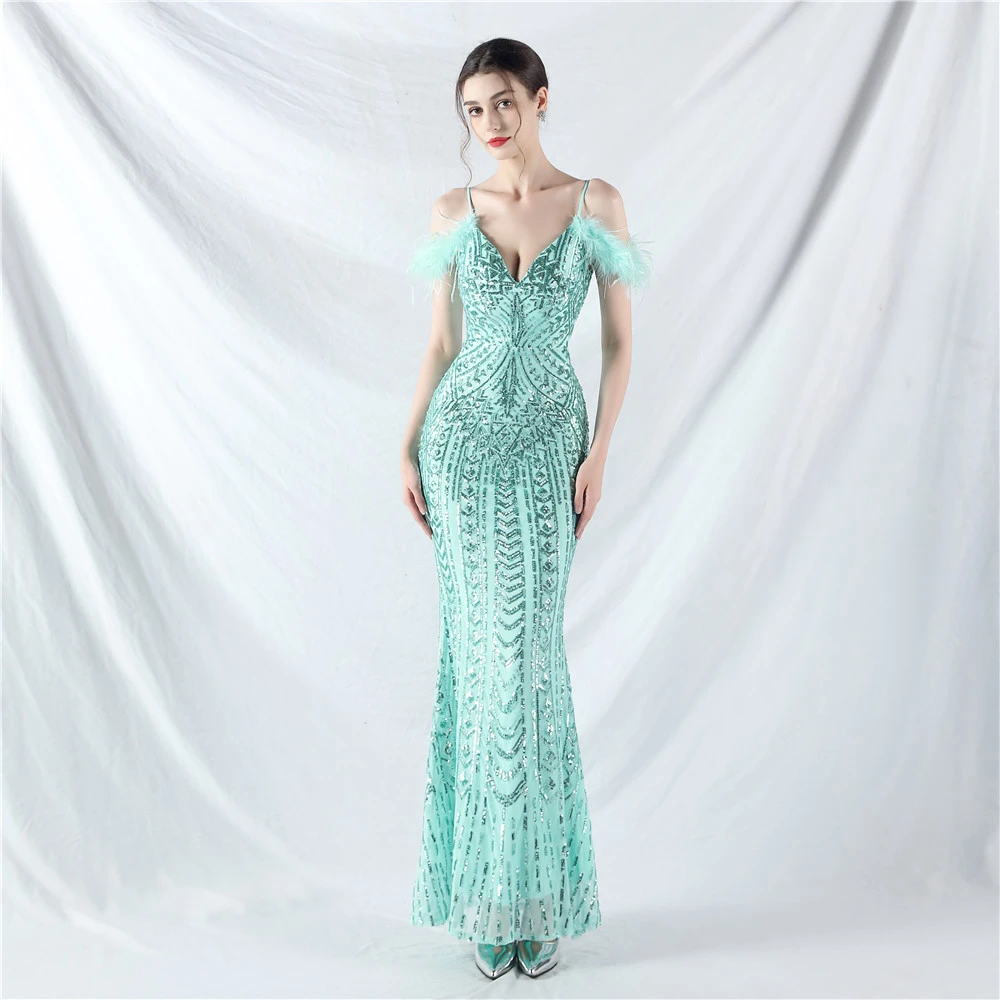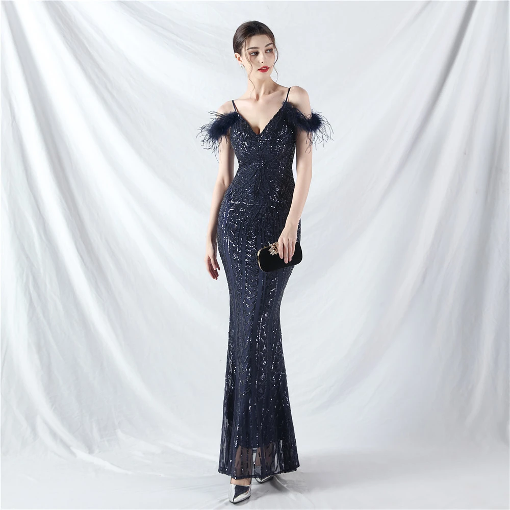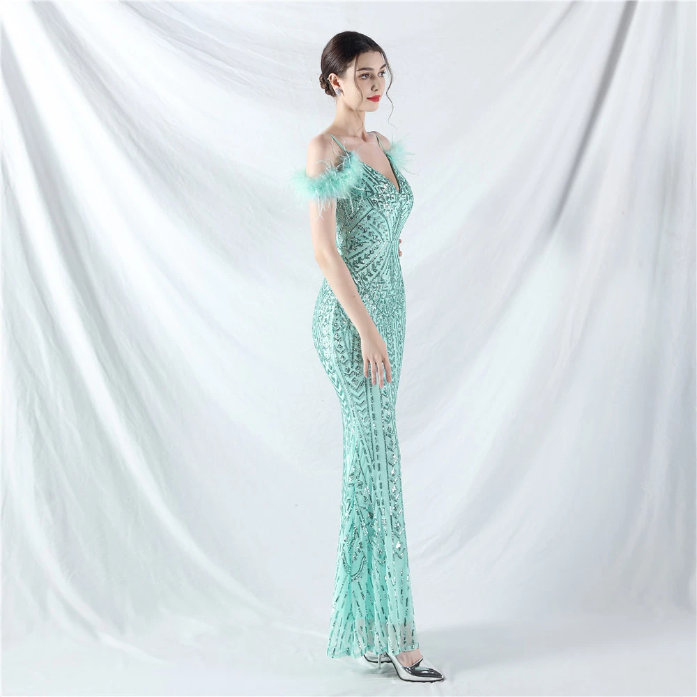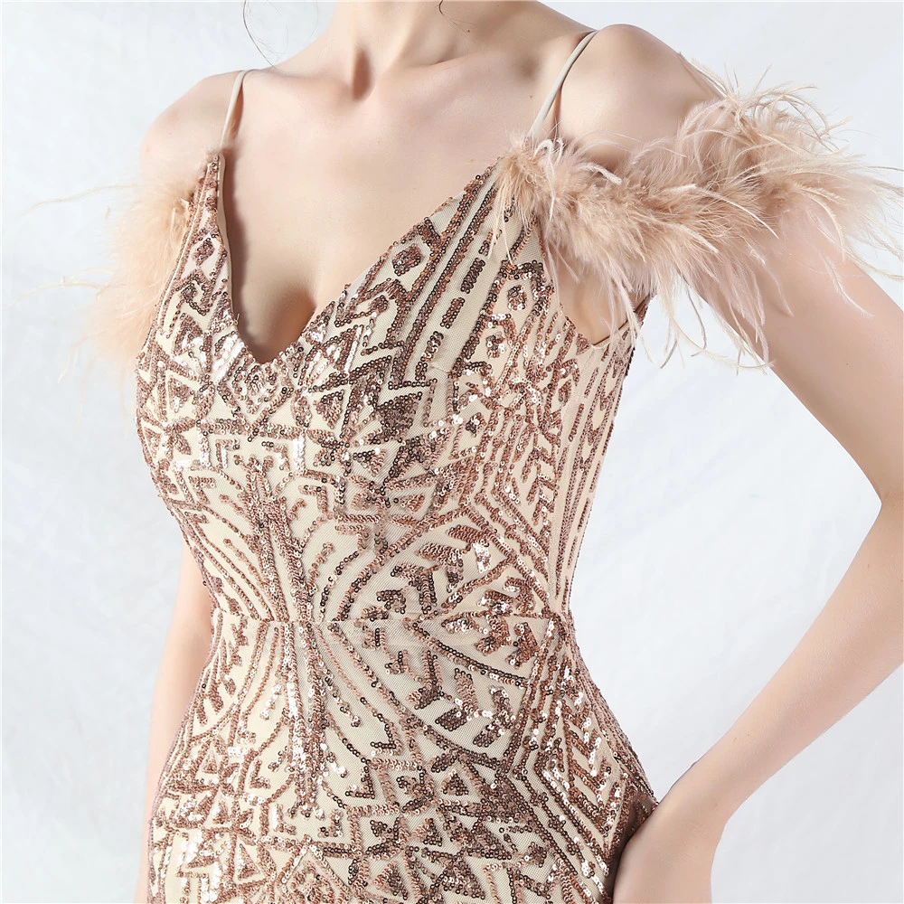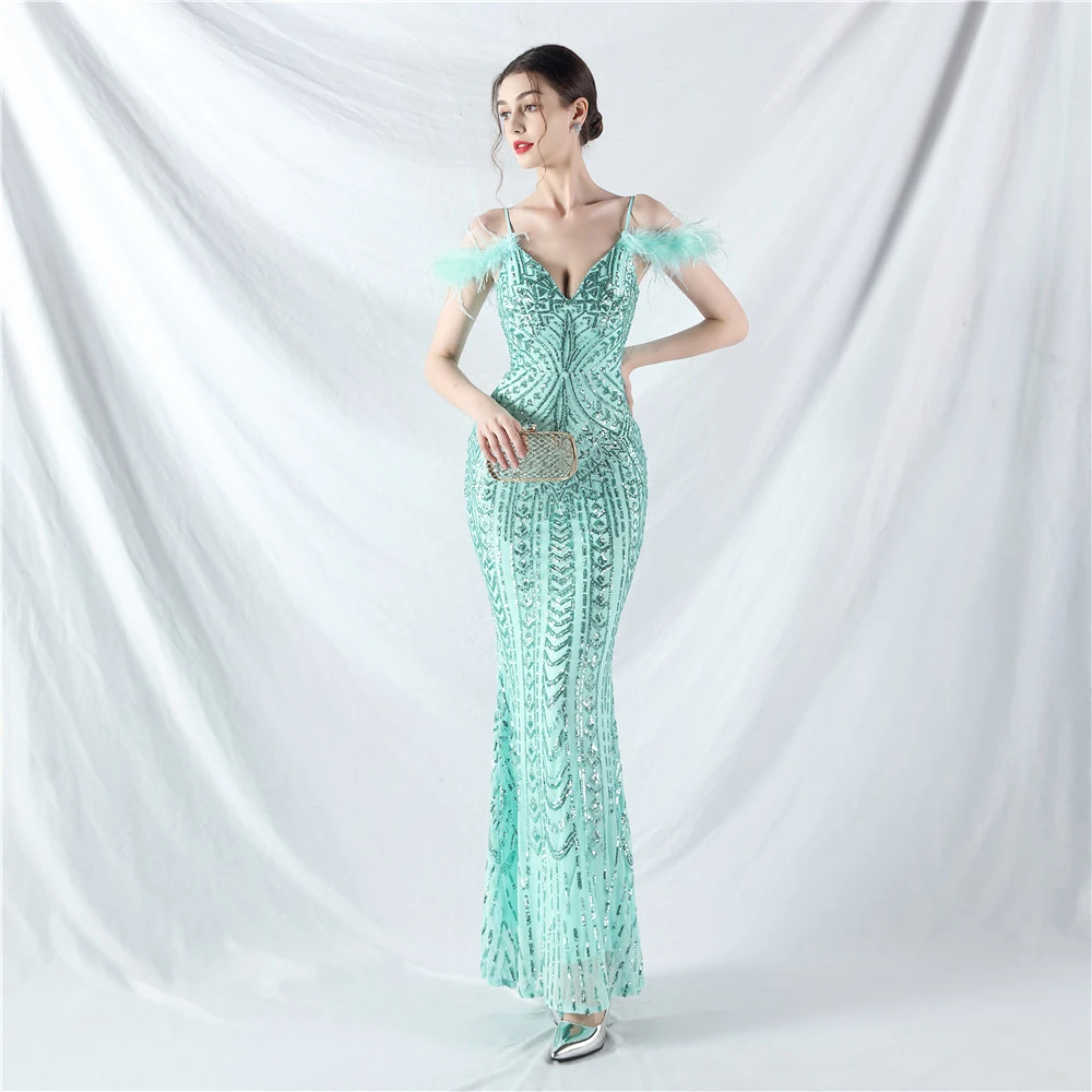 Positioned Flower Beads Crafted Ostrich Feather High-End Evening Dress