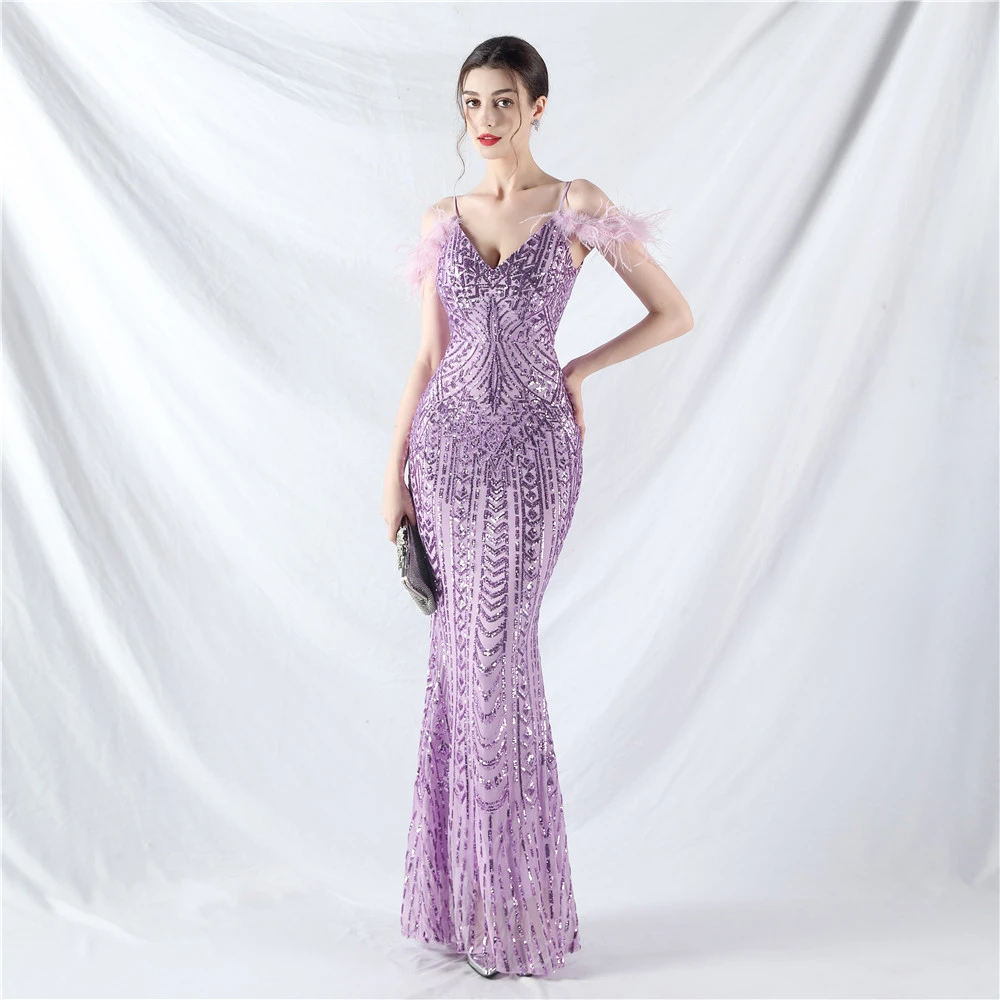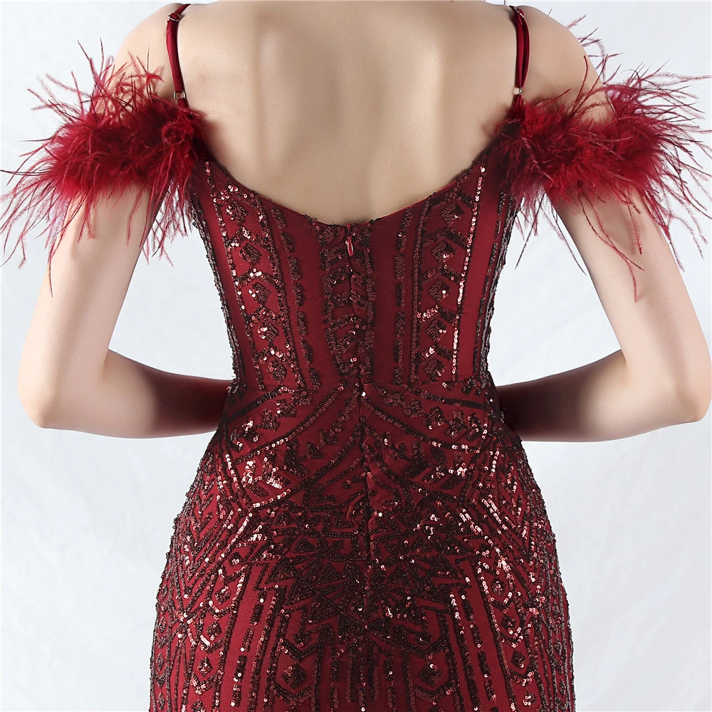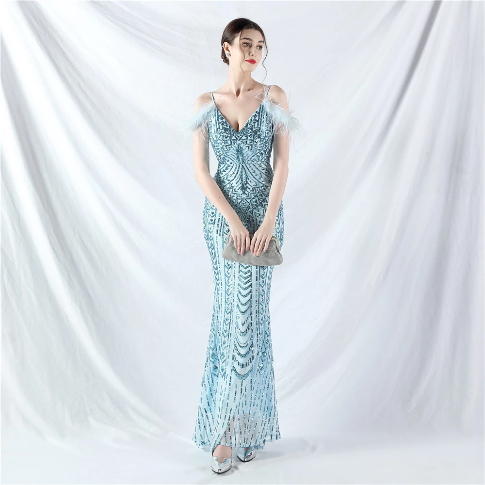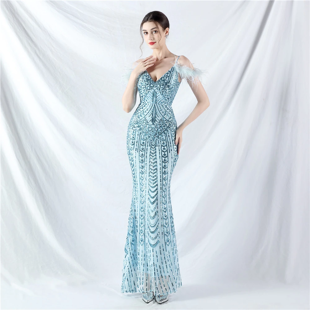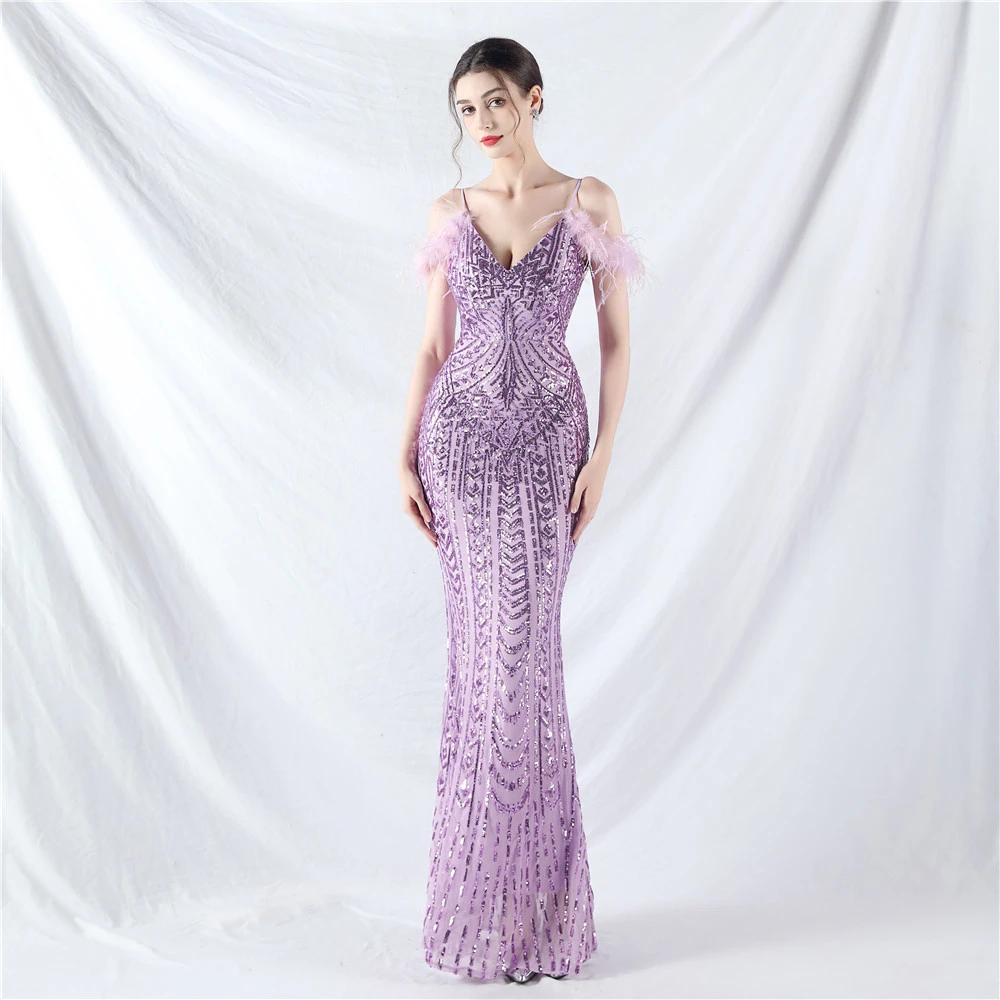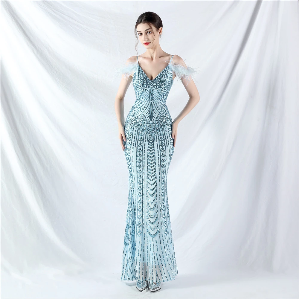 Positioned Flower Beads Crafted Ostrich Feather High-End Evening Dress
