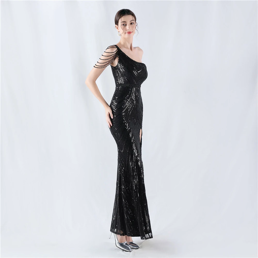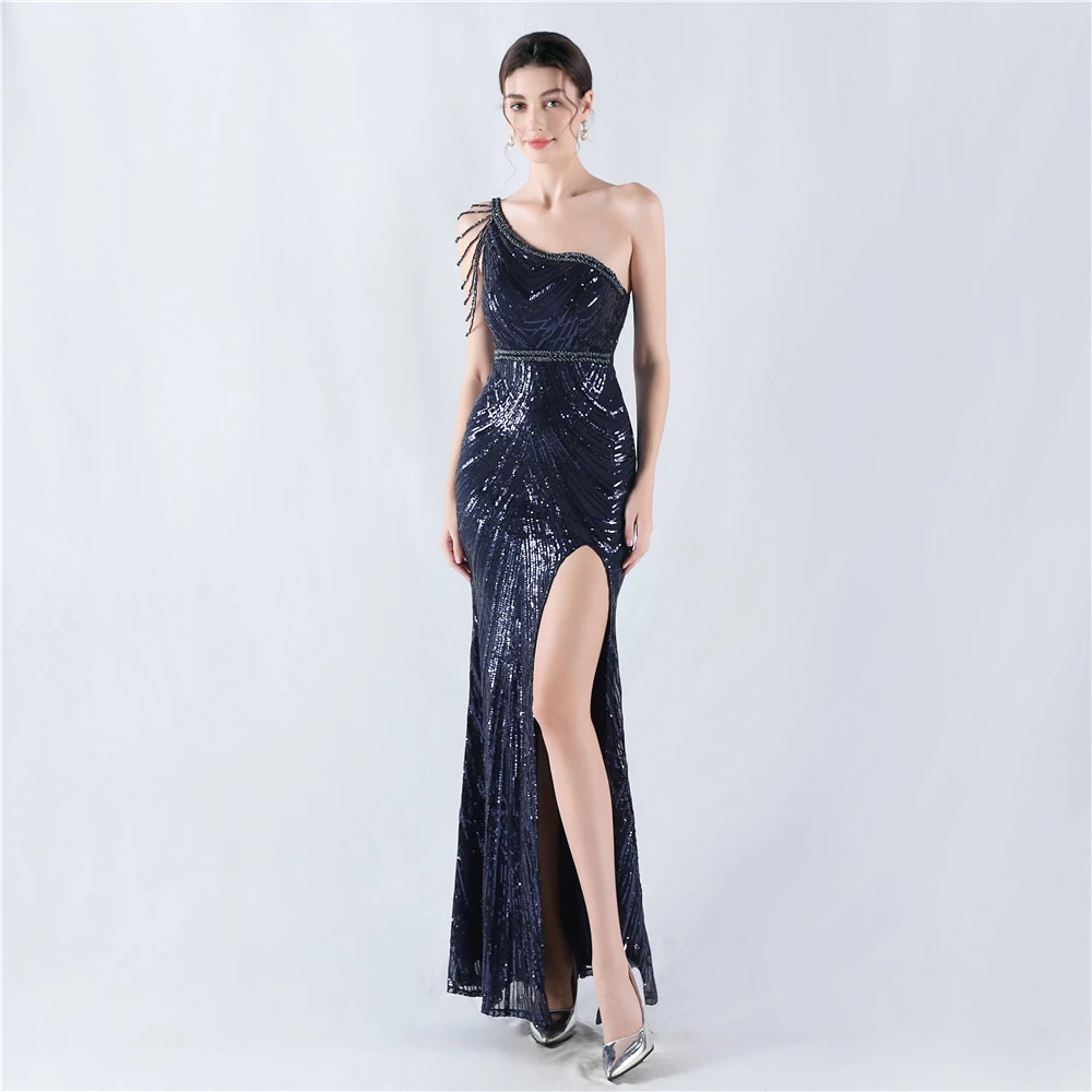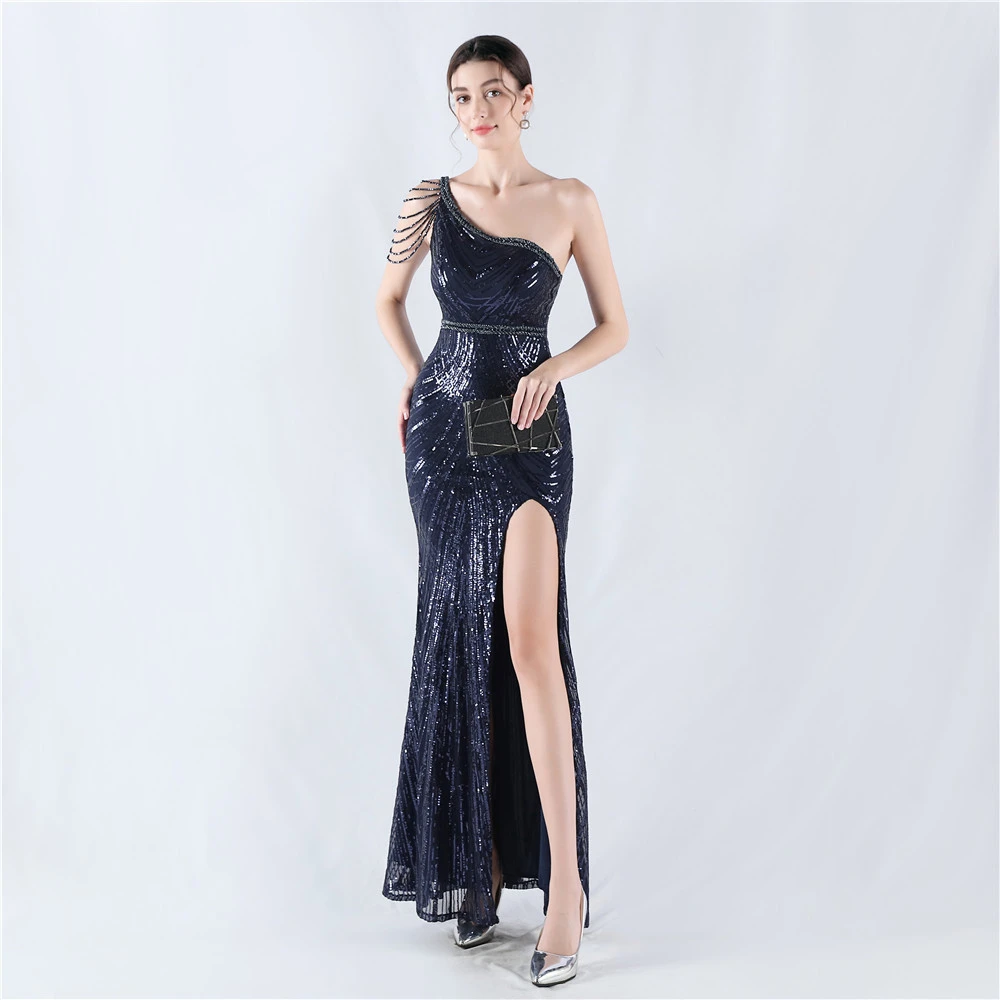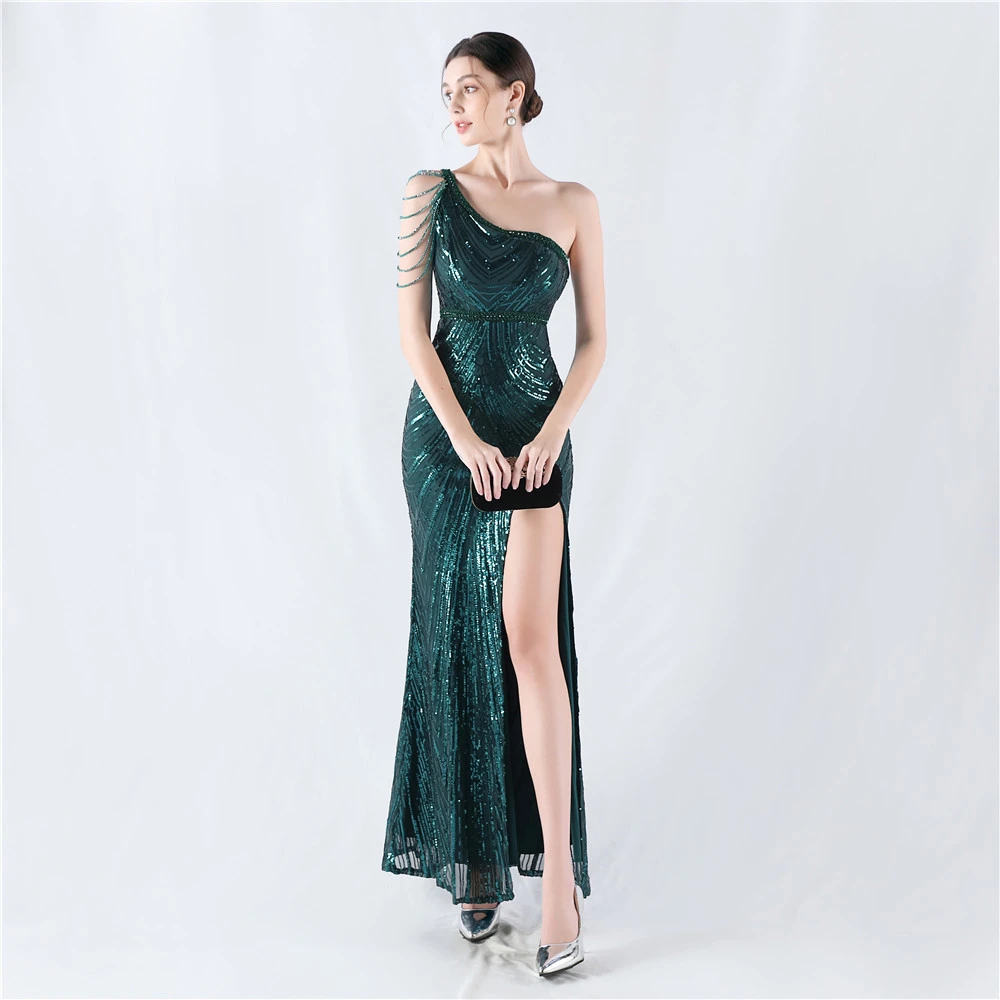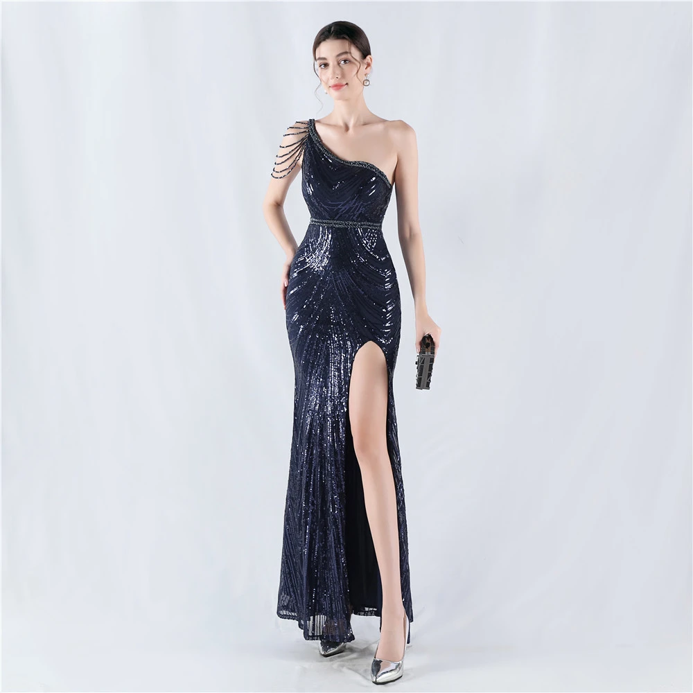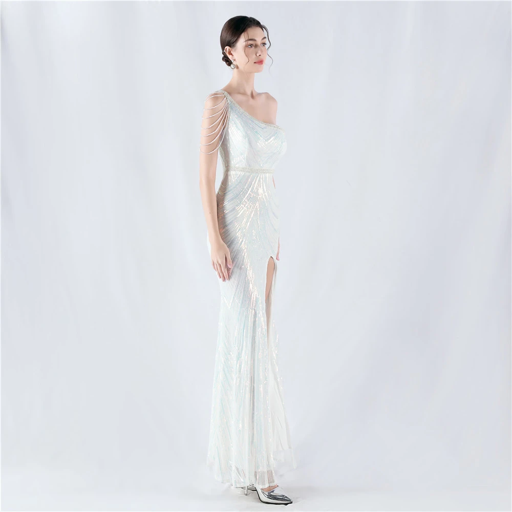 Positioning Flower Beaded Craft Beaded One-Shoulder Oblique Collar High Slit Evening Dress