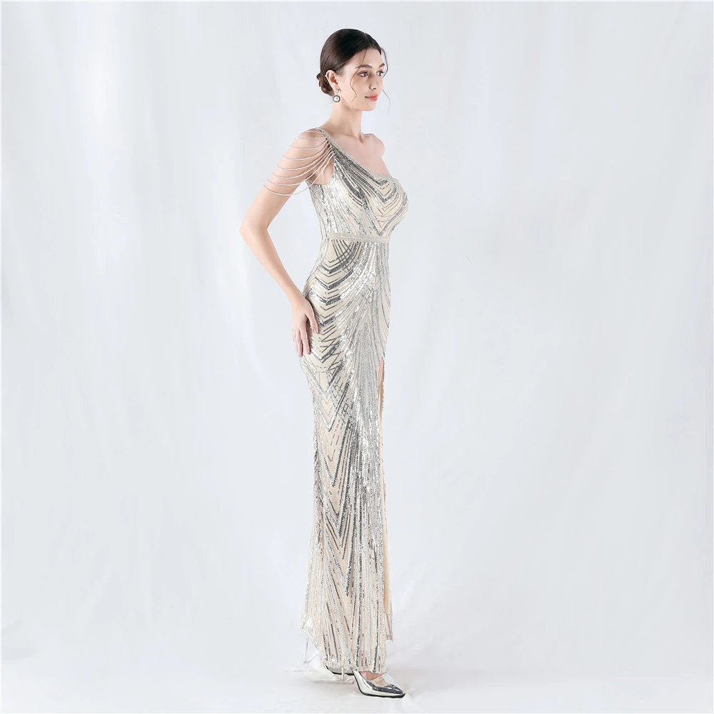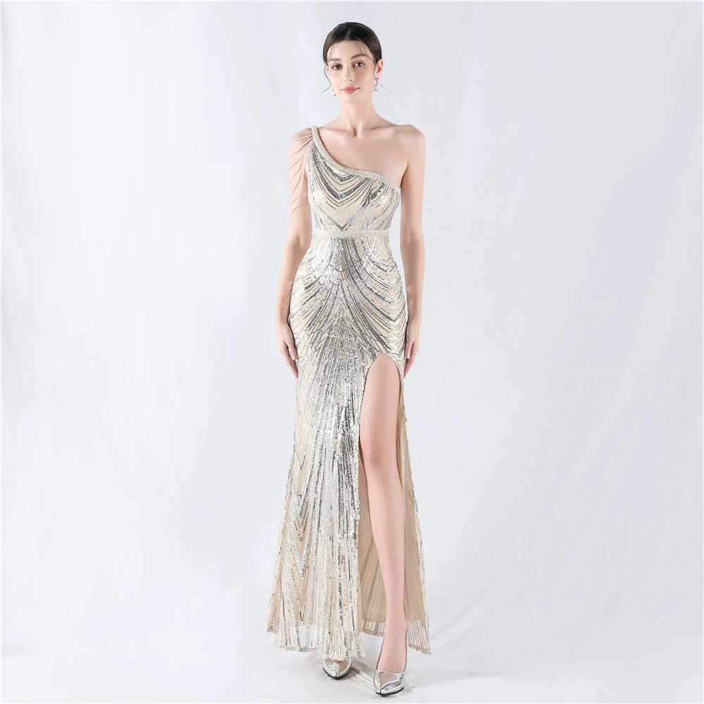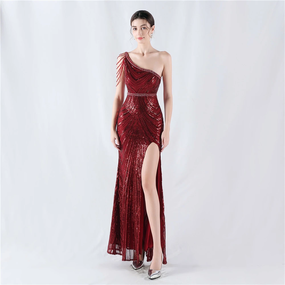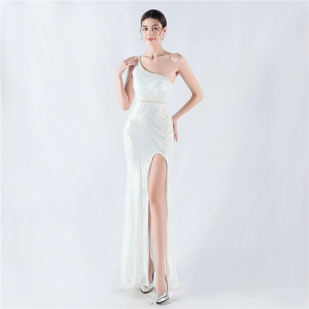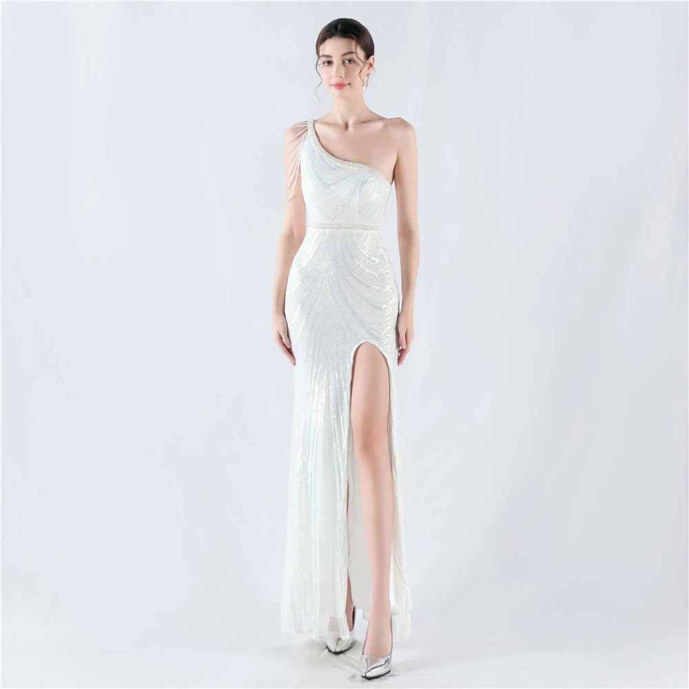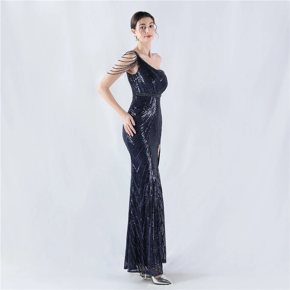 Positioning Flower Beaded Craft Beaded One-Shoulder Oblique Collar High Slit Evening Dress