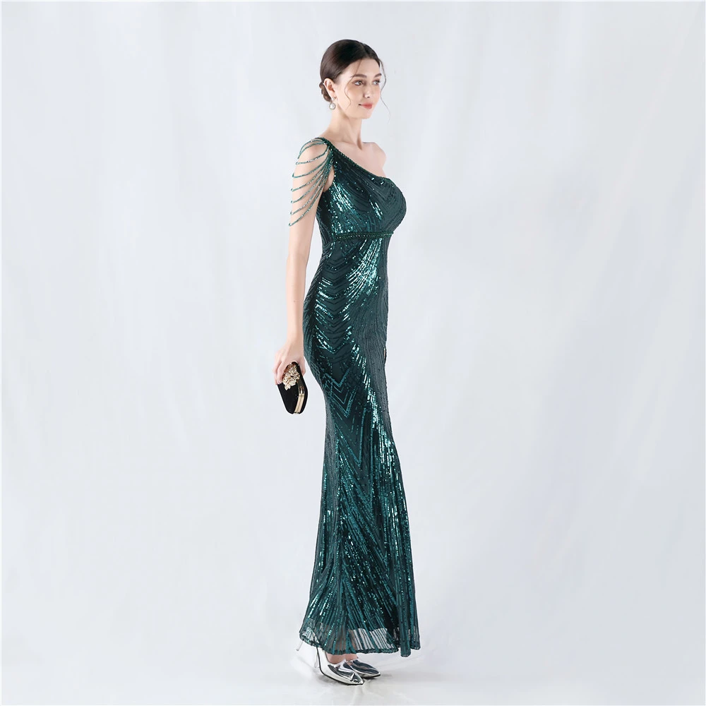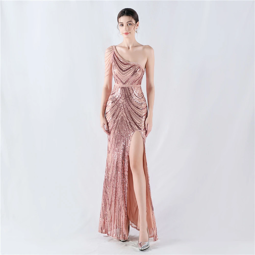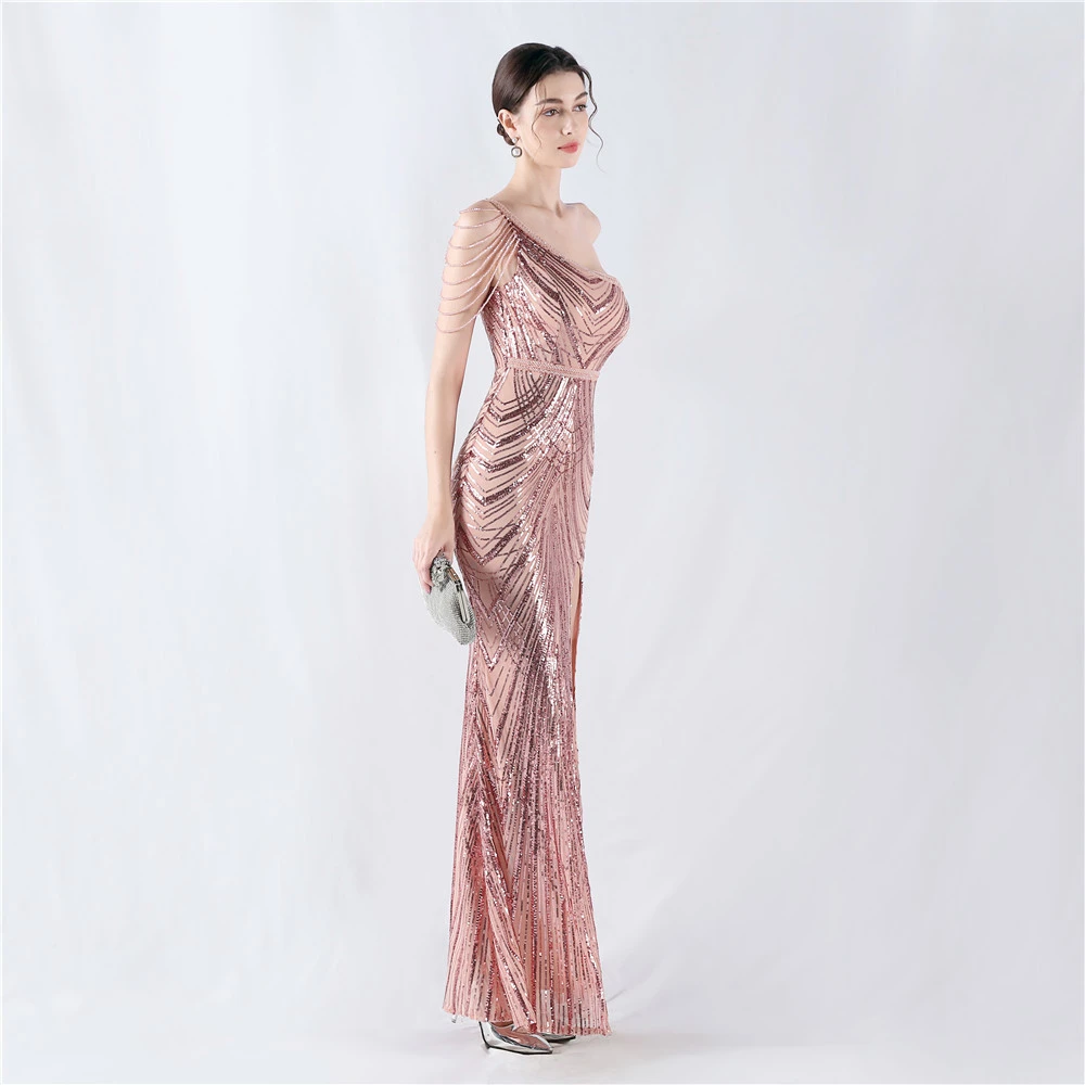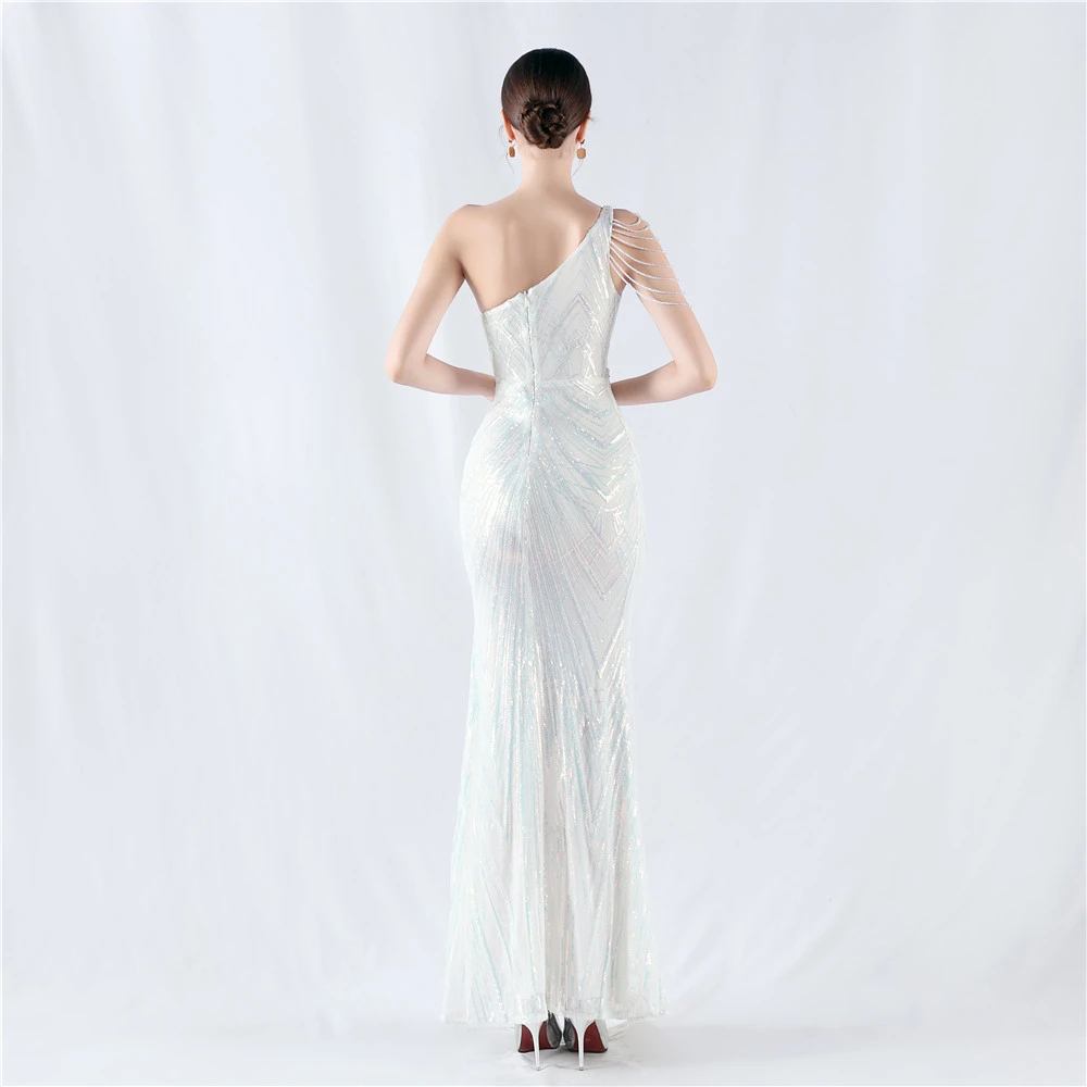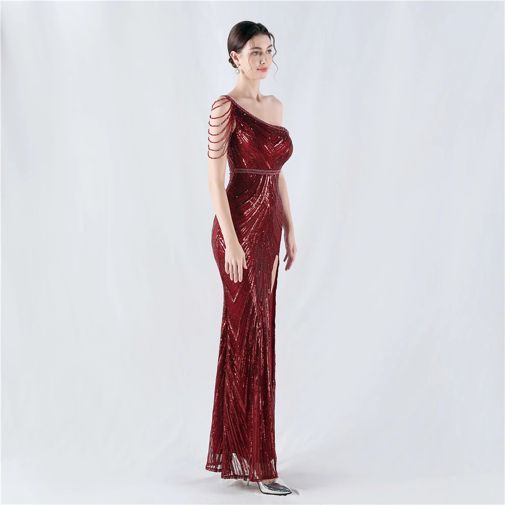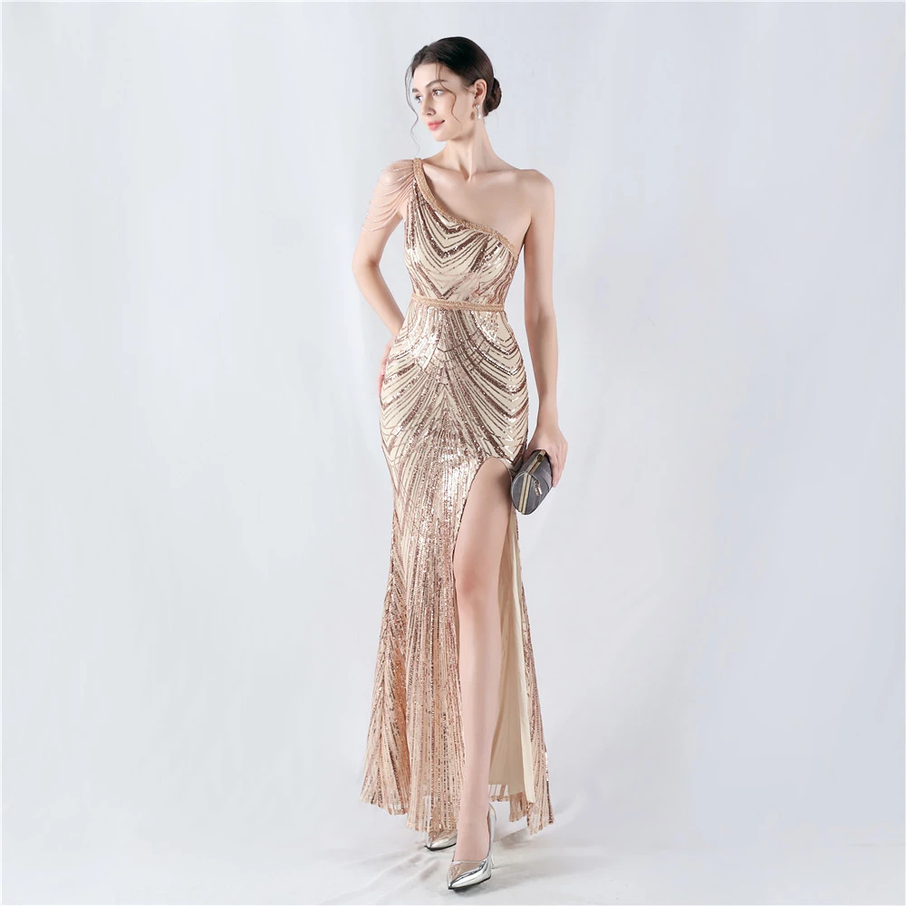 Positioning Flower Beaded Craft Beaded One-Shoulder Oblique Collar High Slit Evening Dress