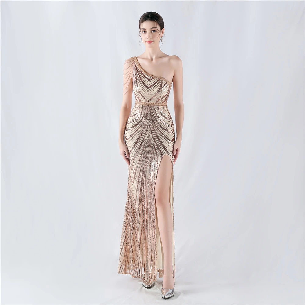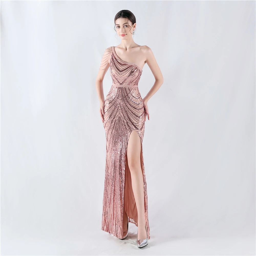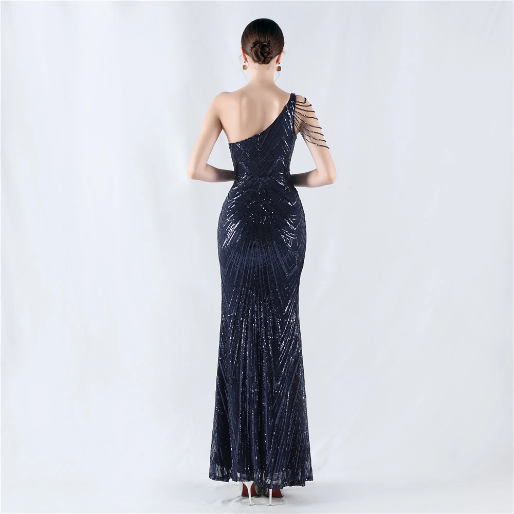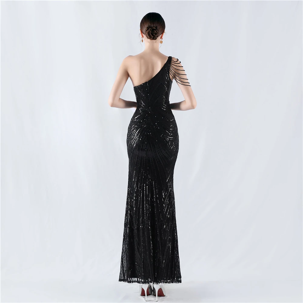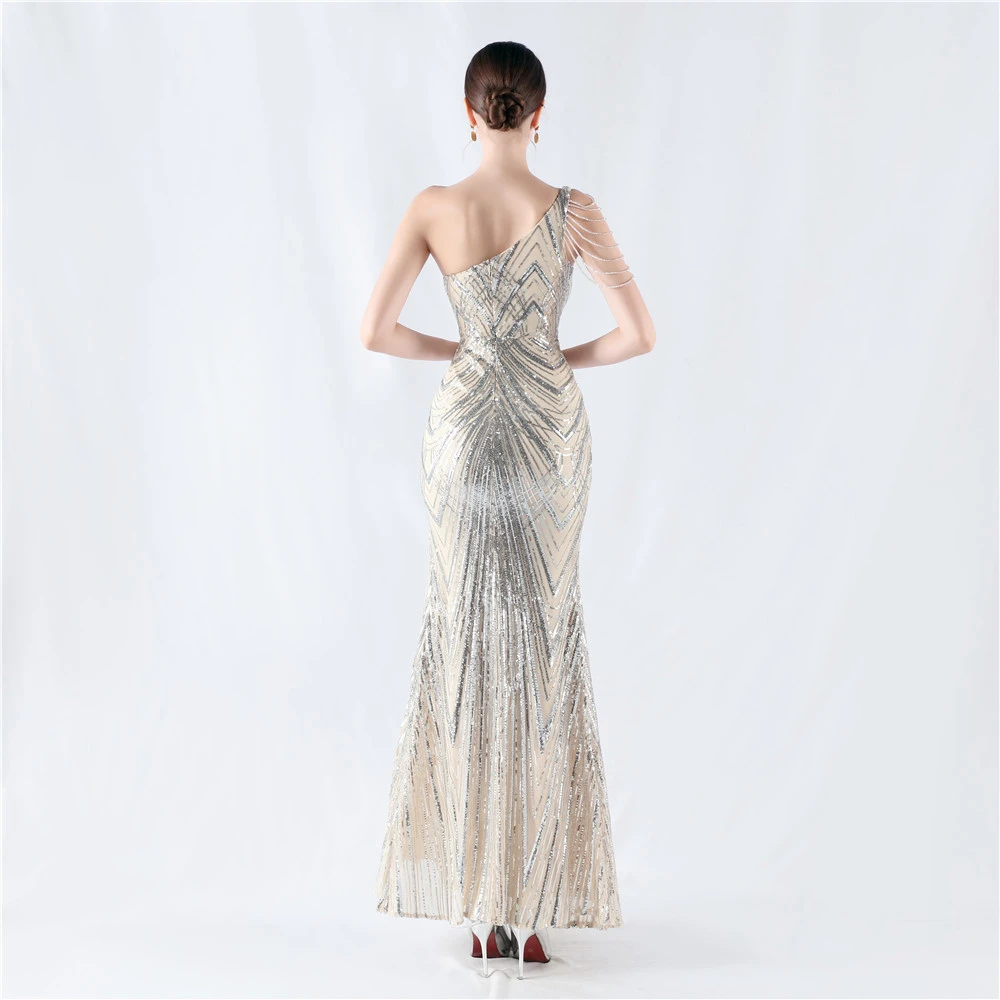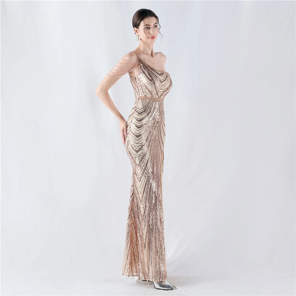 Positioning Flower Beaded Craft Beaded One-Shoulder Oblique Collar High Slit Evening Dress