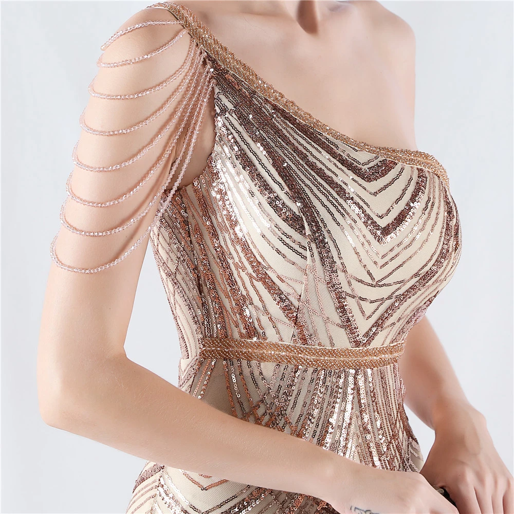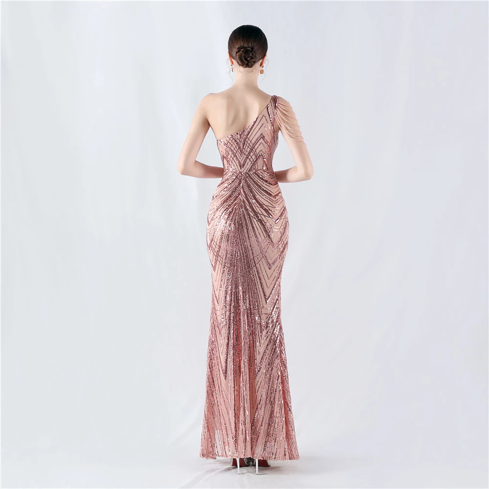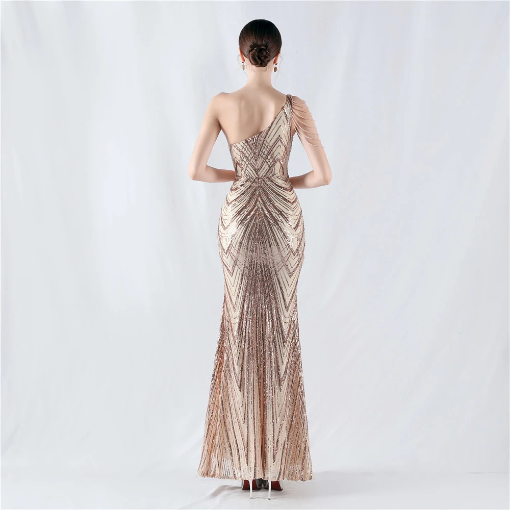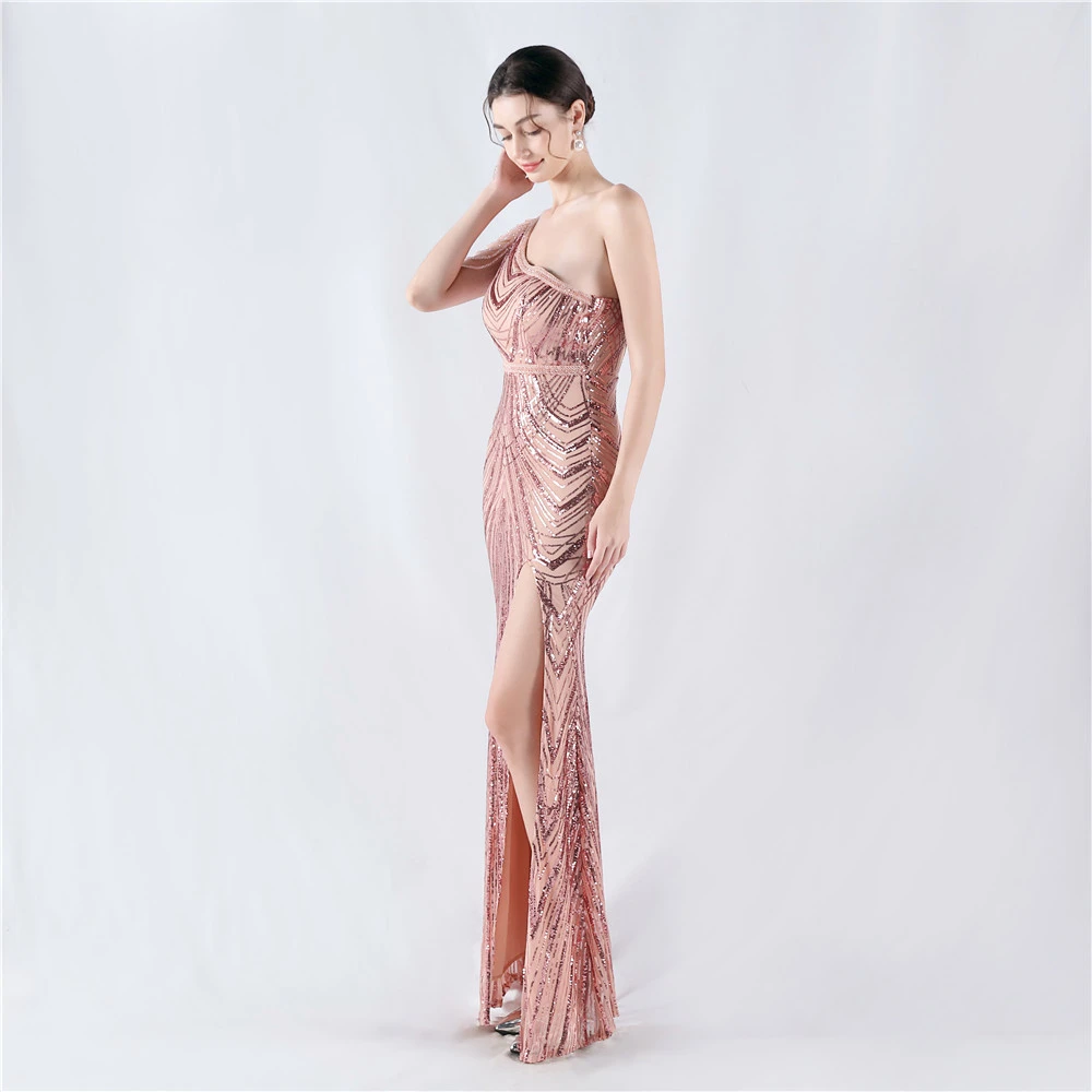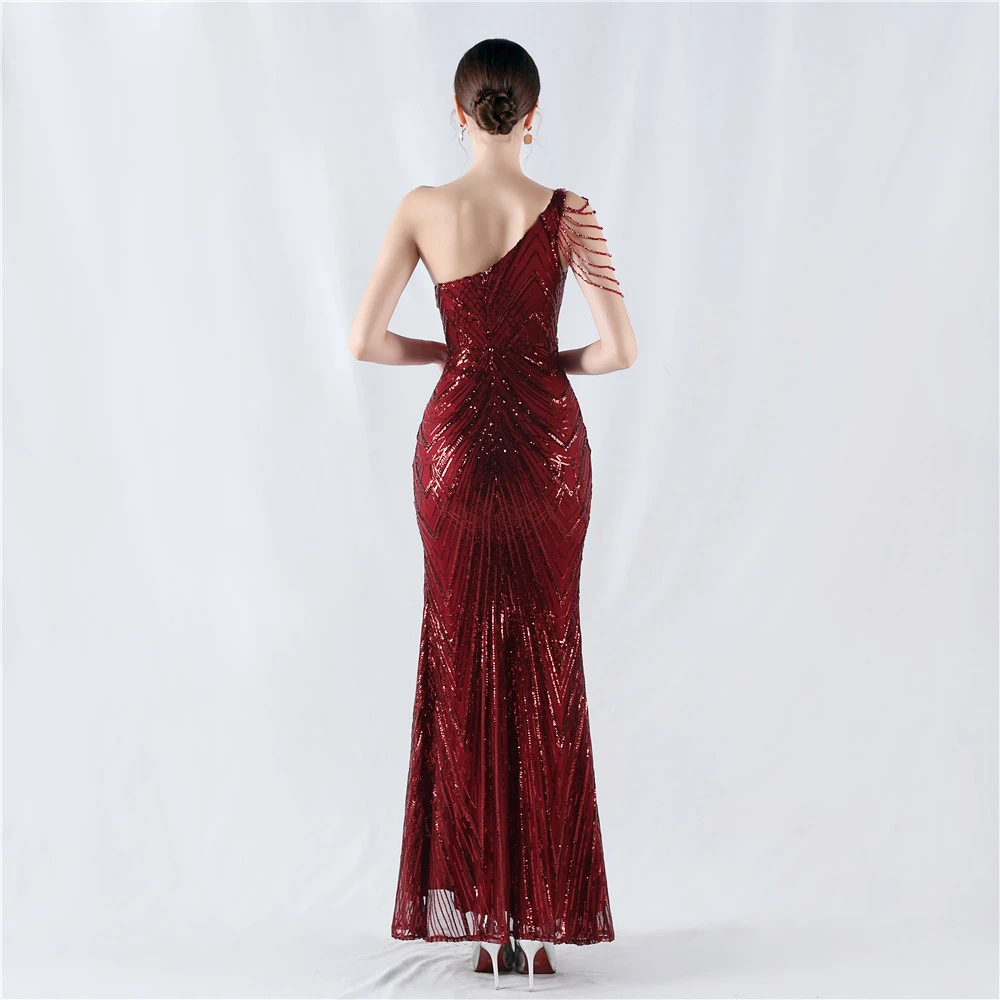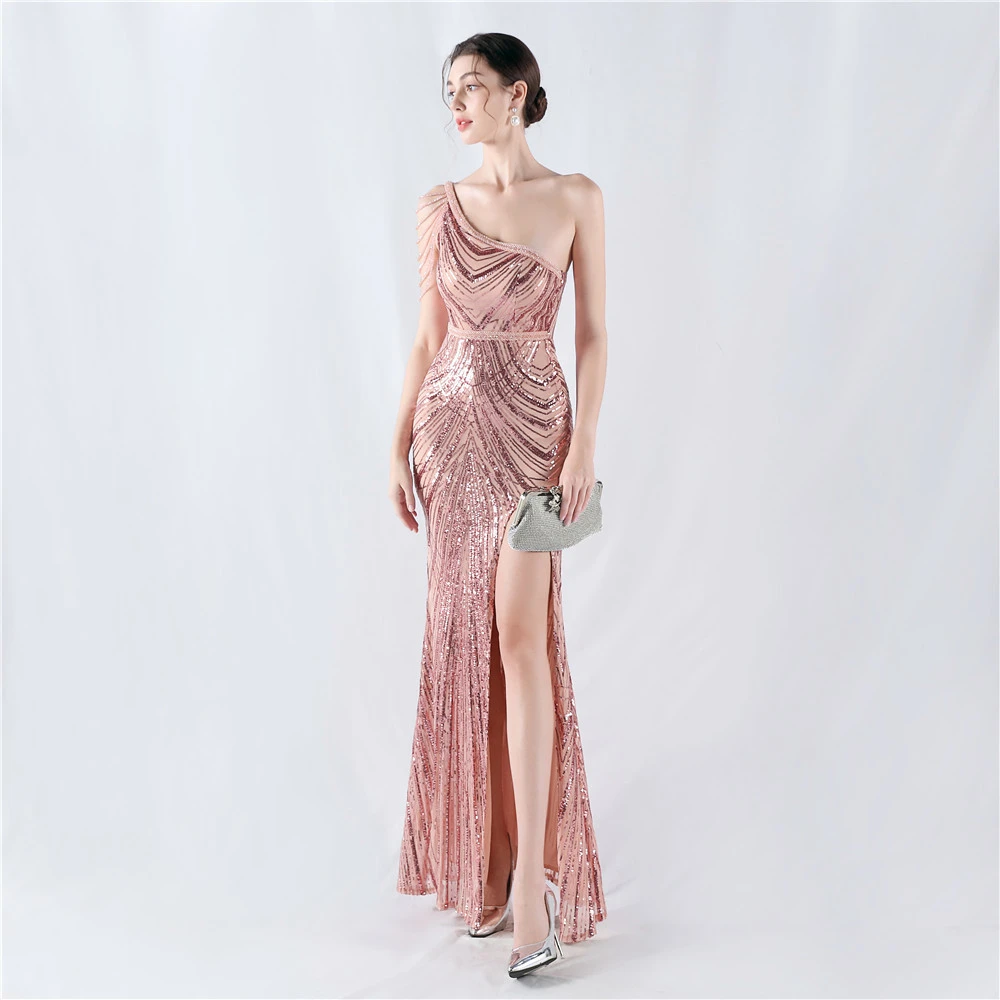 Positioning Flower Beaded Craft Beaded One-Shoulder Oblique Collar High Slit Evening Dress