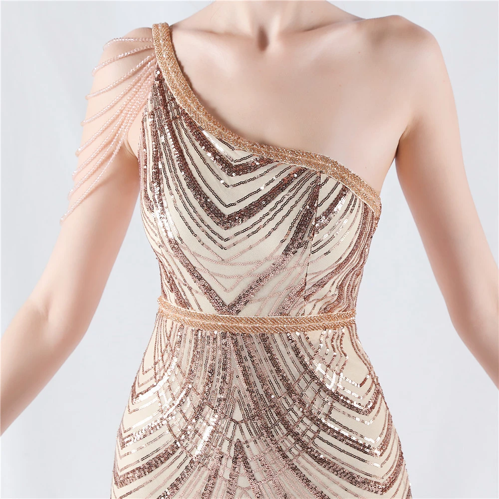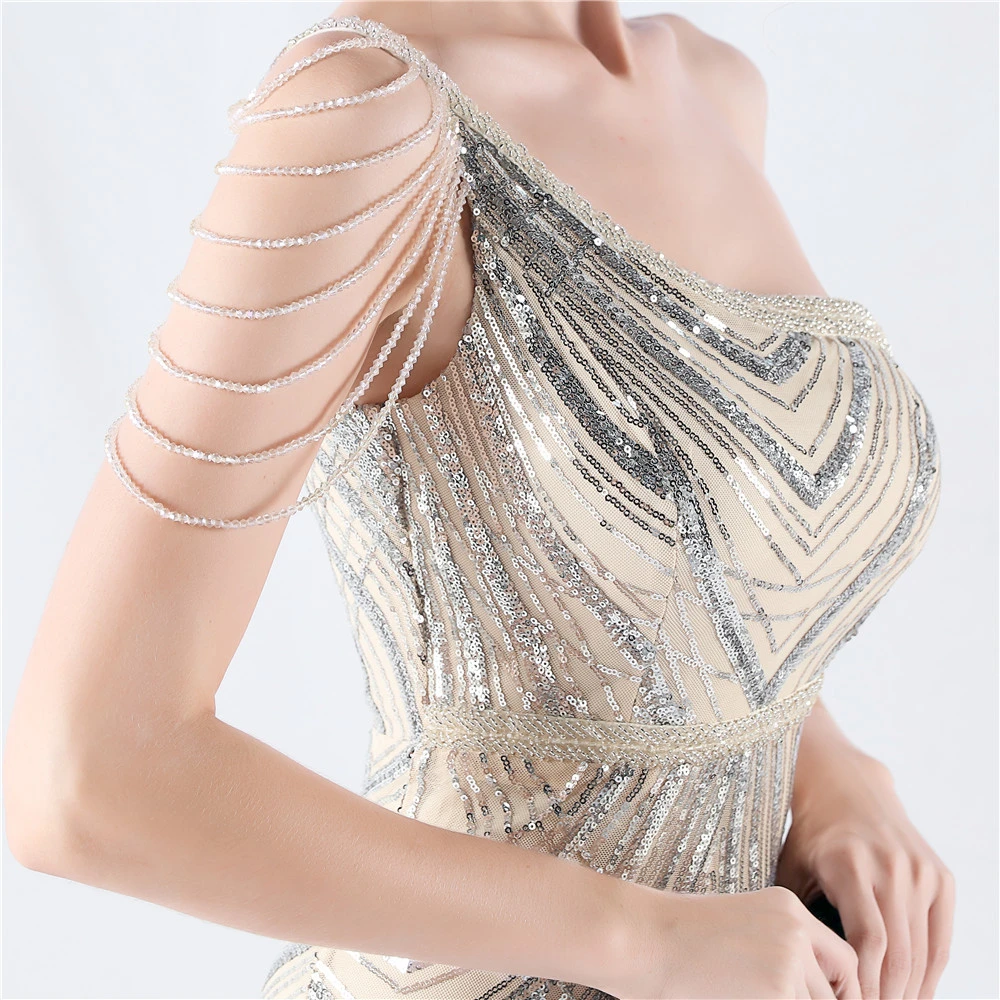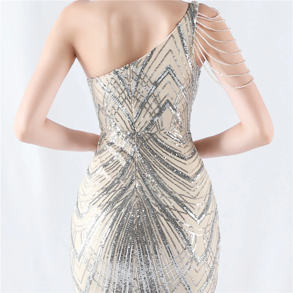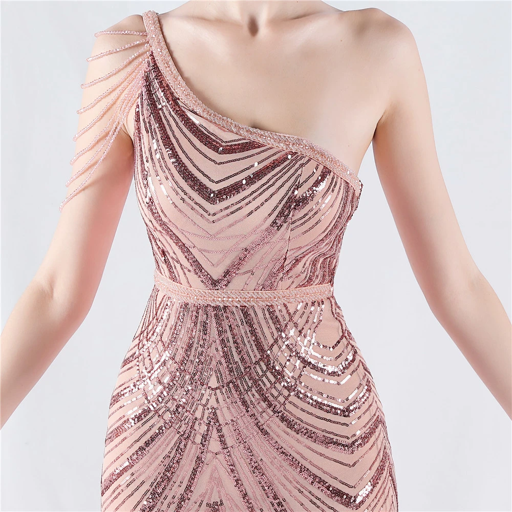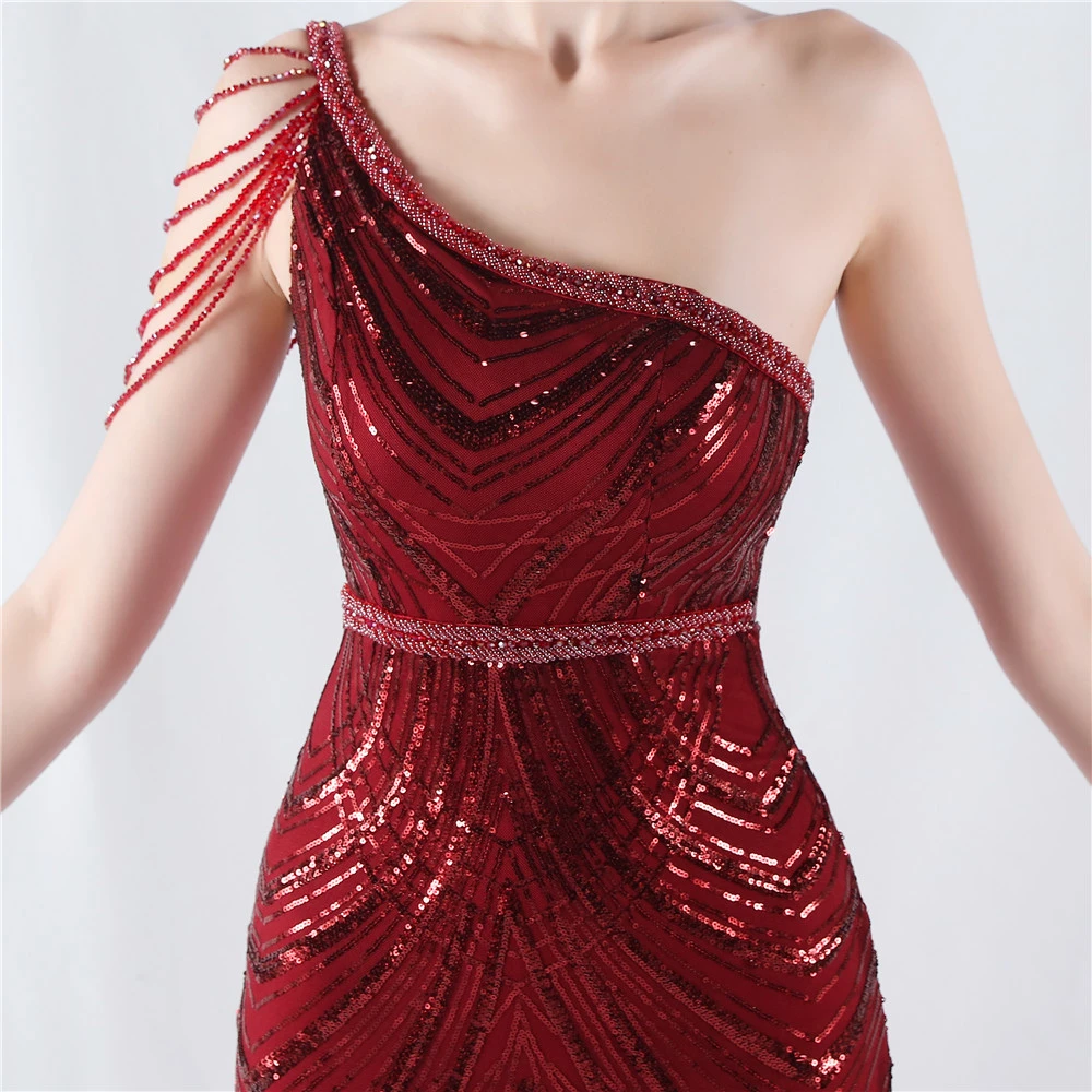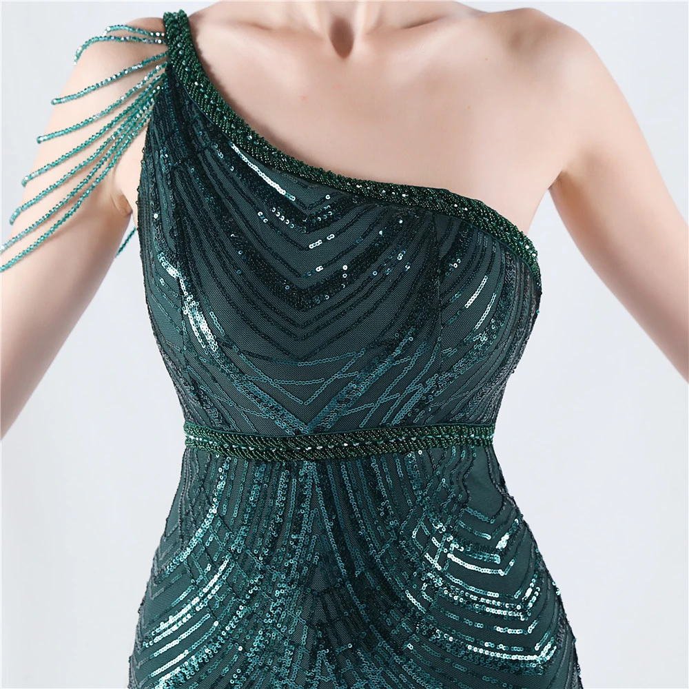 Positioning Flower Beaded Craft Beaded One-Shoulder Oblique Collar High Slit Evening Dress