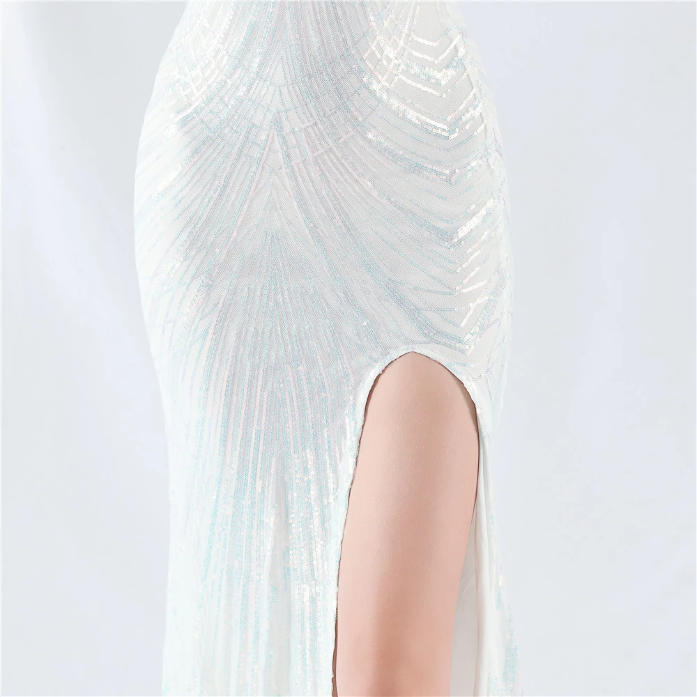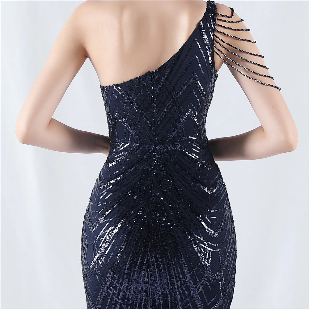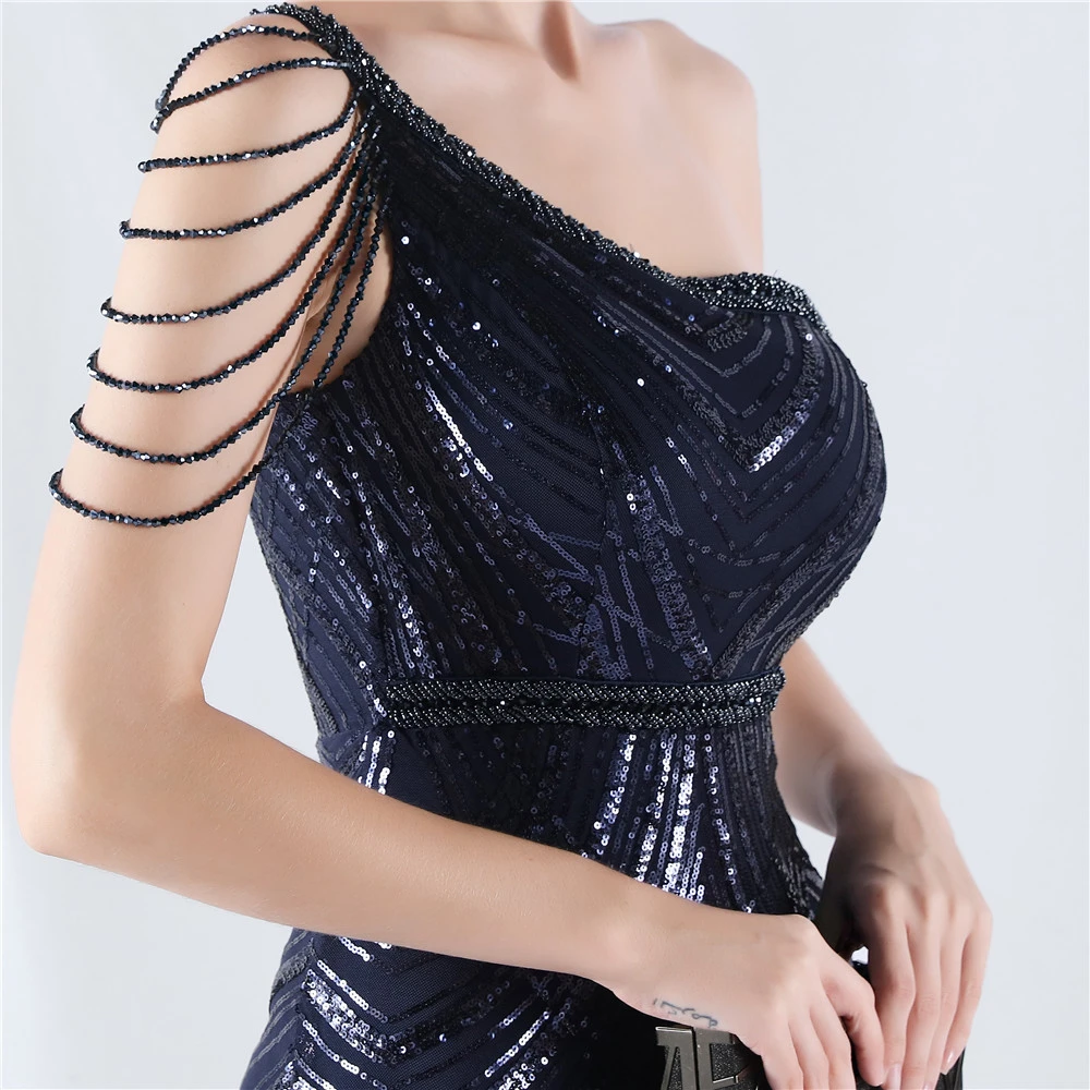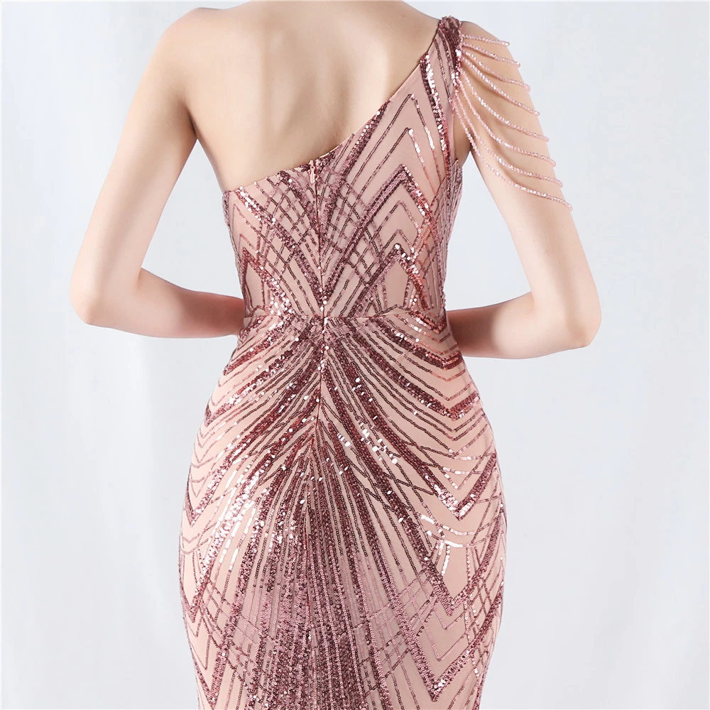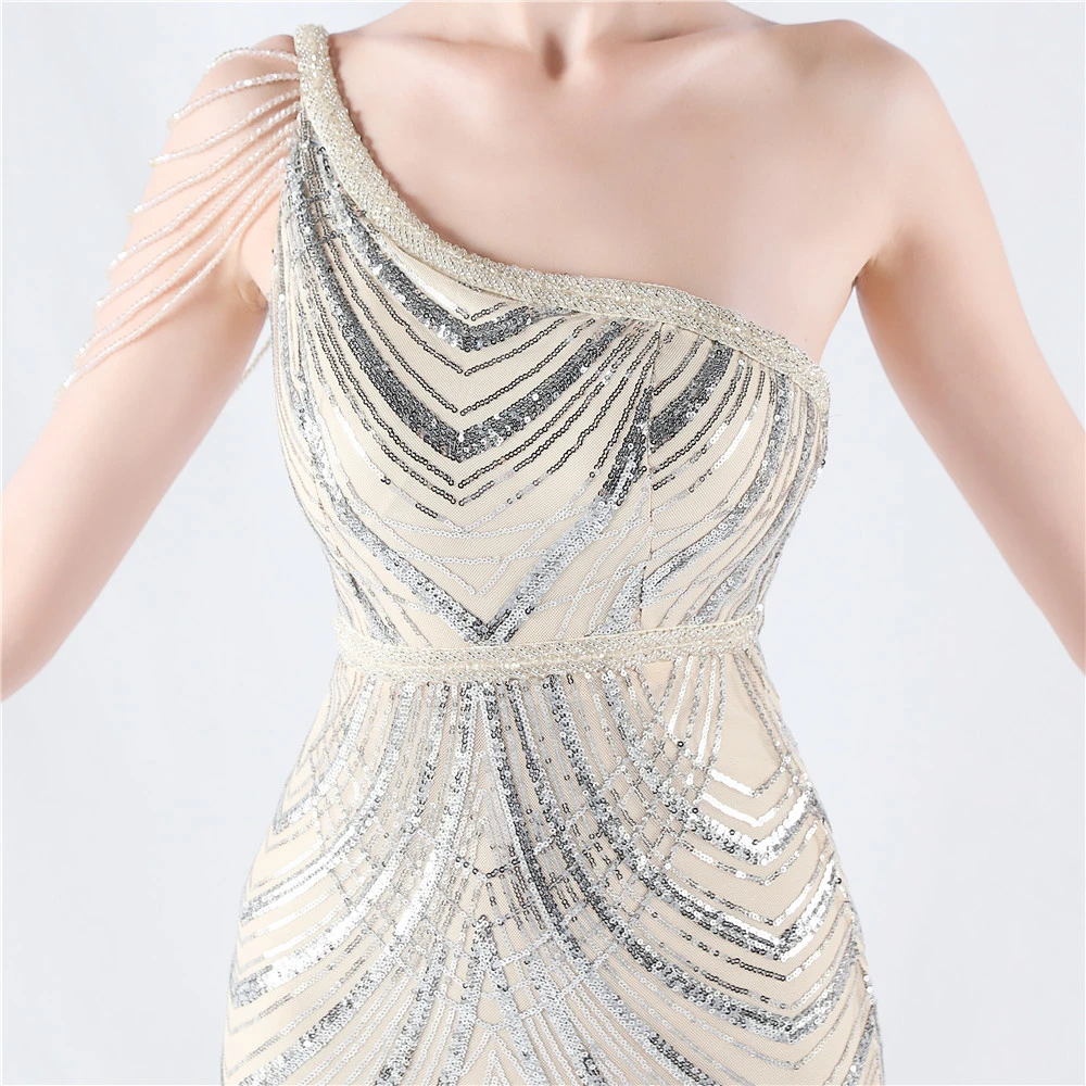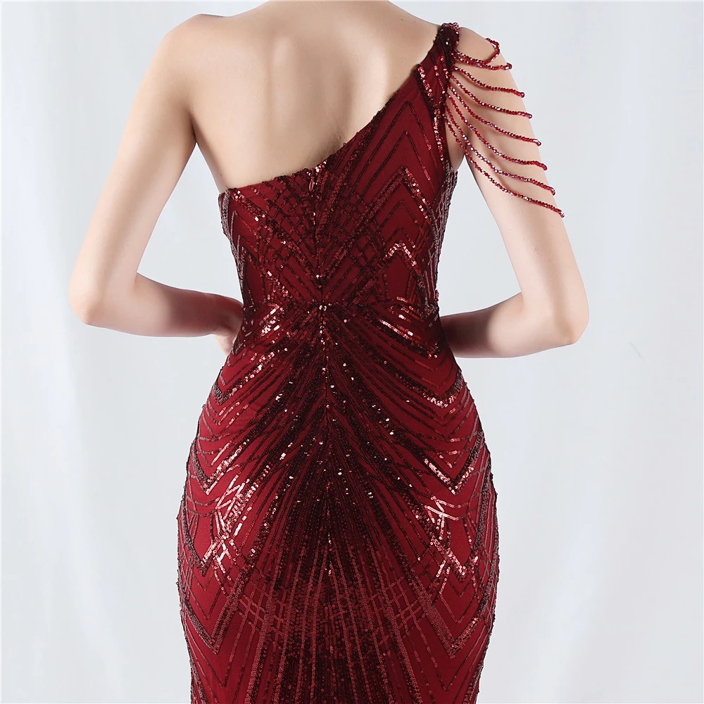 Positioning Flower Beaded Craft Beaded One-Shoulder Oblique Collar High Slit Evening Dress