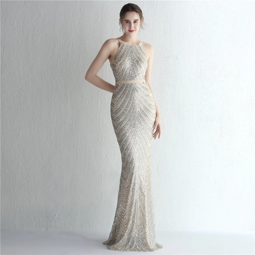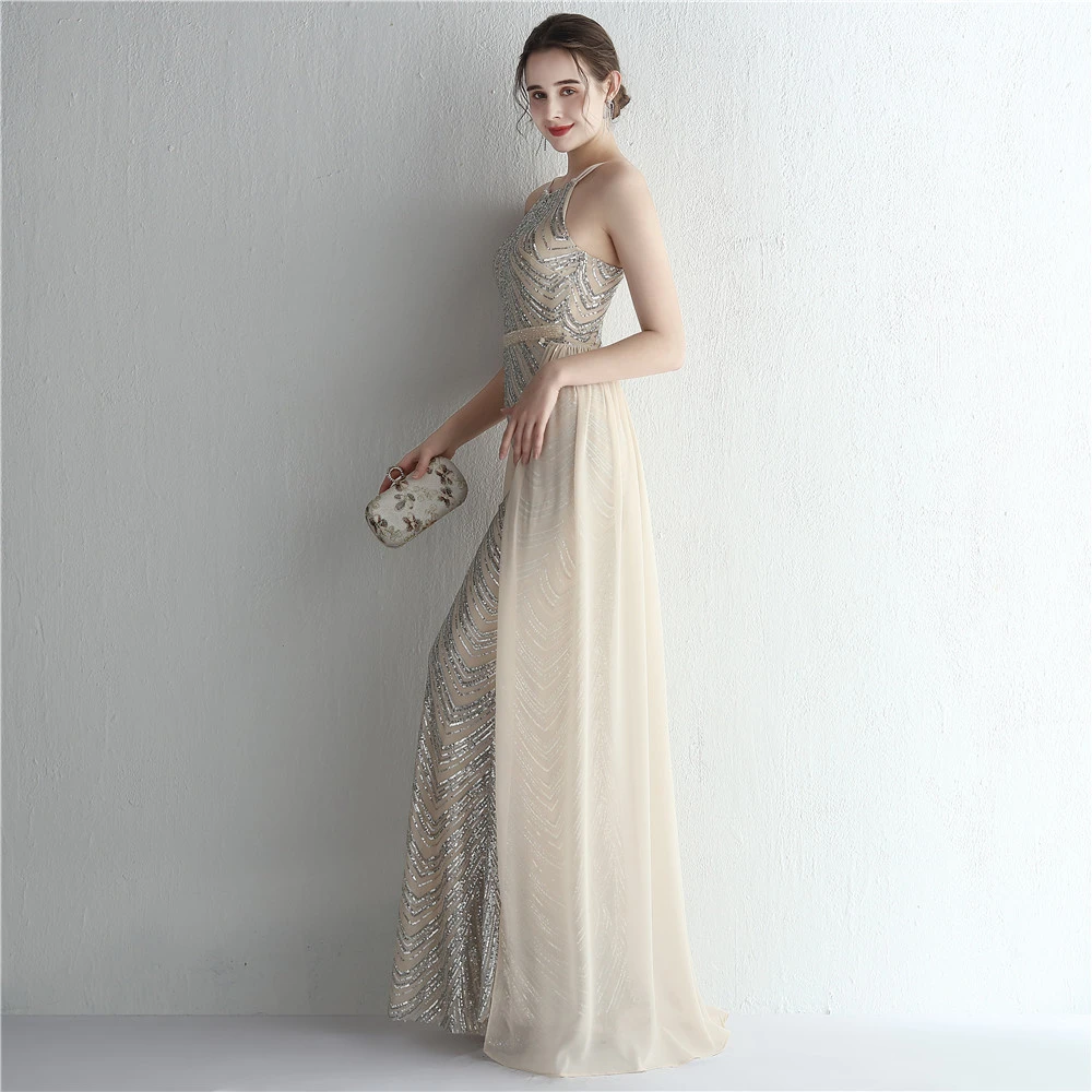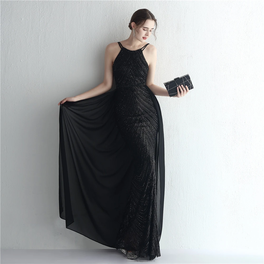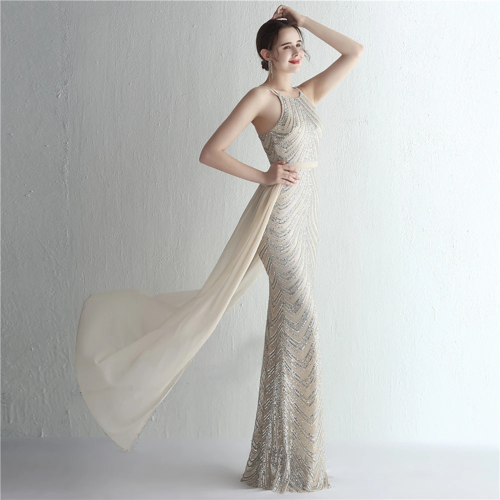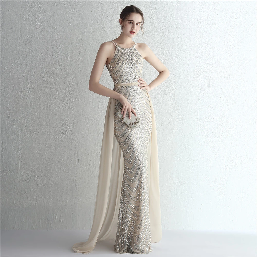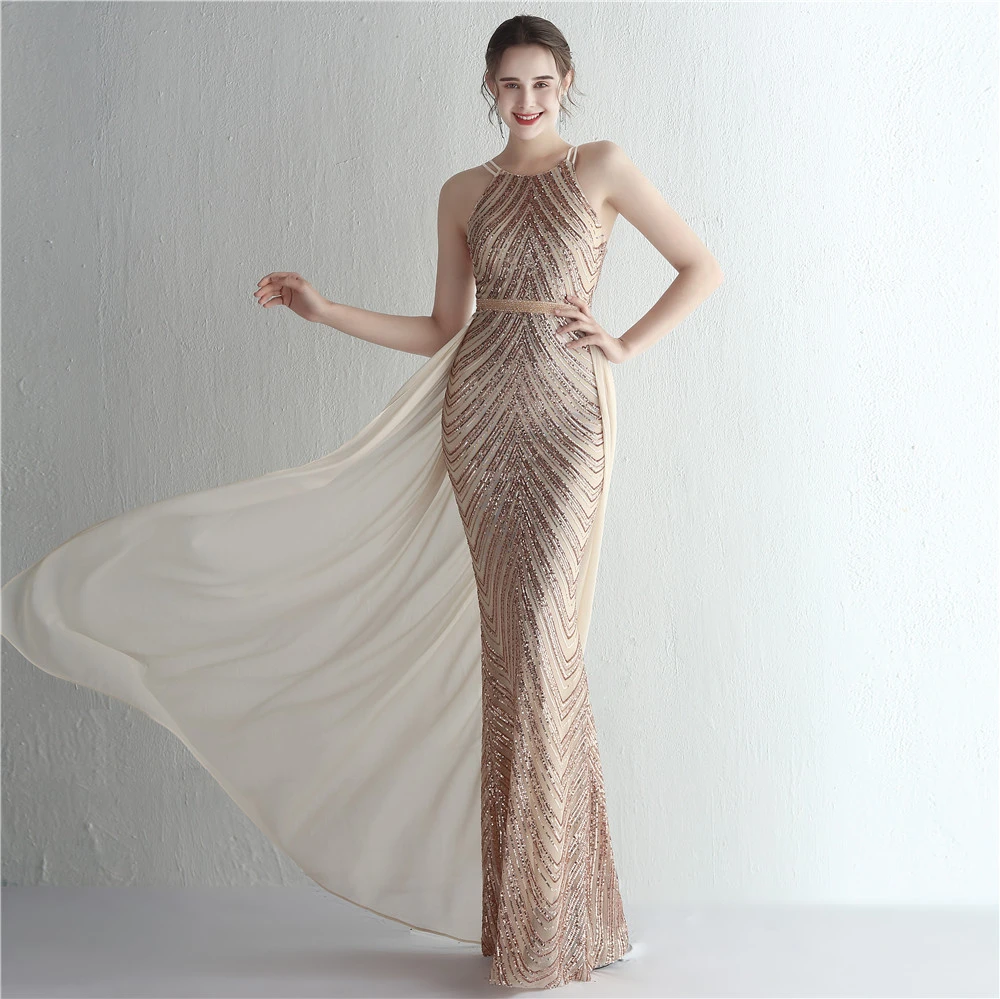 Positioning Flower Sequin Chiffon Skirt Craft Beaded Halter Neck Style Temperament Cold Celebrity Banquet Long Sequin