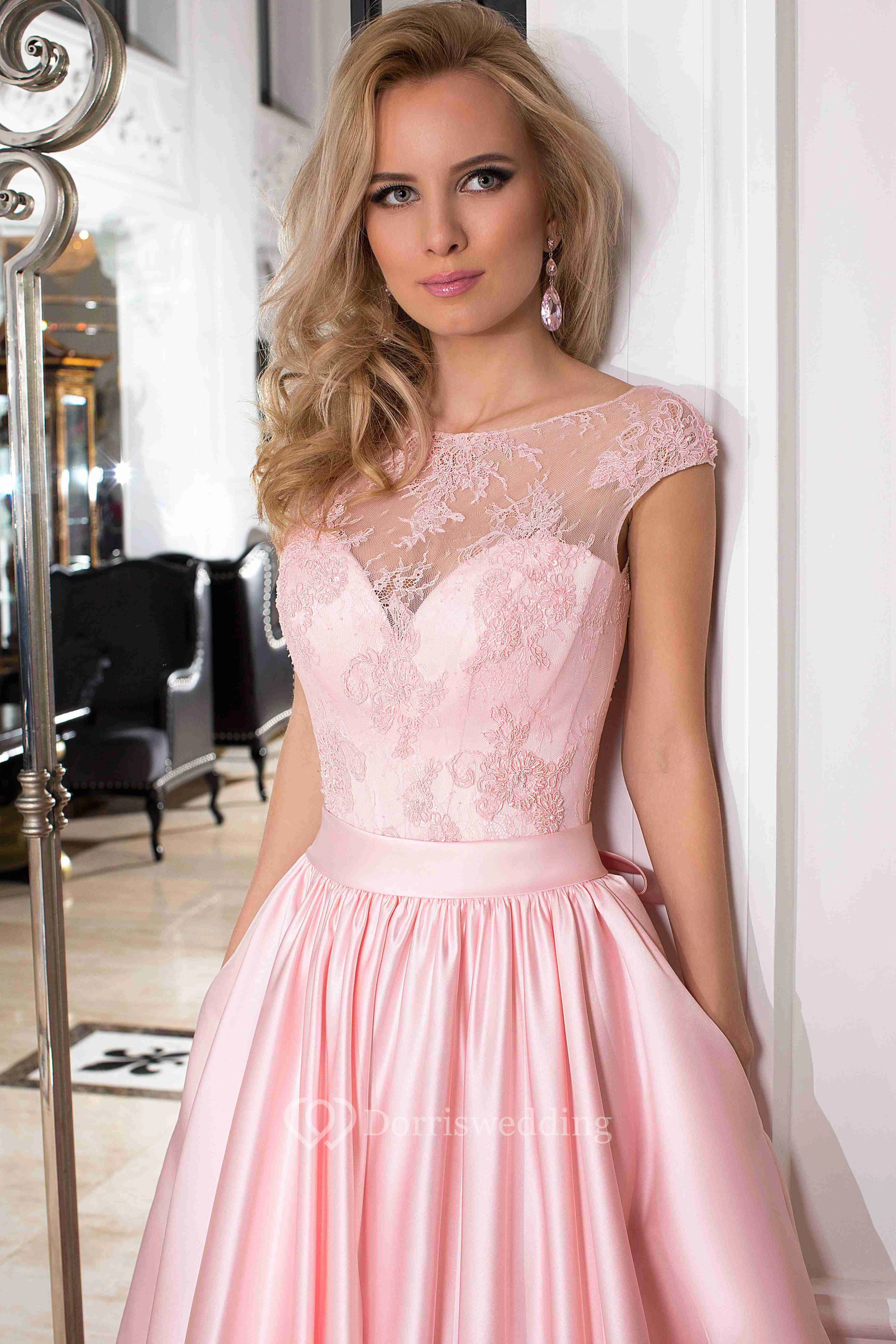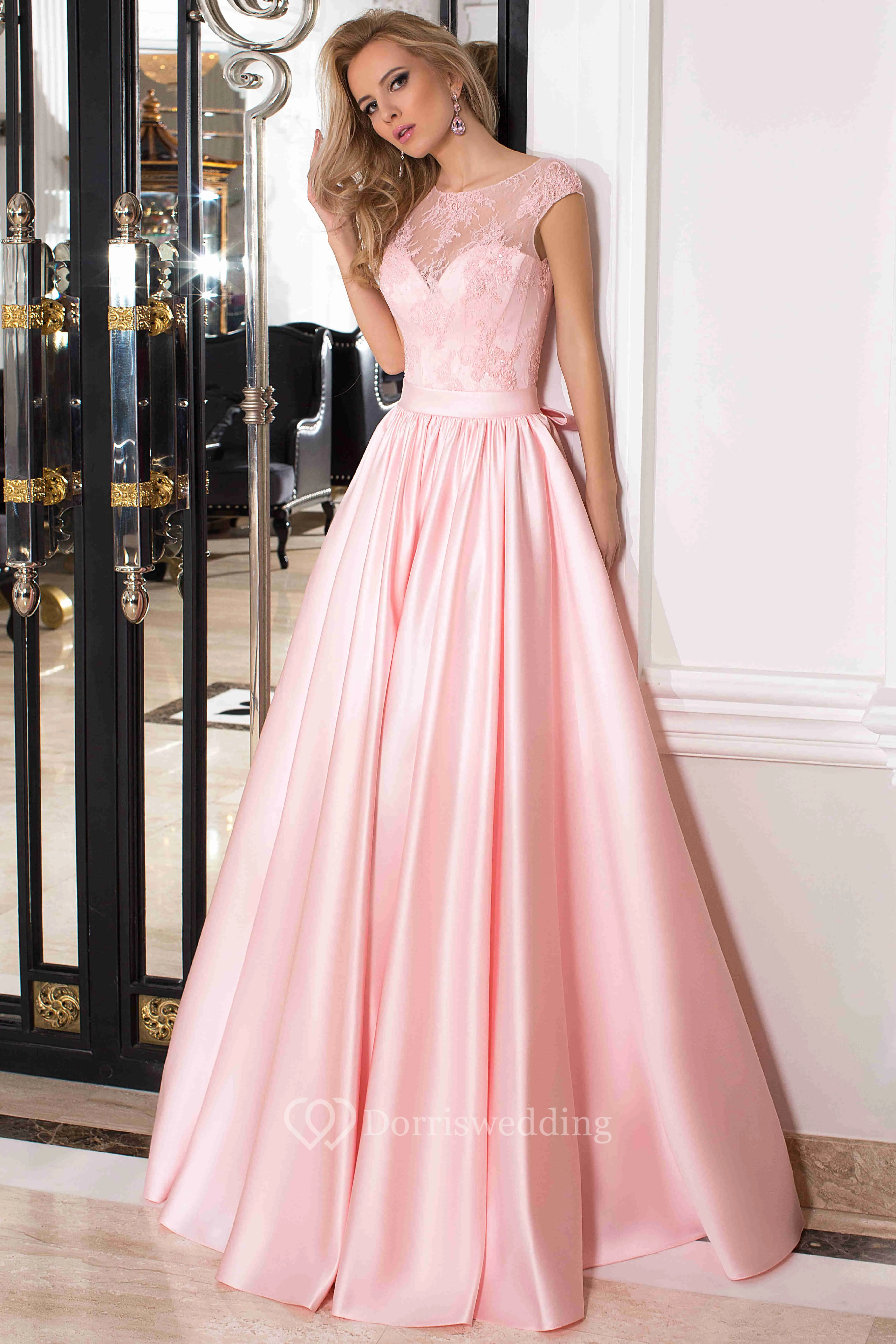 A-Line Floor-Length Scoop Cap Satin Lace Bow Lace-Up Corset Back Dress