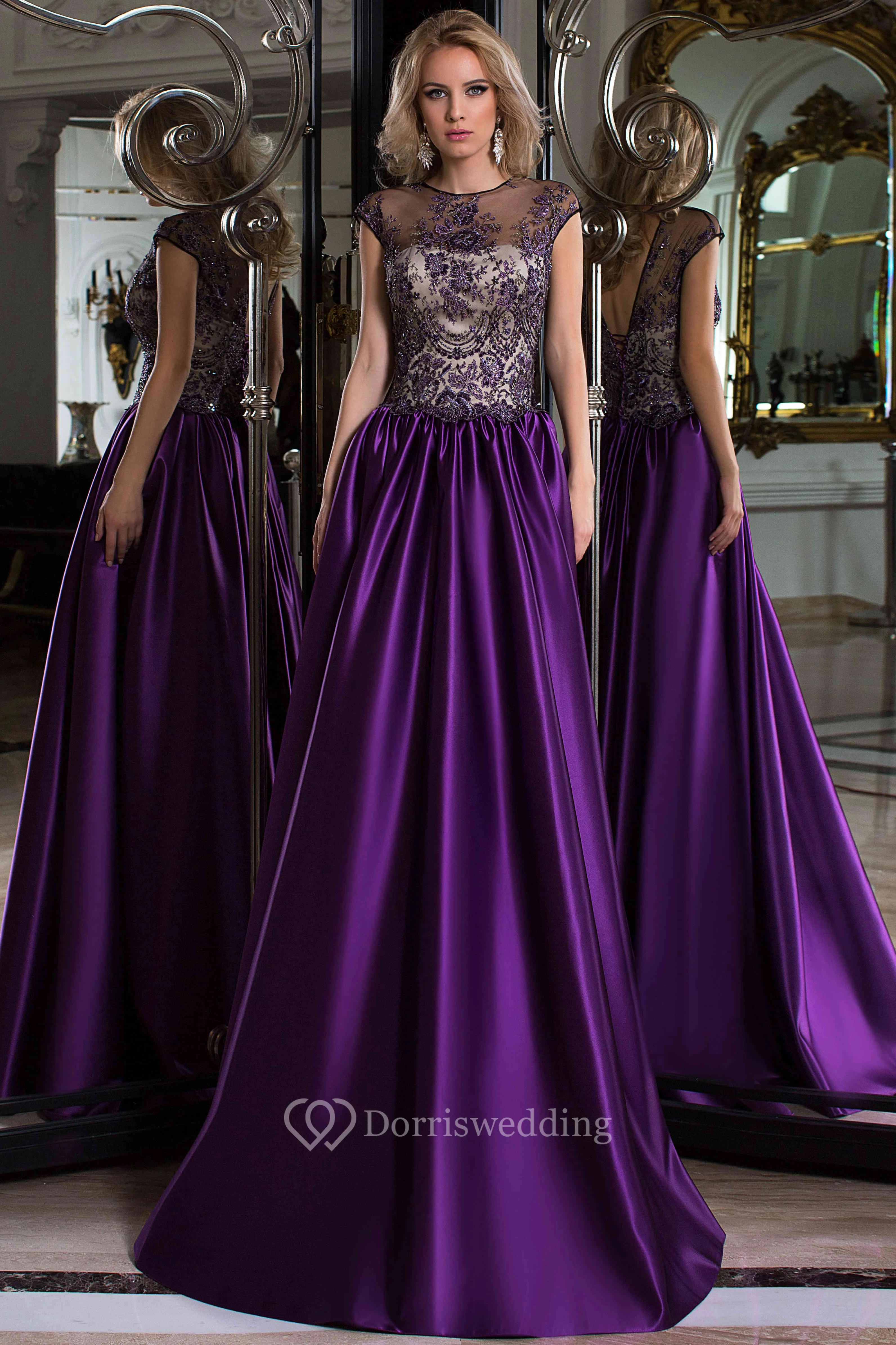 A-Line Floor-Length Jewel Cap Satin Embroidery Low-V Back Dress