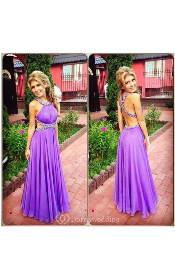 Purple A-Line Open Back Prom Gowns Criss-Cross Evening Dresses With Beadings