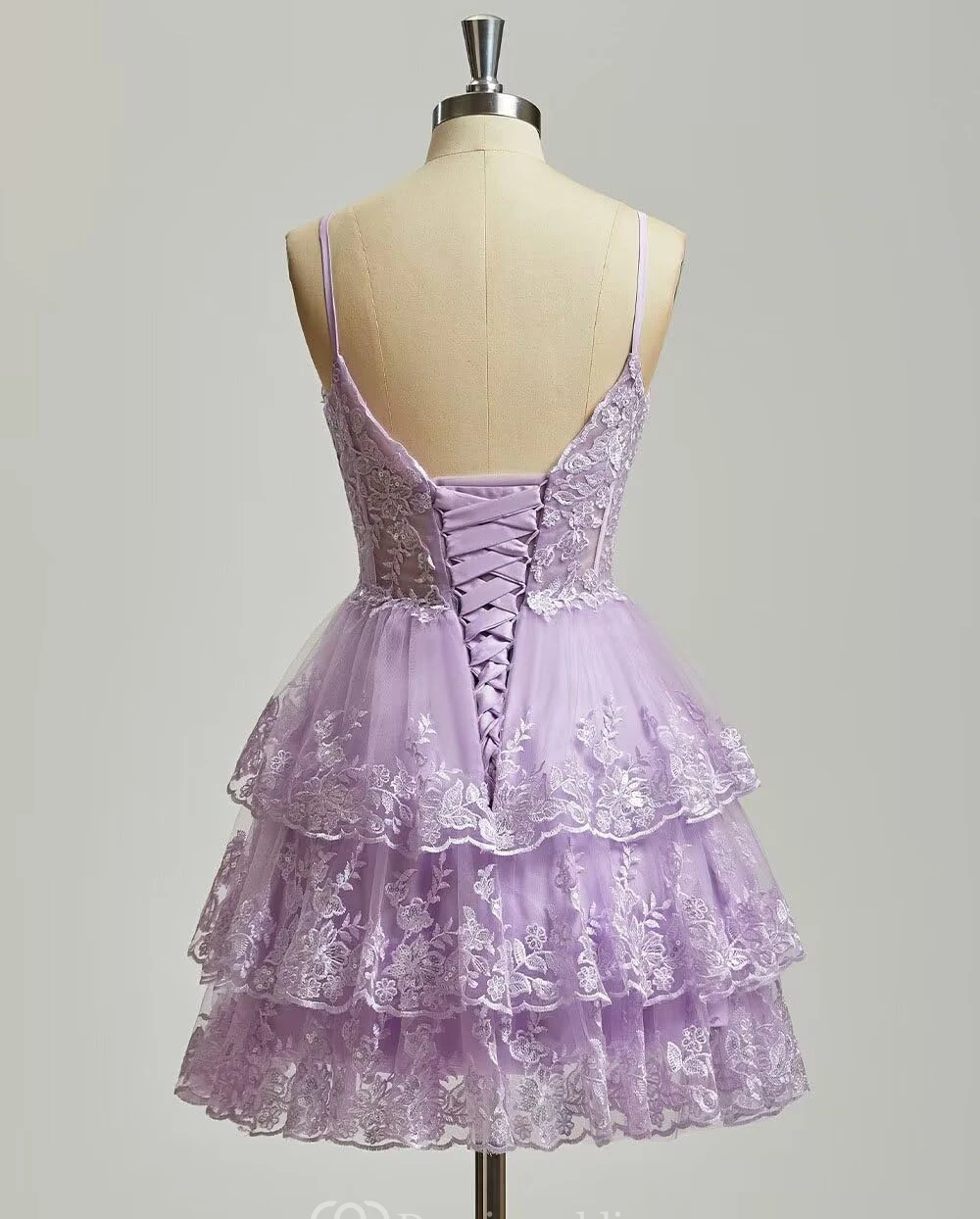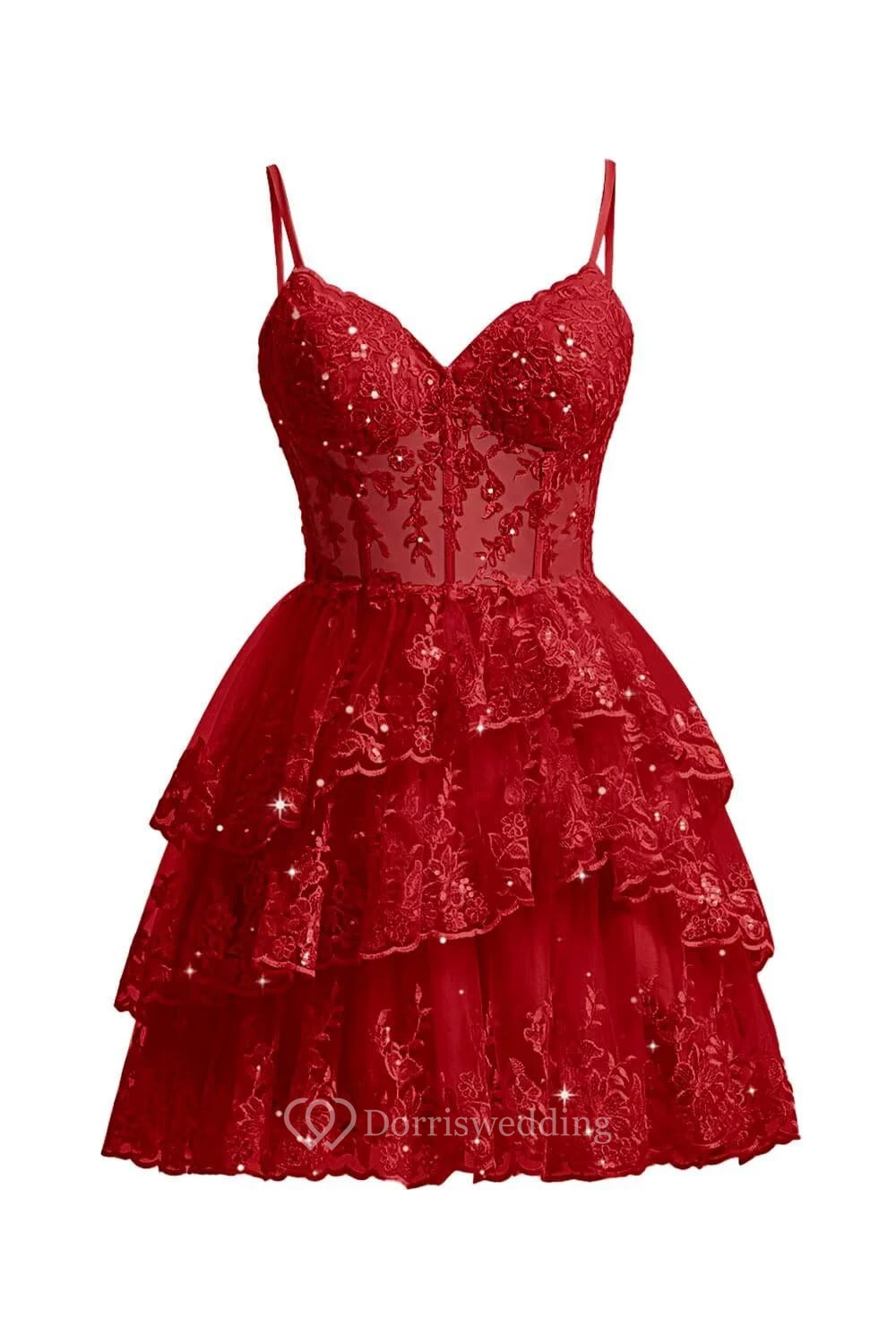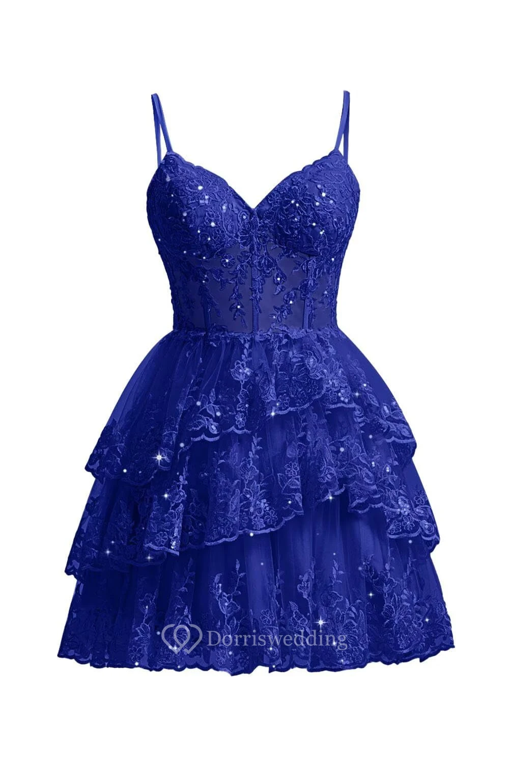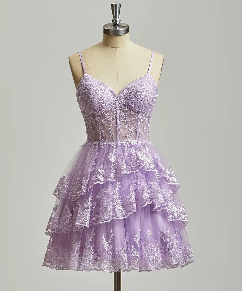 This charming purple lace dress features spaghetti straps, a sweetheart neckline, and a multi-layer ruffled skirt. The intricate lace overlay adds texture and romance, perfect for cocktails or parties. The knee-length design is both elegant and playful, ideal for special occasions.