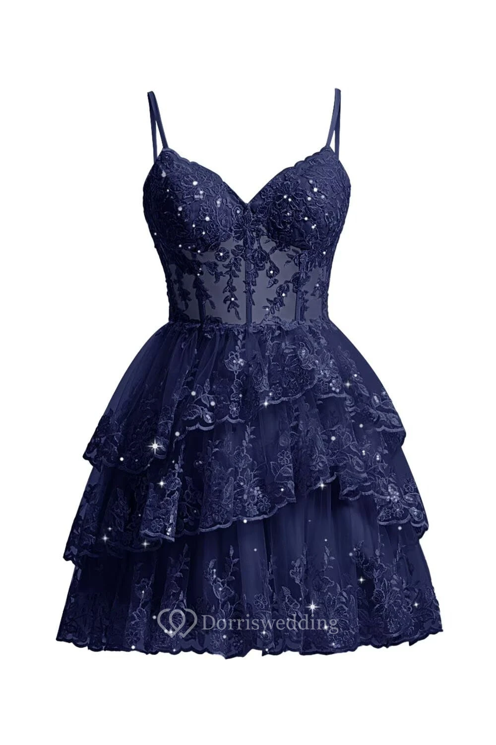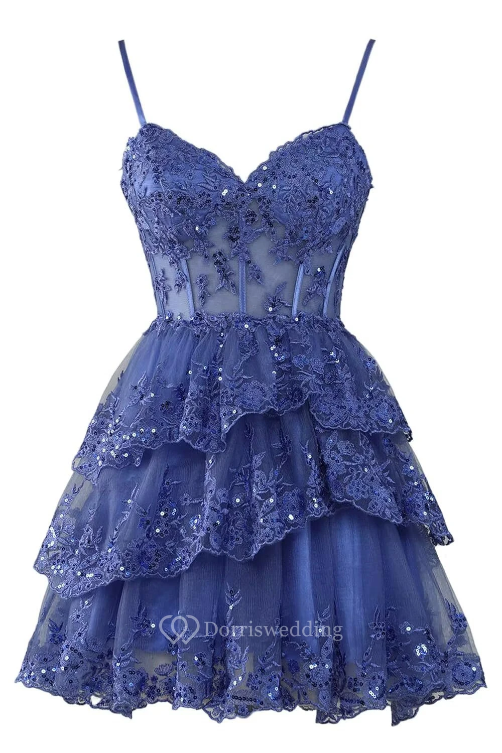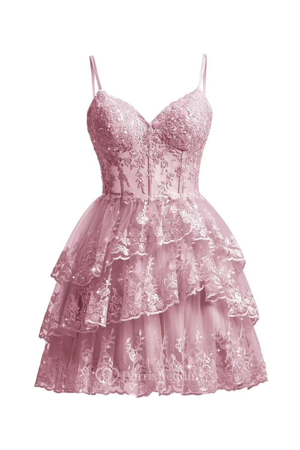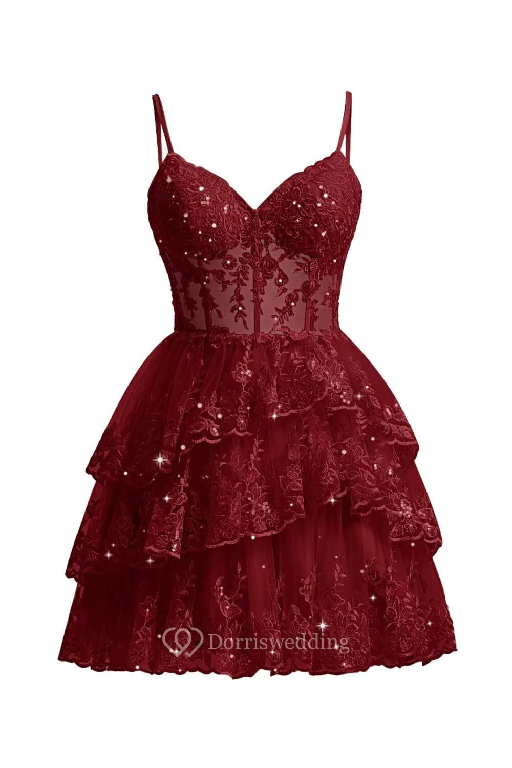 This charming purple lace dress features spaghetti straps, a sweetheart neckline, and a multi-layer ruffled skirt. The intricate lace overlay adds texture and romance, perfect for cocktails or parties. The knee-length design is both elegant and playful, ideal for special occasions.