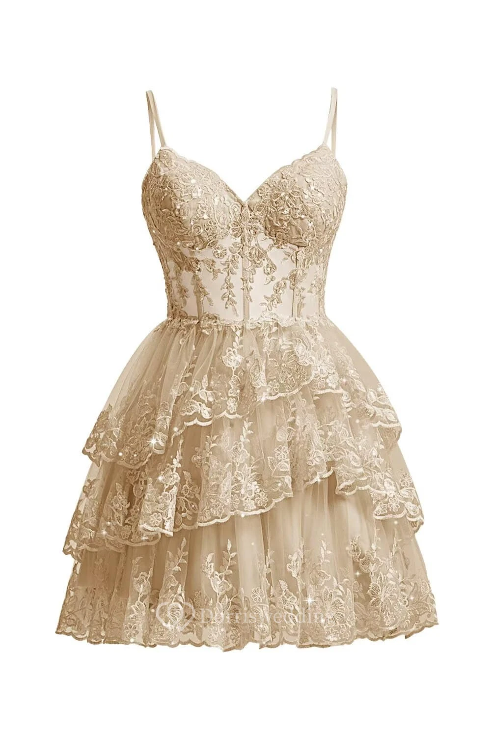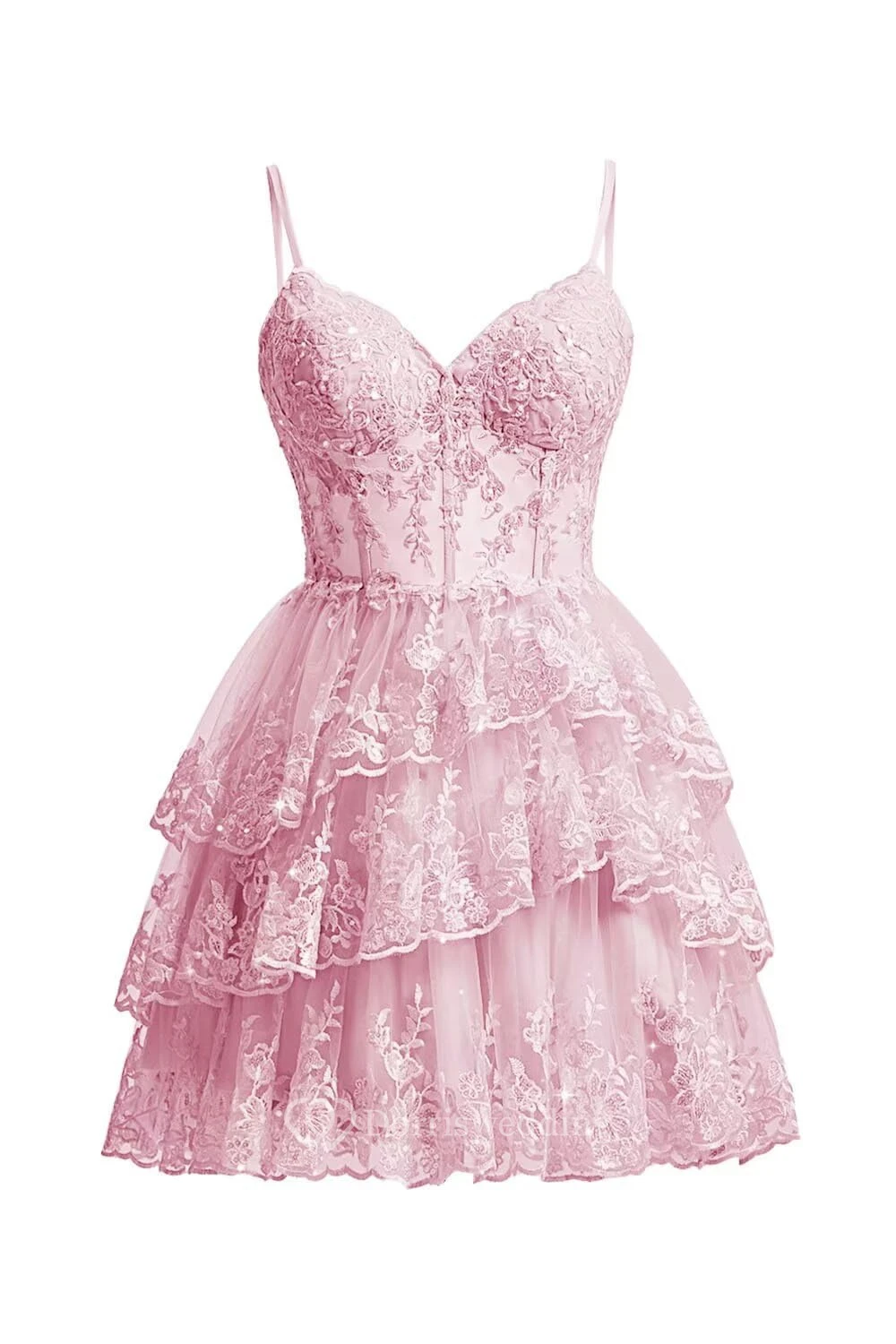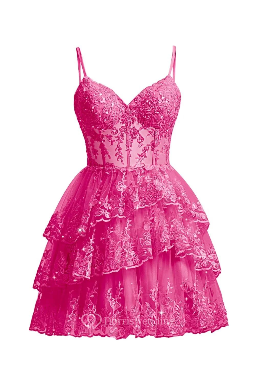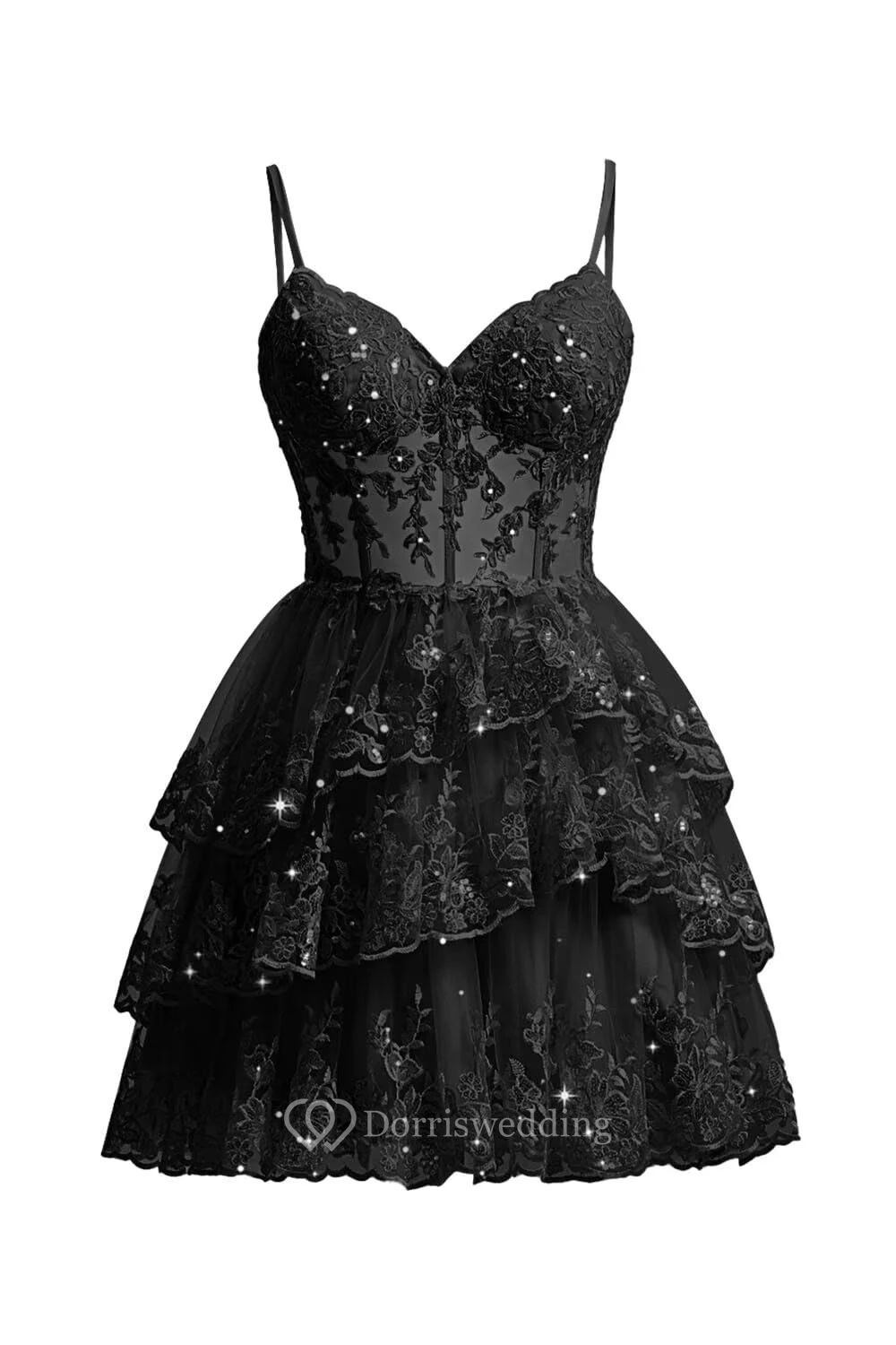 This charming purple lace dress features spaghetti straps, a sweetheart neckline, and a multi-layer ruffled skirt. The intricate lace overlay adds texture and romance, perfect for cocktails or parties. The knee-length design is both elegant and playful, ideal for special occasions.