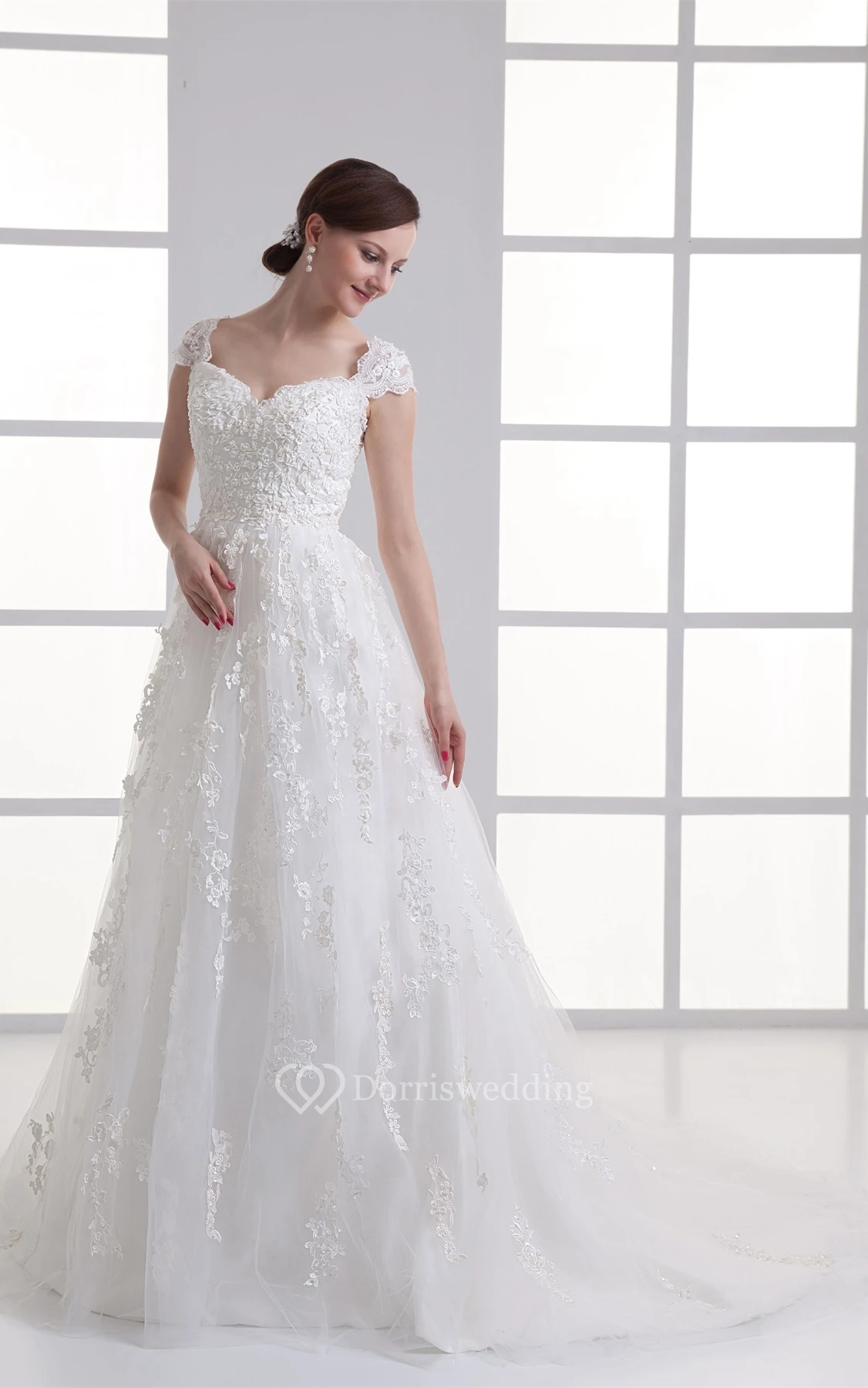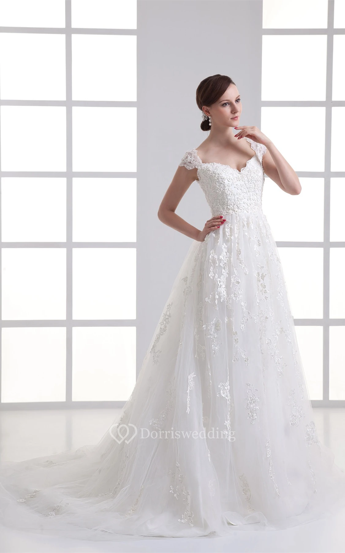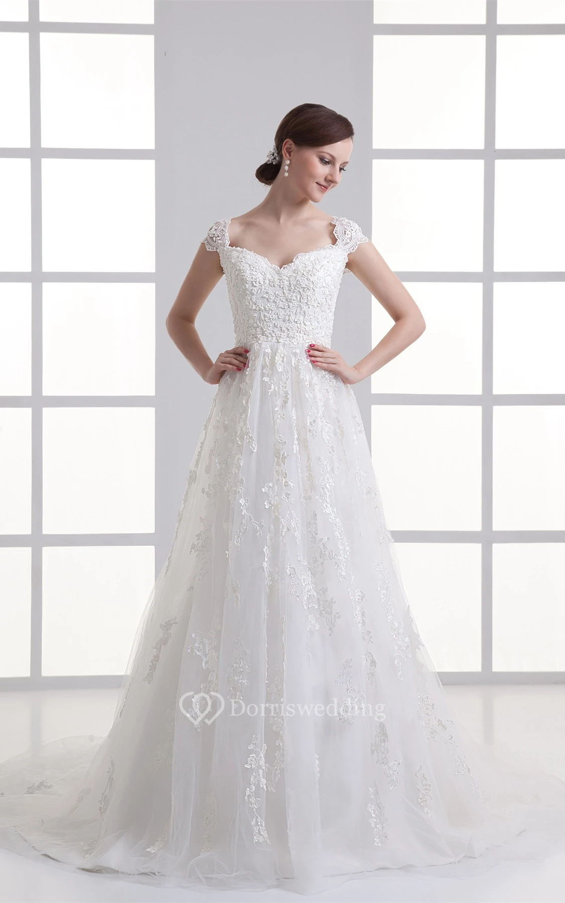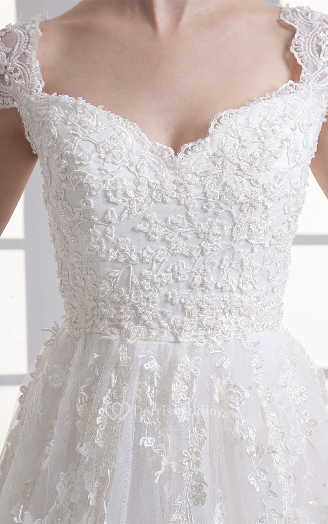 Queen-Anne A-Line Lace Dress With Tulle Overlay