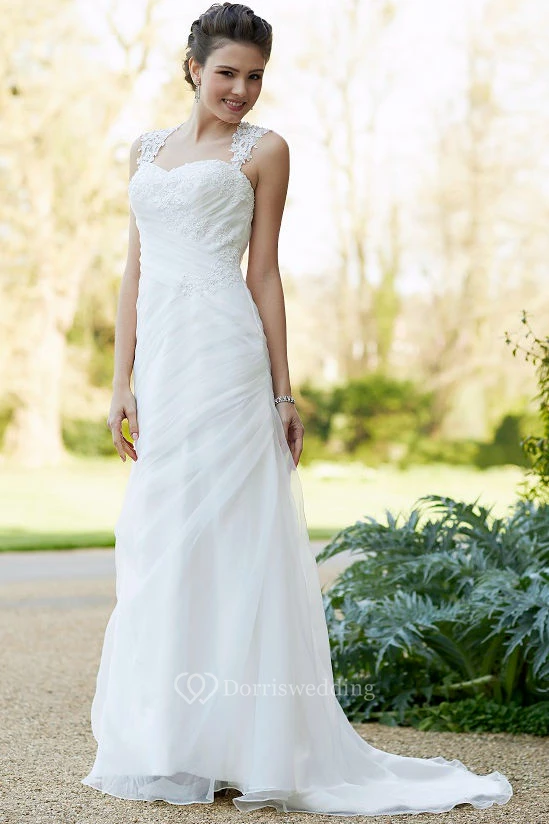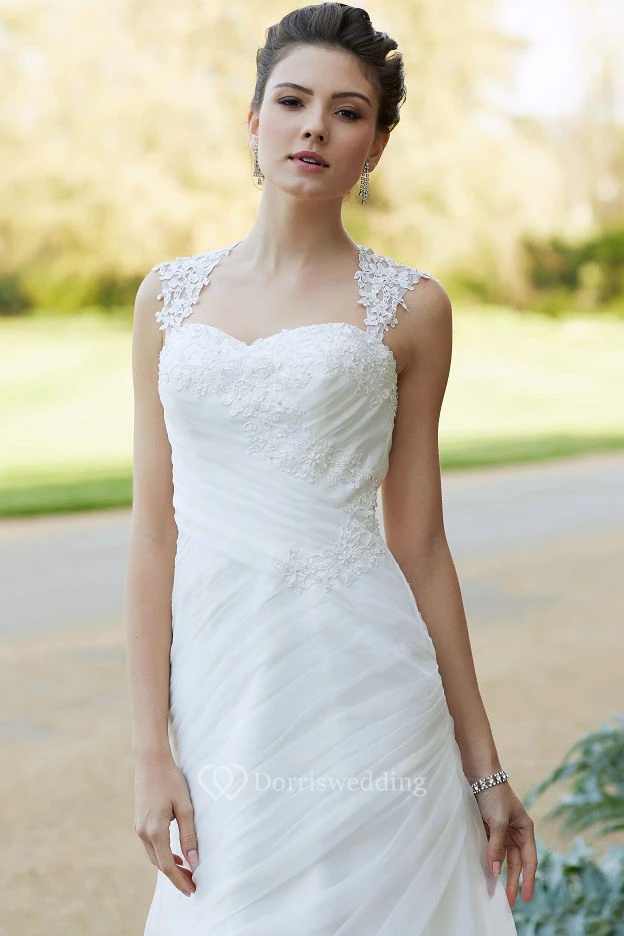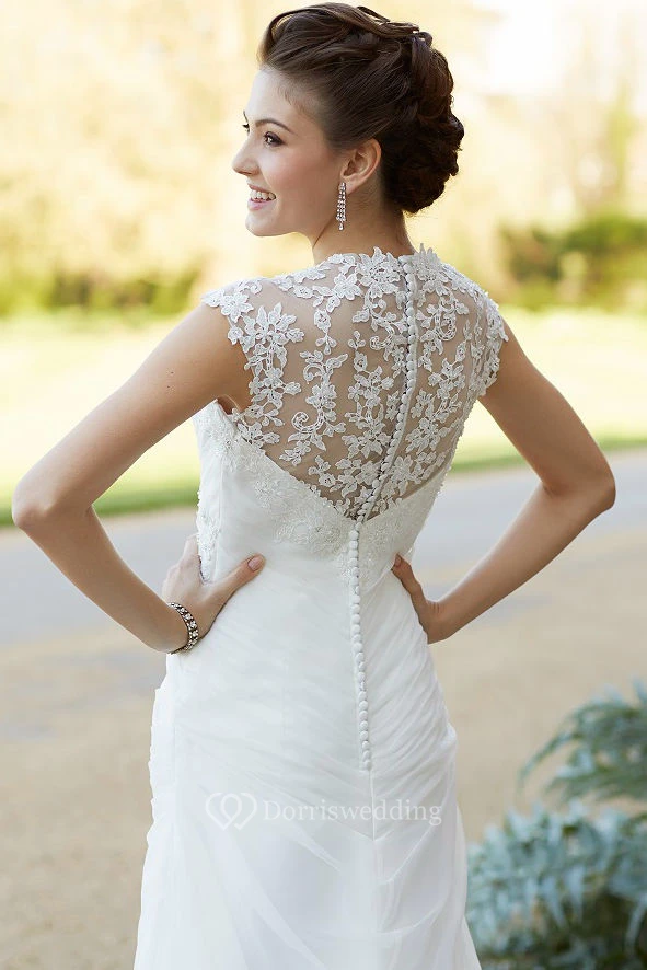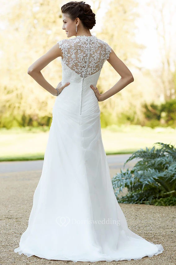 Queen Anne Maxi Ruched Chiffon Wedding Dress With Appliques And Illusion
