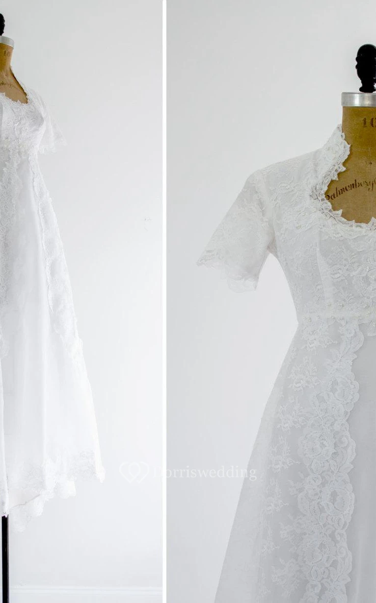 Queen Anne Neckline Short Sleeve A-Line Lace Dress With Beadings