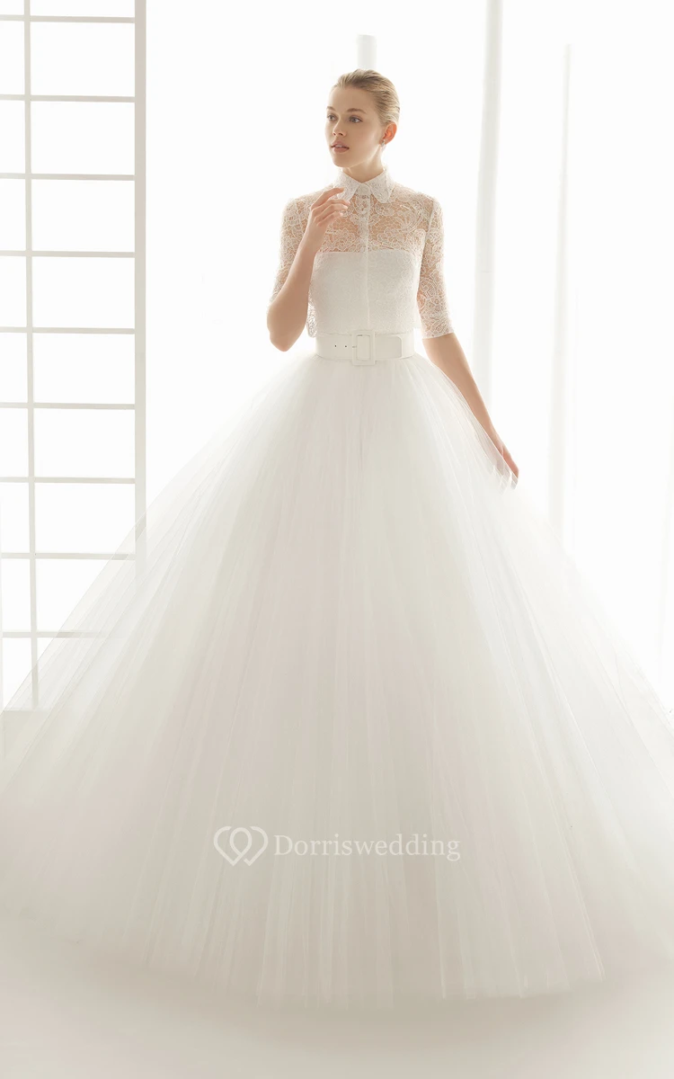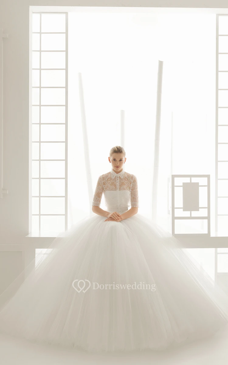 Raffled Lace Half Illusion Sleeve Gown With Mandarin Collar