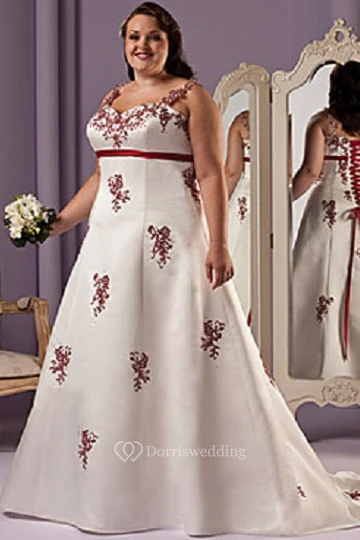 Red Appliqued A-Line Satin Bridal Gown With Lace Up And Sash